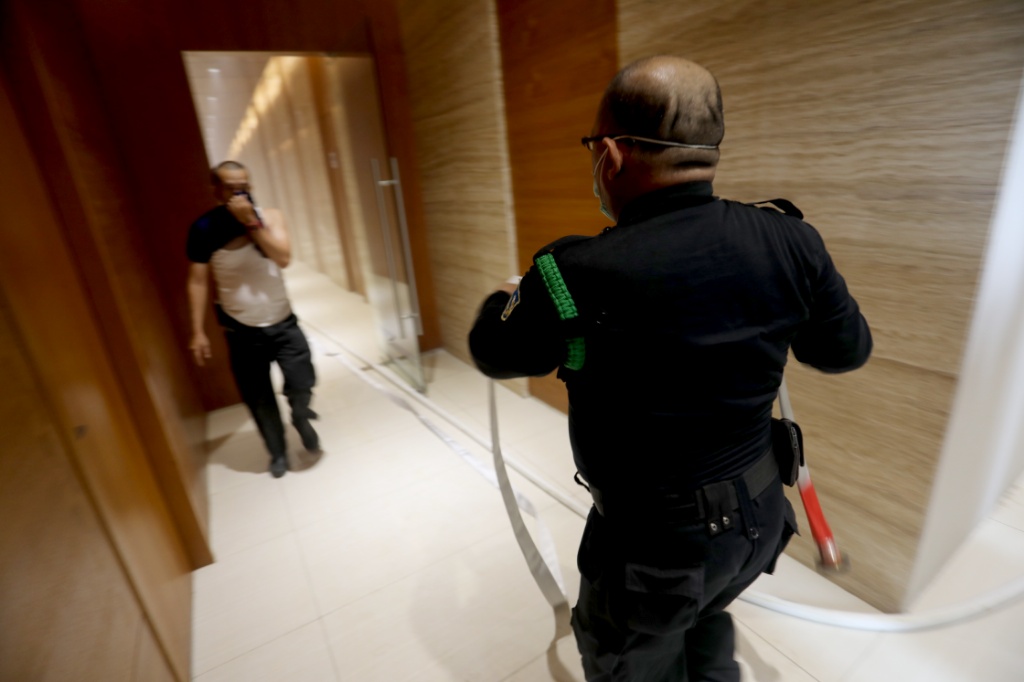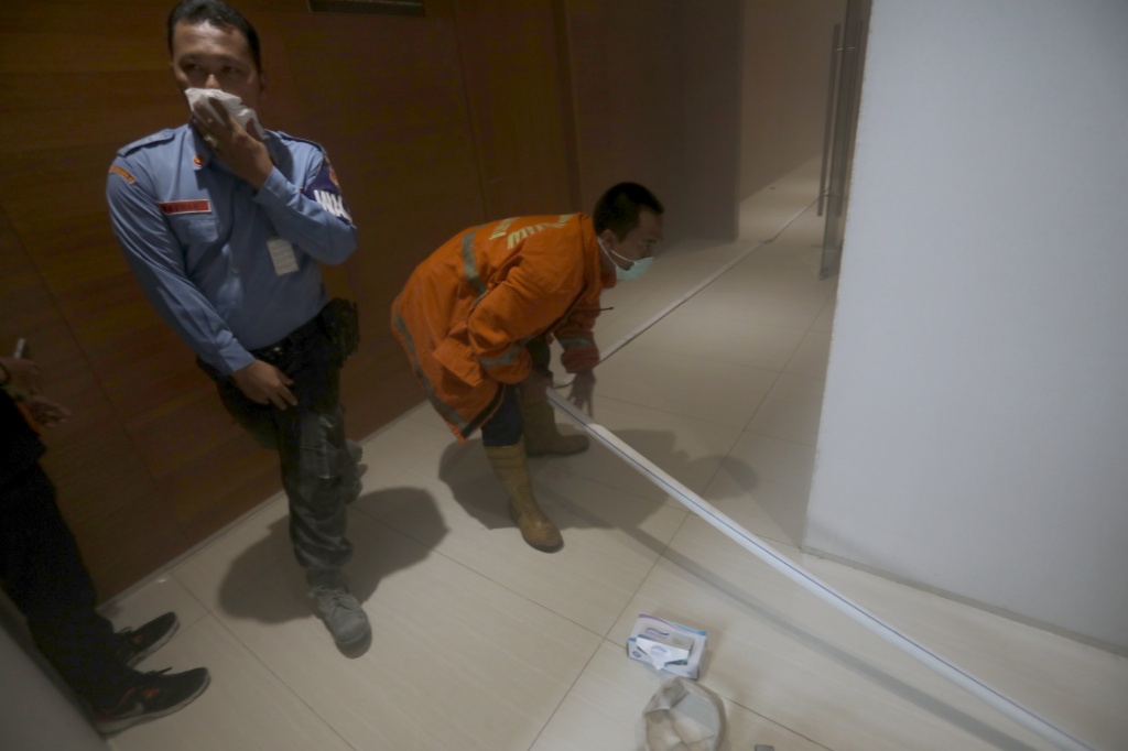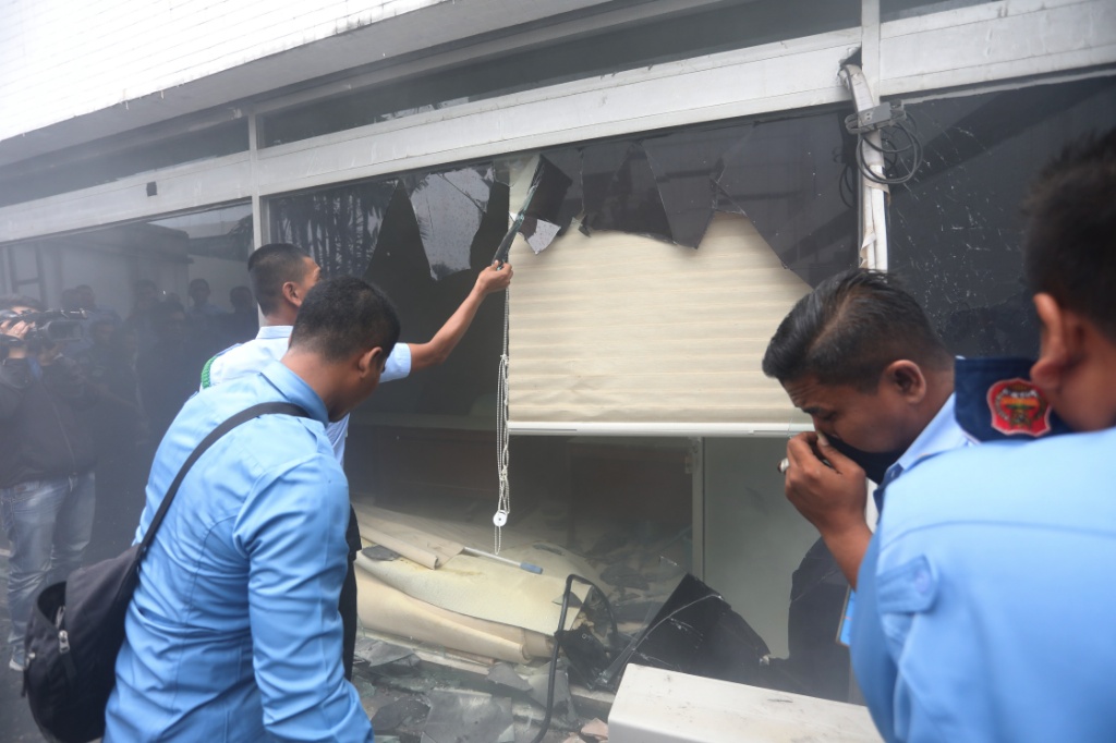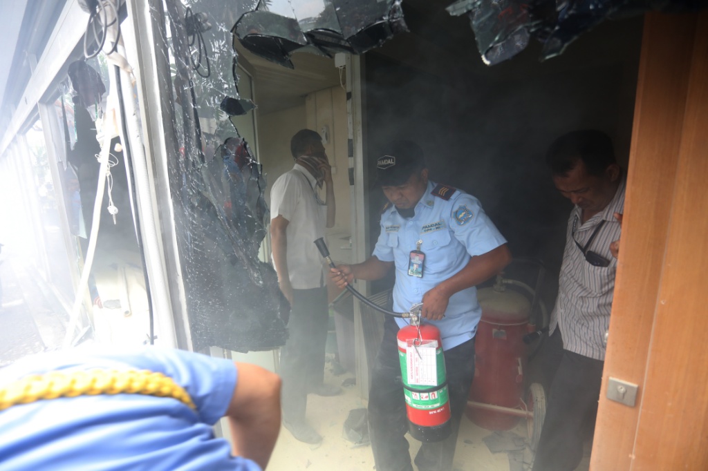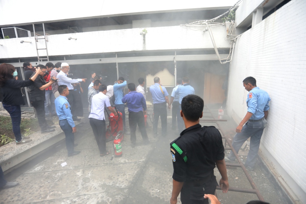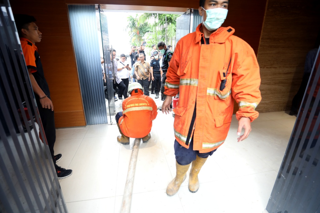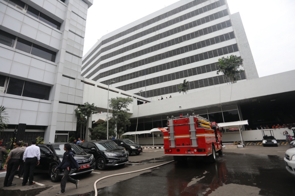 Petugas pemadam kebakaran (Damkar) need an pengamanan dalam (Pamdal) saat berusaha memadamkan api saat kebakaran di ruang Air Handling Unit (AHU) di Gedung Nusantara III, DPR/MPR, Senayan, Jakarta, Selasa (14/11). Petugas pemadam kebakaran berhasil memadamkan api sehingga tidak meluas ke ruang lain di lantai 2 dan belum diketahui penyebab kebakaran. Sebanyak 3 mobil damkar diterjunkan dalam kejadian kebakaran ruang AHU DPR tersebut. AKTUAL/Tino Oktaviano