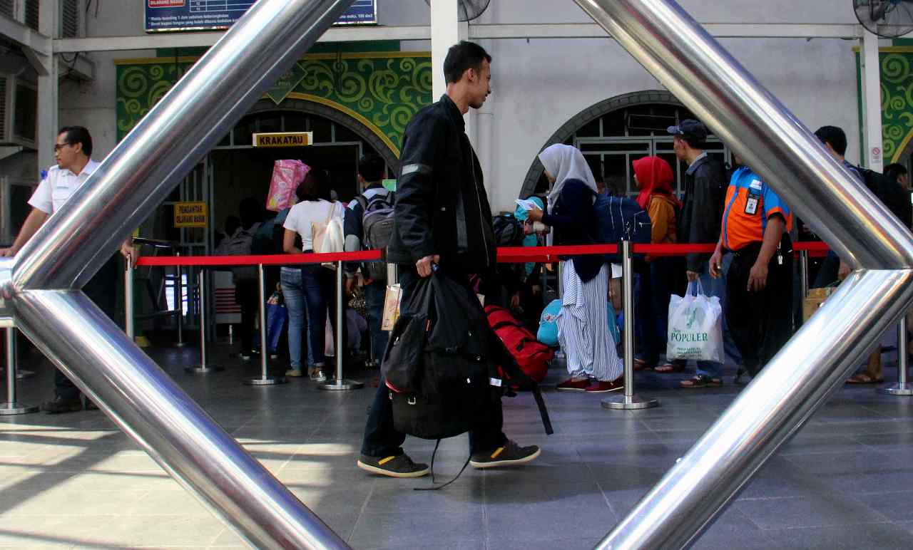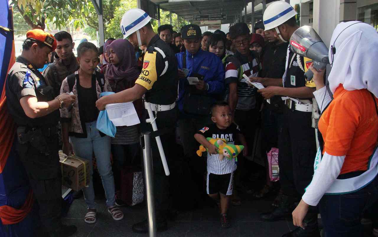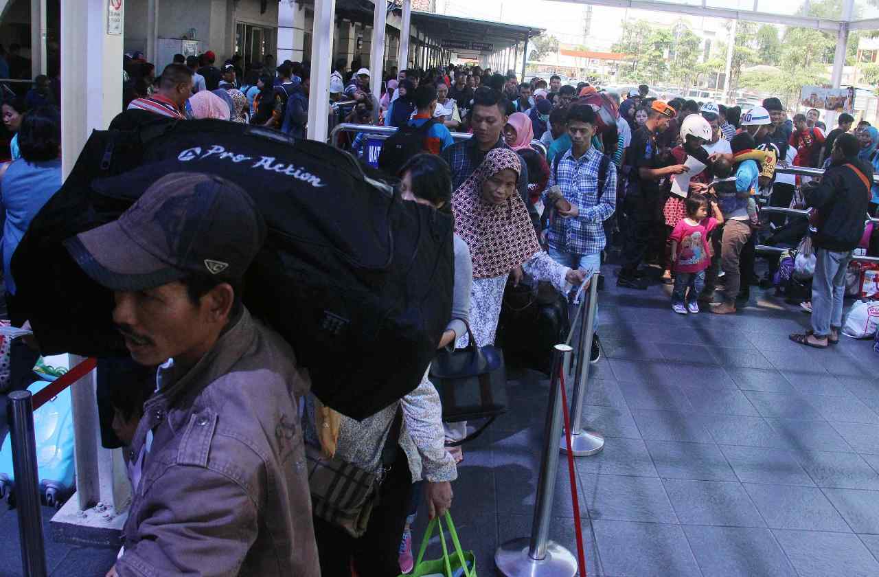 Petugas PKD memeriksa tiket calon penumpang kereta api yang antre memasuki peron di Stasiun Pasar Senen, Jakarta, Senin (4/7/2016). PT Kereta Api Indonesia (KAI) memprediksi peningkatan penumpang akan terus meningkat hingga H-2 yang merupakan peak season arus mudik 2016 dan Stasiun Pasar Senen telah memberangkatkan 8.150 pemudik dari 26 kereta api reguler serta 7 kereta api tambahan yang disediakan PT KAI dan berangkat dari stasiun yang terletak di kawasan Senen.