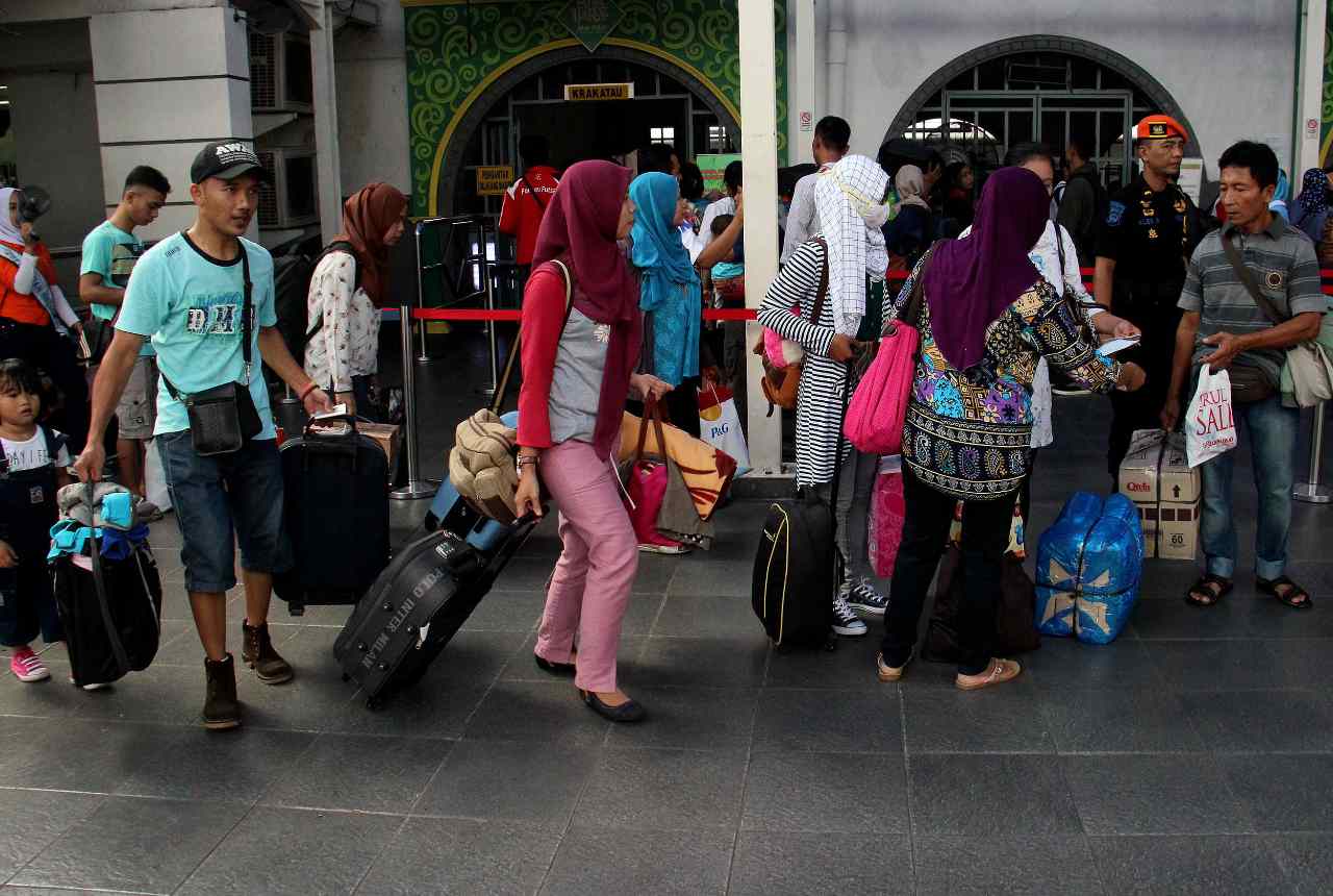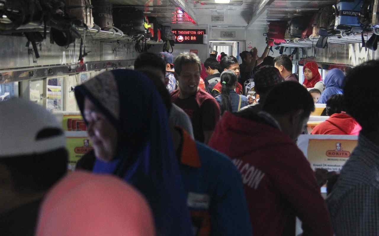 Para penumpang merapikan barang bawaanya saat naik kereta api di Stasiun Pasar Senen, Jakarta, Minggu (3/7/2016). PT Kereta Api Indonesia (KAI) memprediksi peningkatan penumpang akan terus meningkat hingga H-2 yang merupakan peak season arus mudik 2016 dan Stasiun Pasar Senen telah memberangkatkan 8.150 pemudik dari 26 kereta api reguler serta 7 kereta api tambahan yang disediakan PT KAI dan berangkat dari stasiun yang terletak di kawasan Senen.