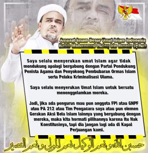 Lebih spesifik, Habib Rizieq menyatakan, ia sangat menghormati jika terdapat seorang anggota atau pengurus FPI, Gerakan Nasional Pengawal Fatwa (GNPF) Ulama, atau Persaudaraan Alumni (PA) 212, maupun tim pengacaranya, yang bergabung dengan kelompok yang telah disebutkan di atas.