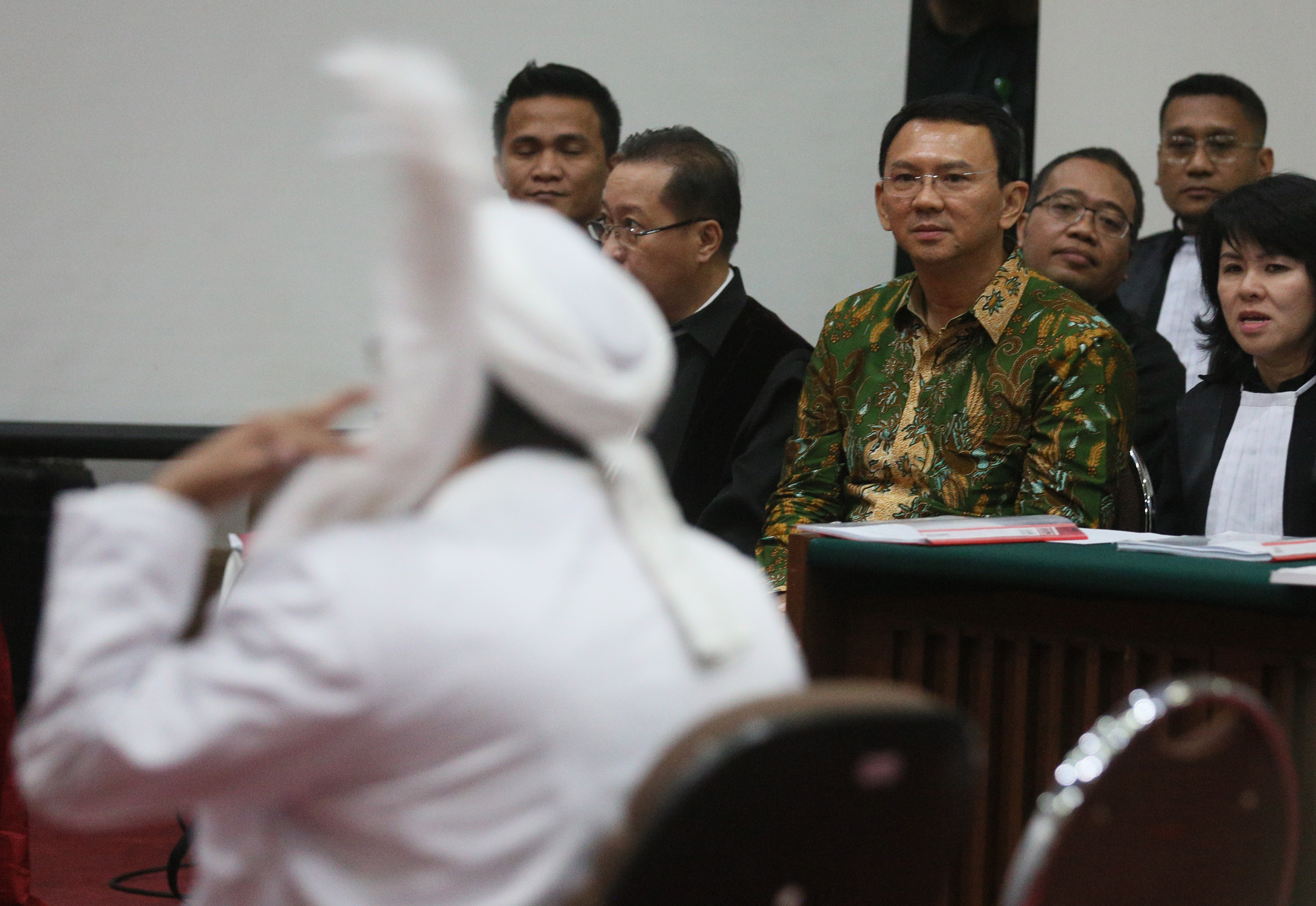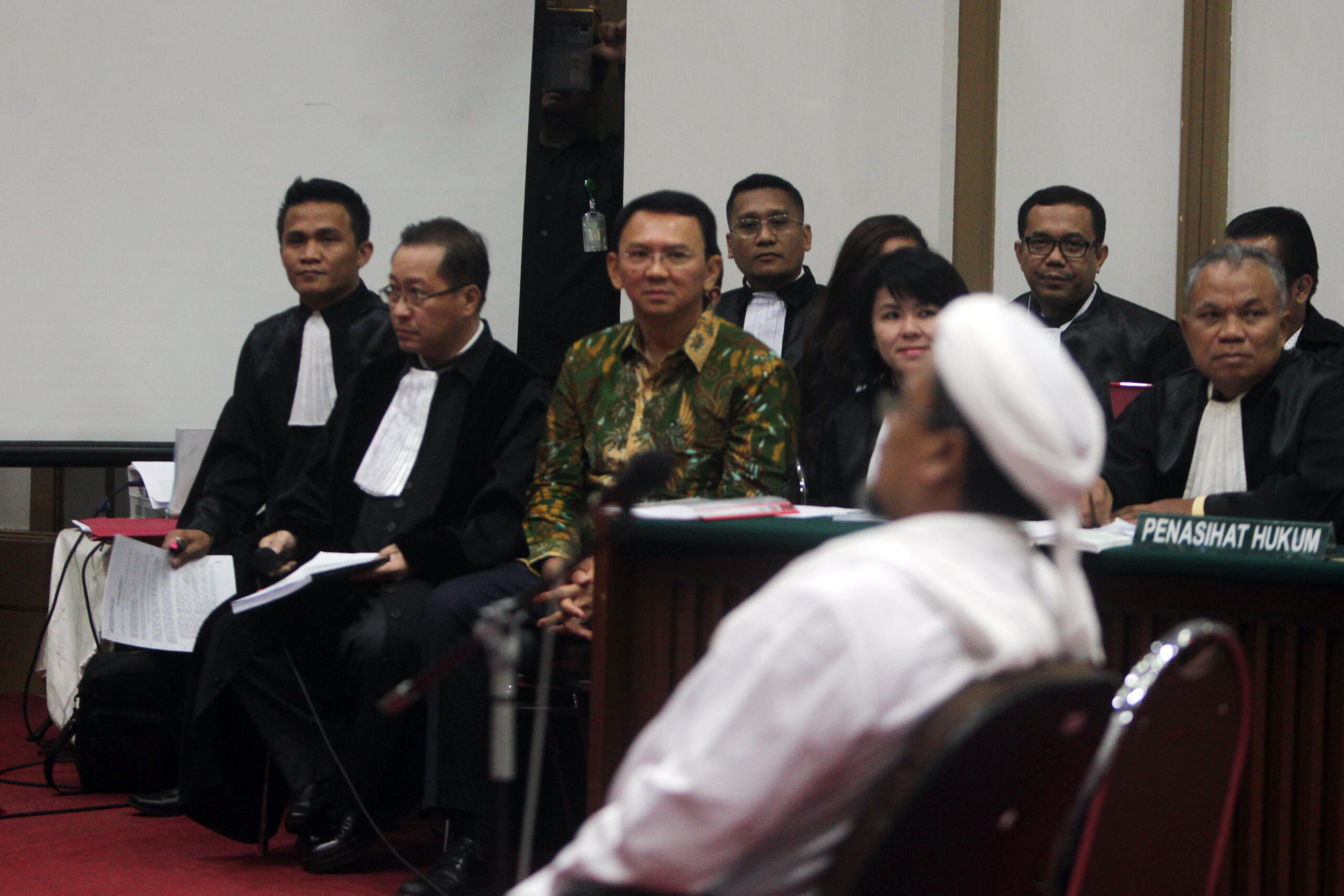 Terdakwa kasus dugaan penistaan agama Gubernur DKI Jakarta, Basuki Tjahaja Purnama memperhatikan Habib Rizieq saat menjalani sidang yang digelar oleh Pengadilan Negeri Jakarta Utara di Auditorium Kementerian Pertanian, Jakarta, Selasa (28/2). Dalam sidang tersebut, Jaksa Penuntut Umum menghadirkan dua orang saksi ahli yaitu Habib Rizieq Shihab dan Ahli Hukum Pidana Abdul Chair Ramadhan untuk memberikan keterangan terkait dugaan kasus penistaan agama. Republika-Pool/Raisan Al Farisi