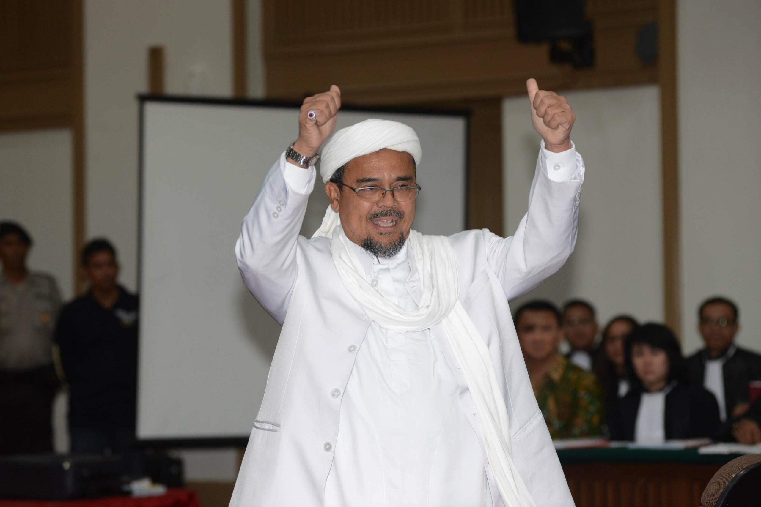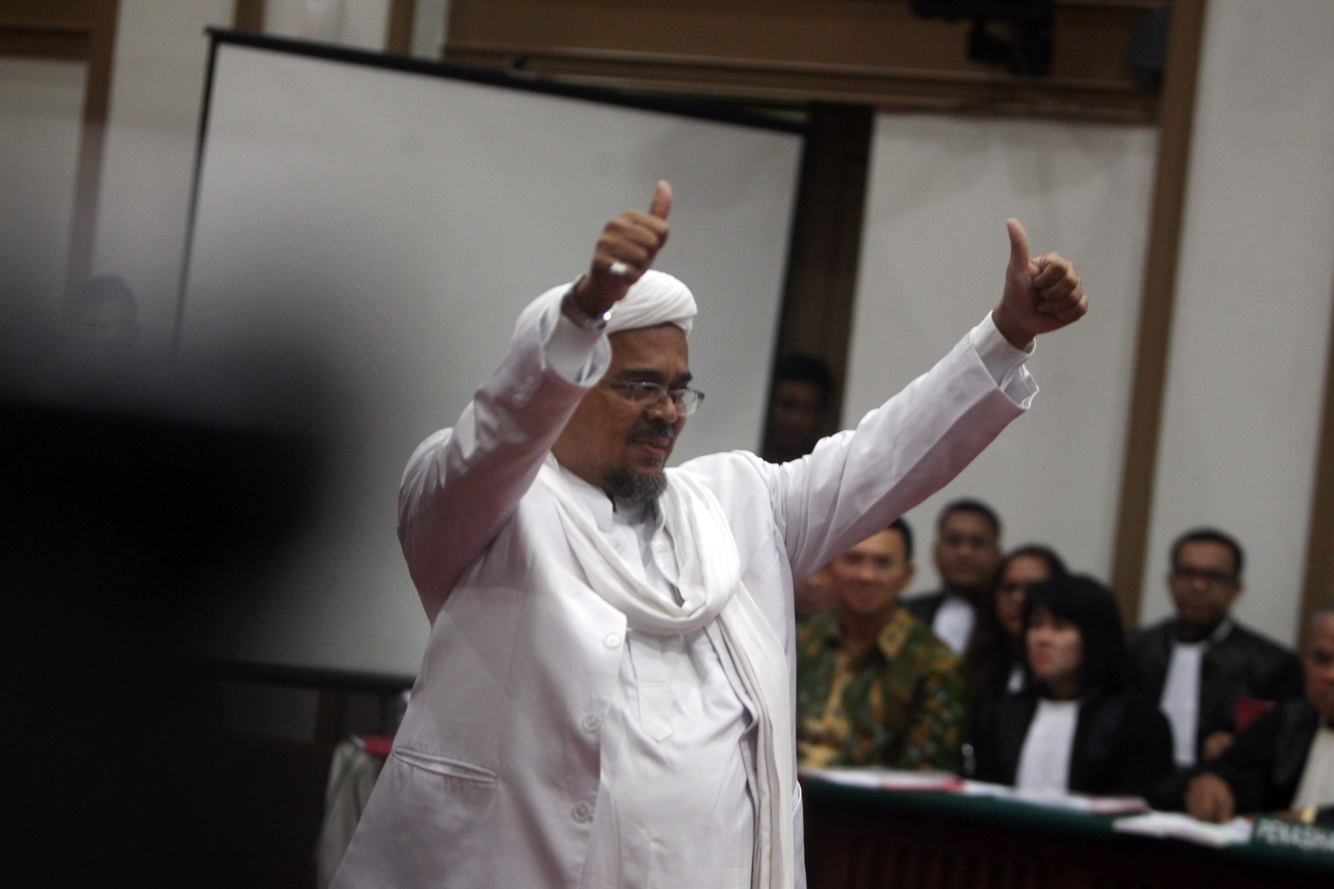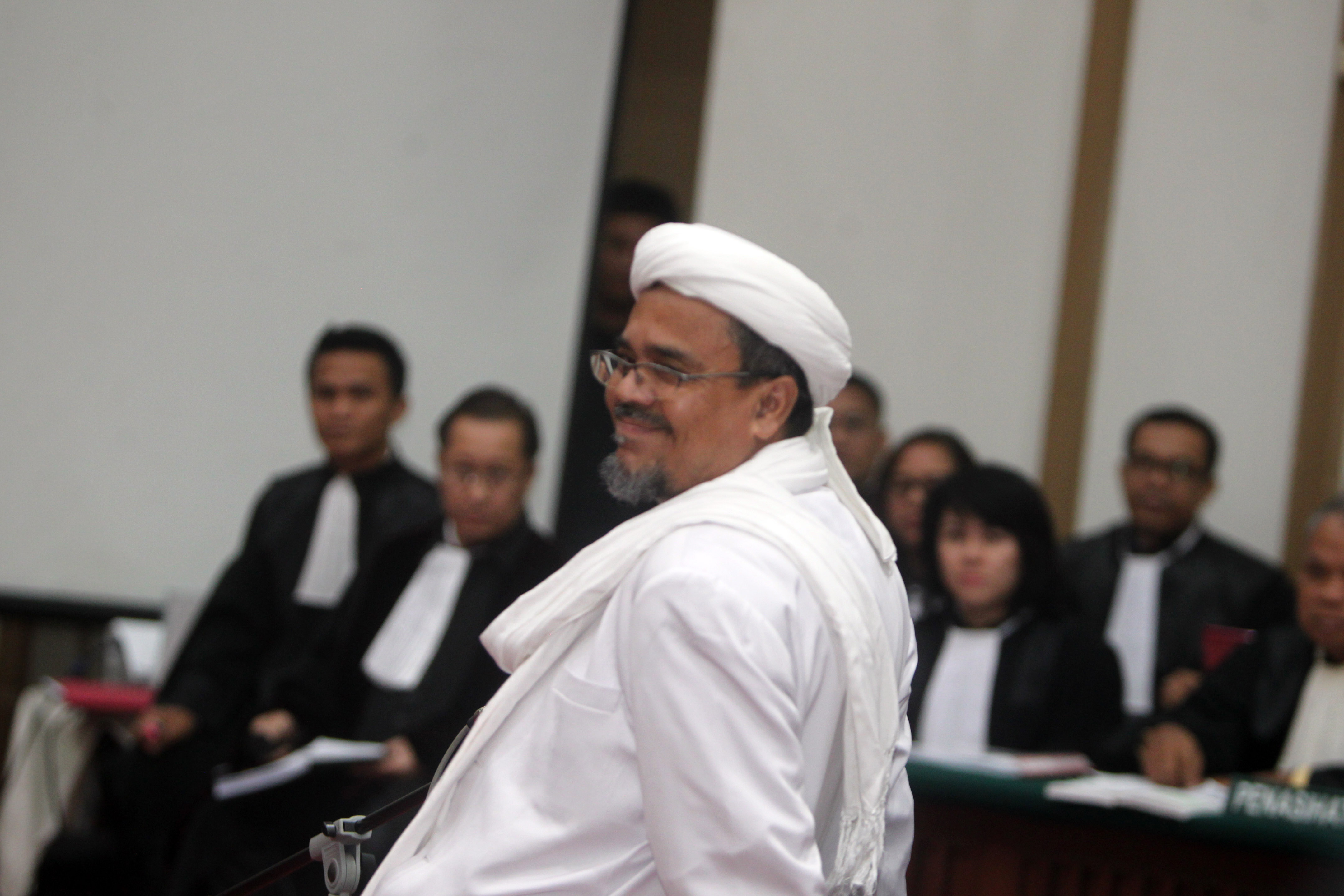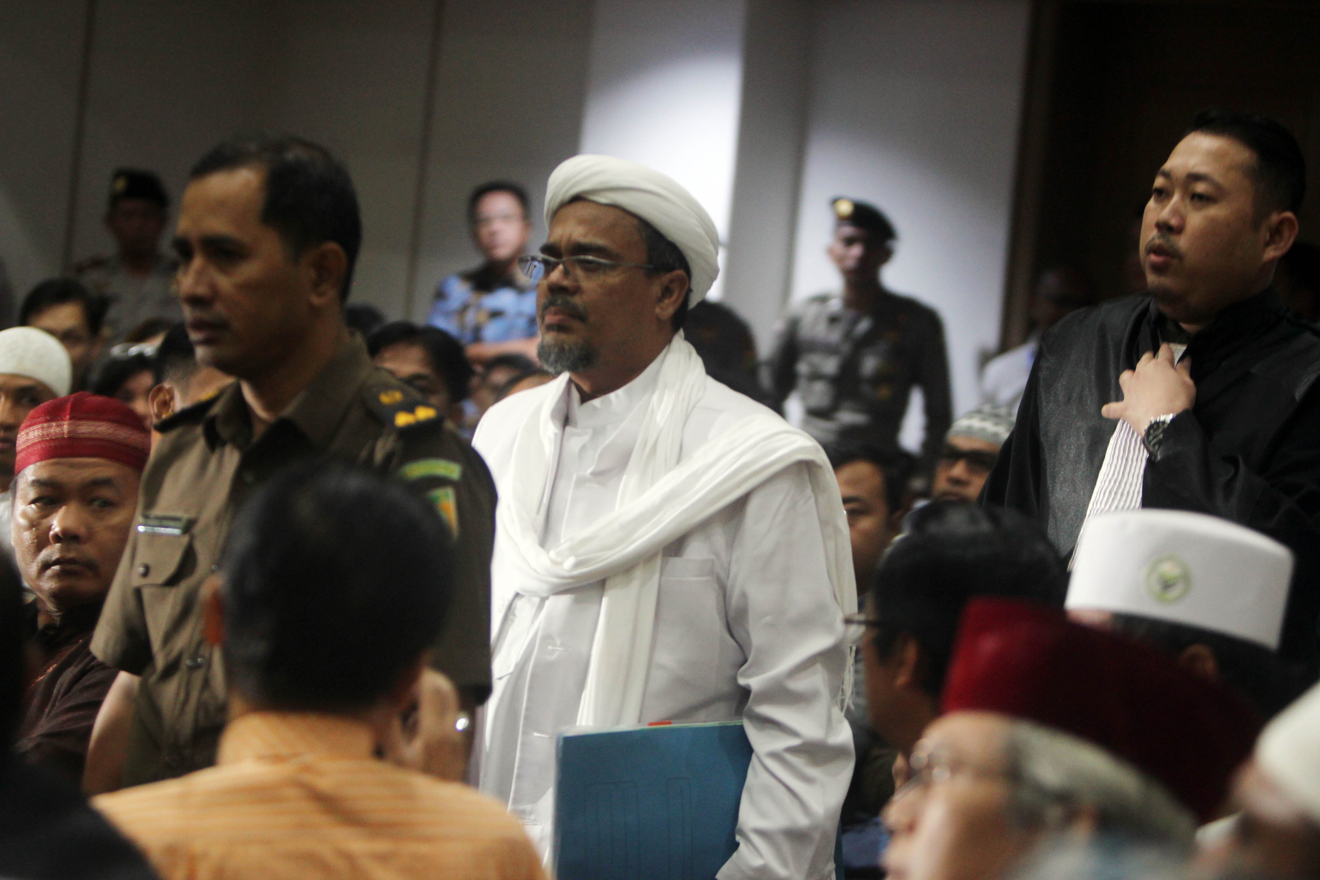 Pemimpin Front Pembela Islam (FPI) Rizieq Shihab memasuki ruang sidang di Gedung Kementerian Pertanian, Jakarta Selatan, Selasa (28/2).. Sidang ke-12 perkara penodaan agama dengan terdakwa Gubernur DKI Jakarta Basuki Tjahaja Purnama (Ahok) menghadirkan dua orang saksi ahli dari Jaksa Penuntut Umum, Pemimpin Front Pembela Islam (FPI) Rizieq Shihab dan ahli hukum pidana dari Majelis Ulama Indonesia (MUI) Abdul Choir Ramadhan. Media Indonesia-Pool/MI/RAMDANI