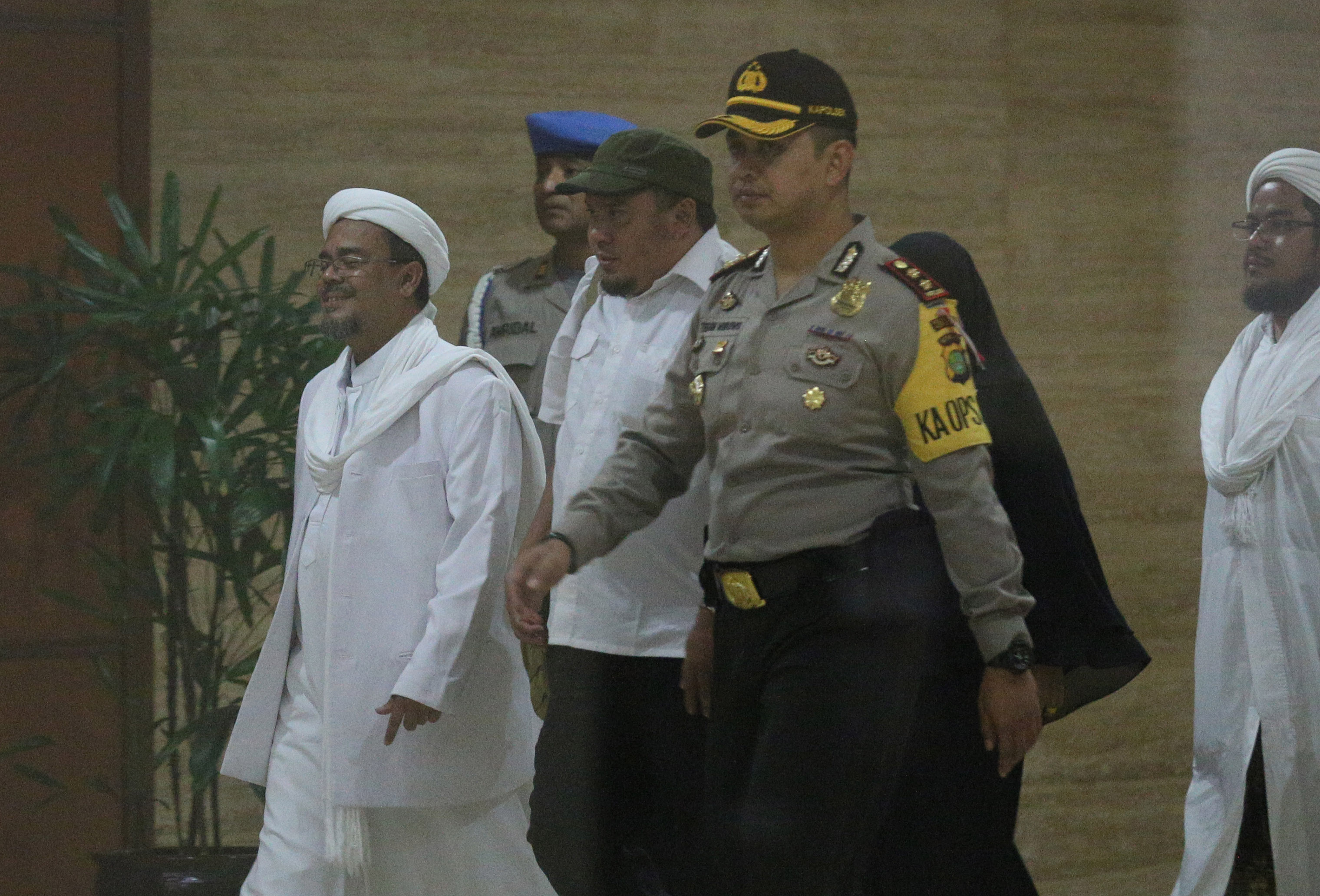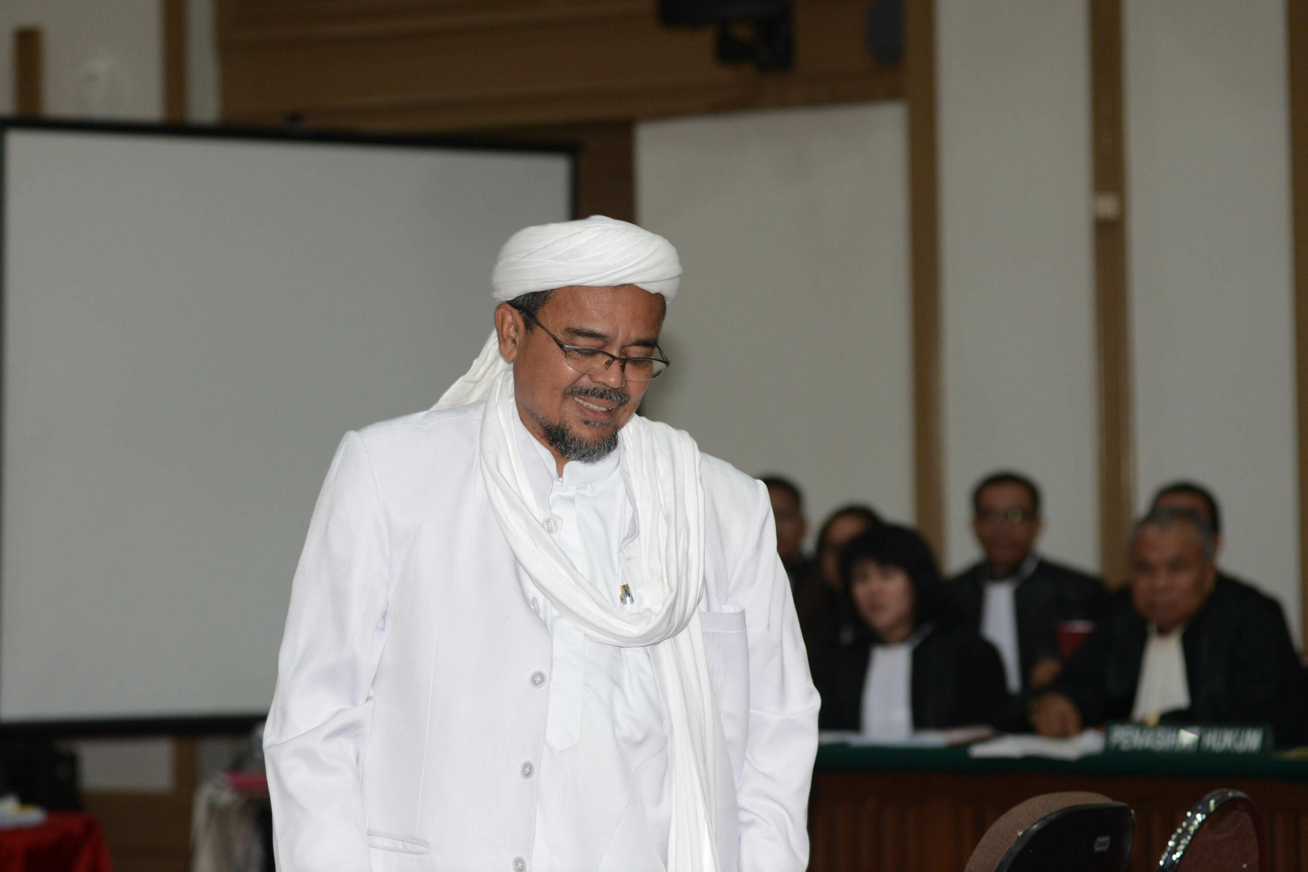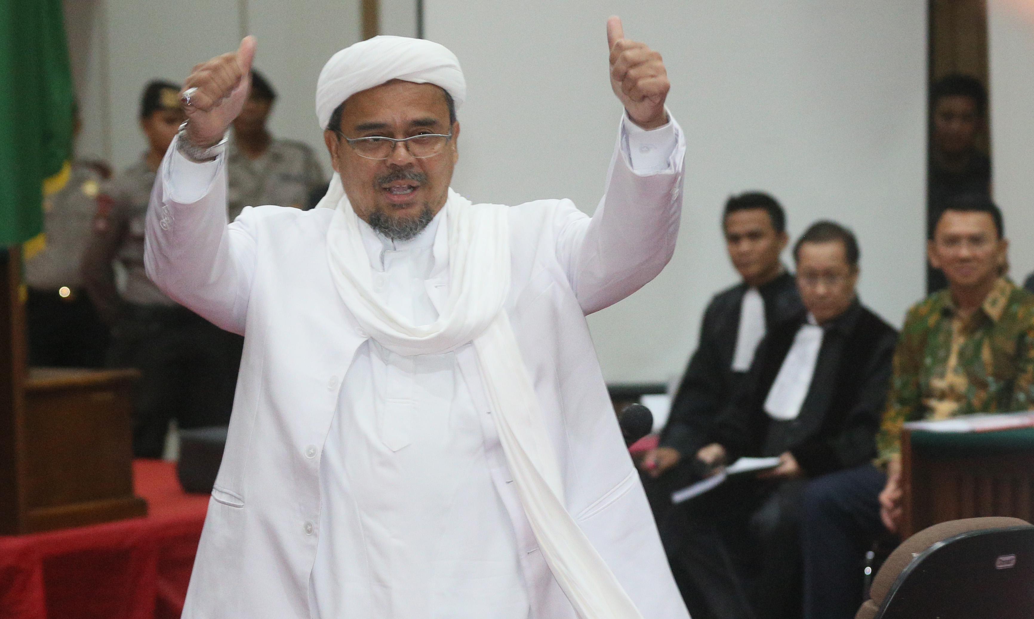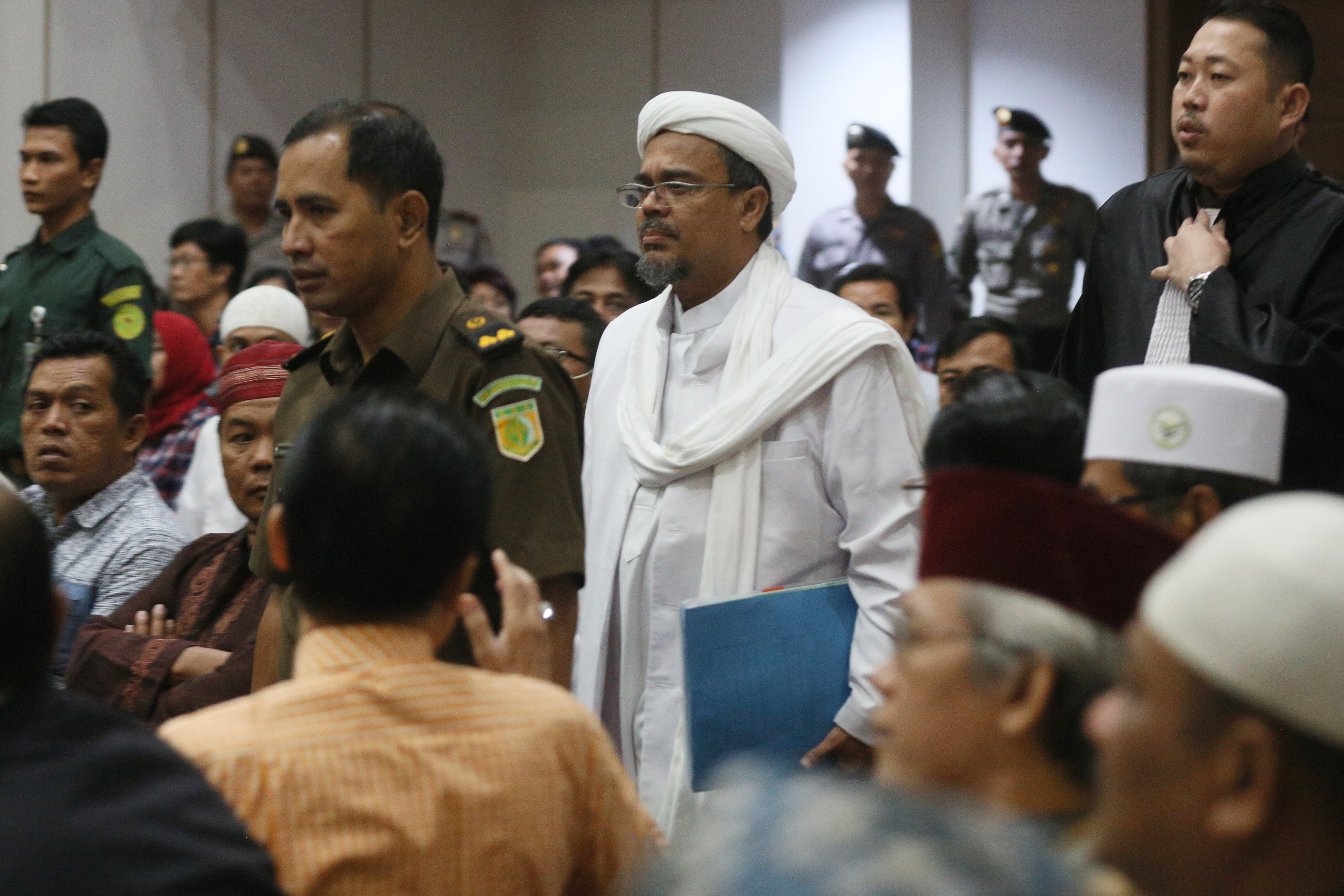 Pemimpin Front Pembela Islam (FPI) Rizieq Shihab memasuki ruang sidang di Gedung Kementerian Pertanian, Jakarta Selatan, Selasa (28/2).. Sidang ke-12 perkara penodaan agama dengan terdakwa Gubernur DKI Jakarta Basuki Tjahaja Purnama (Ahok) menghadirkan dua orang saksi ahli dari Jaksa Penuntut Umum, Pemimpin Front Pembela Islam (FPI) Rizieq Shihab dan ahli hukum pidana dari Majelis Ulama Indonesia (MUI) Abdul Choir Ramadhan. Media Indonesia-Pool/MI/RAMDANI