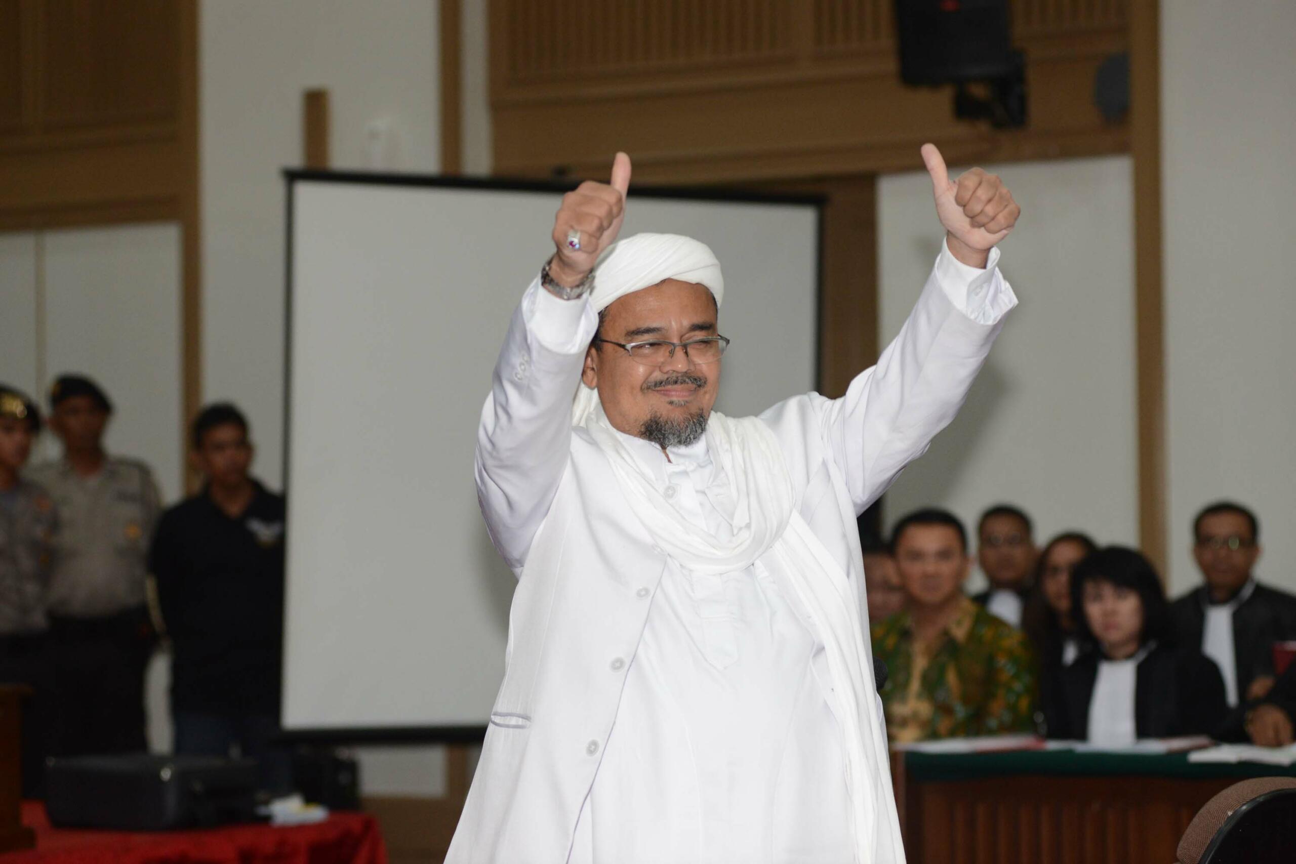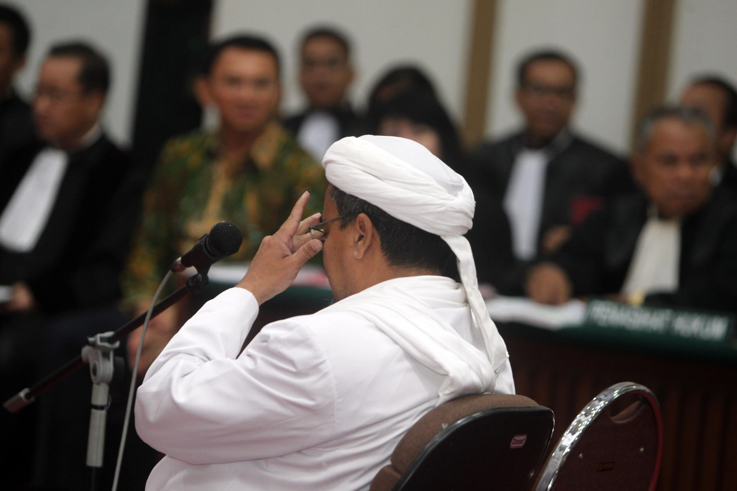 Pemimpin Front Pembela Islam (FPI) Rizieq Shihab saat mengikuti di Gedung Kementerian Pertanian, Jakarta Selatan, Selasa (28/2). Sidang ke-12 perkara penodaan agama dengan terdakwa Gubernur DKI Jakarta Basuki Tjahaja Purnama (Ahok) menghadirkan dua orang saksi ahli dari Jaksa Penuntut Umum, Pemimpin Front Pembela Islam (FPI) Rizieq Shihab dan ahli hukum pidana dari Majelis Ulama Indonesia (MUI) Abdul Choir Ramadhan. Media Indonesia-Pool/MI/RAMDANI