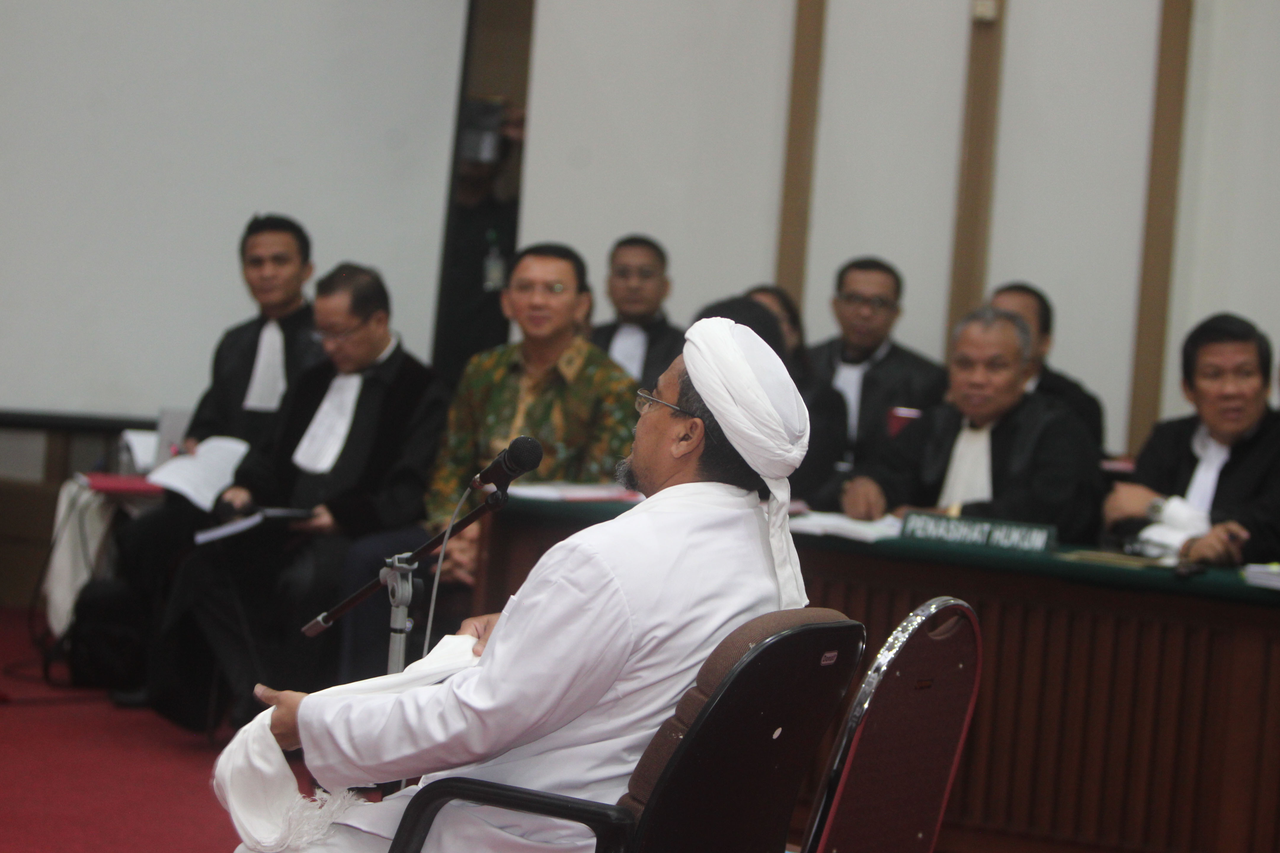 Ketua Umum FPI Habib Muhammad Rizieq Shihab menjadi saksi di persidangan ke-12 kasus dugaan penistaan agama dengan terdakwa Gubernur DKI Jakarta, Basuki T Purnama (Ahok) yang digelar oleh Pengadilan Negeri Jakarta Utara di Auditorum Kementerian Pertanian, Jakarta, Selasa (28/2/17). Pada sidang ke-12 kali ini Jaksa Penuntut Umum (JPU) menghadirkan dua saksi ahli yaitu Ketua Umum FPI, Habib Riziek Shihab dan Ahli pidana dari MUI, Abdul Chair Ramadhan. Sindonews.com-POOL/Isra Triansyah