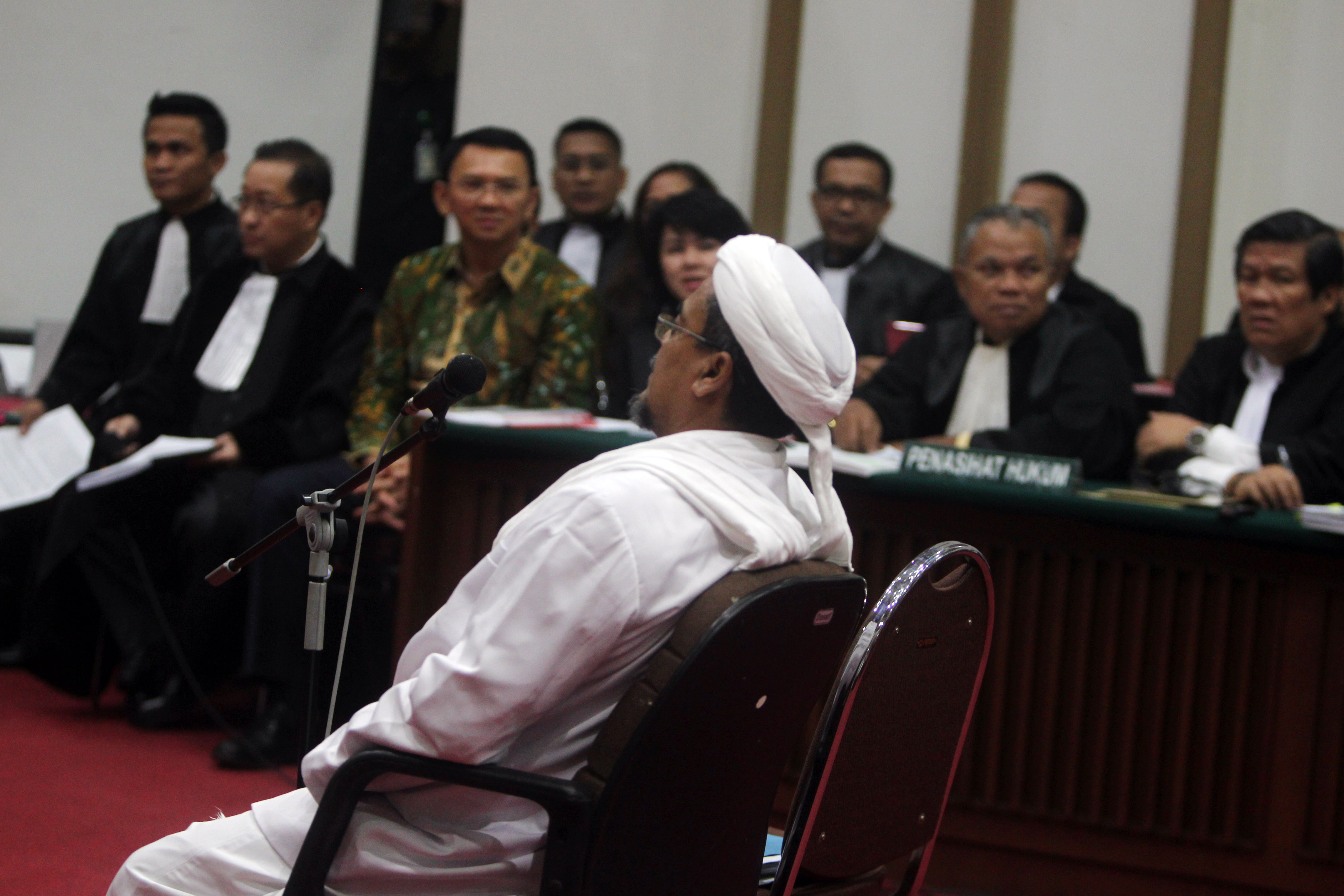 Habib Rizieq Shihab menjadi saksi dalam sidang terdakwa kasus dugaan penistaan agama Gubernur DKI Jakarta, Basuki Tjahaja Purnama saat menjalani sidang yang digelar oleh Pengadilan Negeri Jakarta Utara di Auditorium Kementerian Pertanian, Jakarta, Selasa (28/2). Dalam sidang tersebut, Jaksa Penuntut Umum menghadirkan dua orang saksi ahli yaitu Habib Rizieq Shihab dan Ahli Hukum Pidana Abdul Chair Ramadhan untuk memberikan keterangan terkait dugaan kasus penistaan agama. Foto: Raisan Al Republika-Pool/Raisan Al Farisi