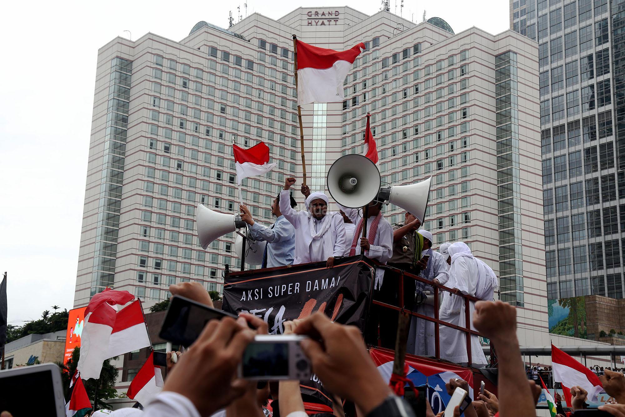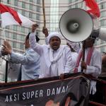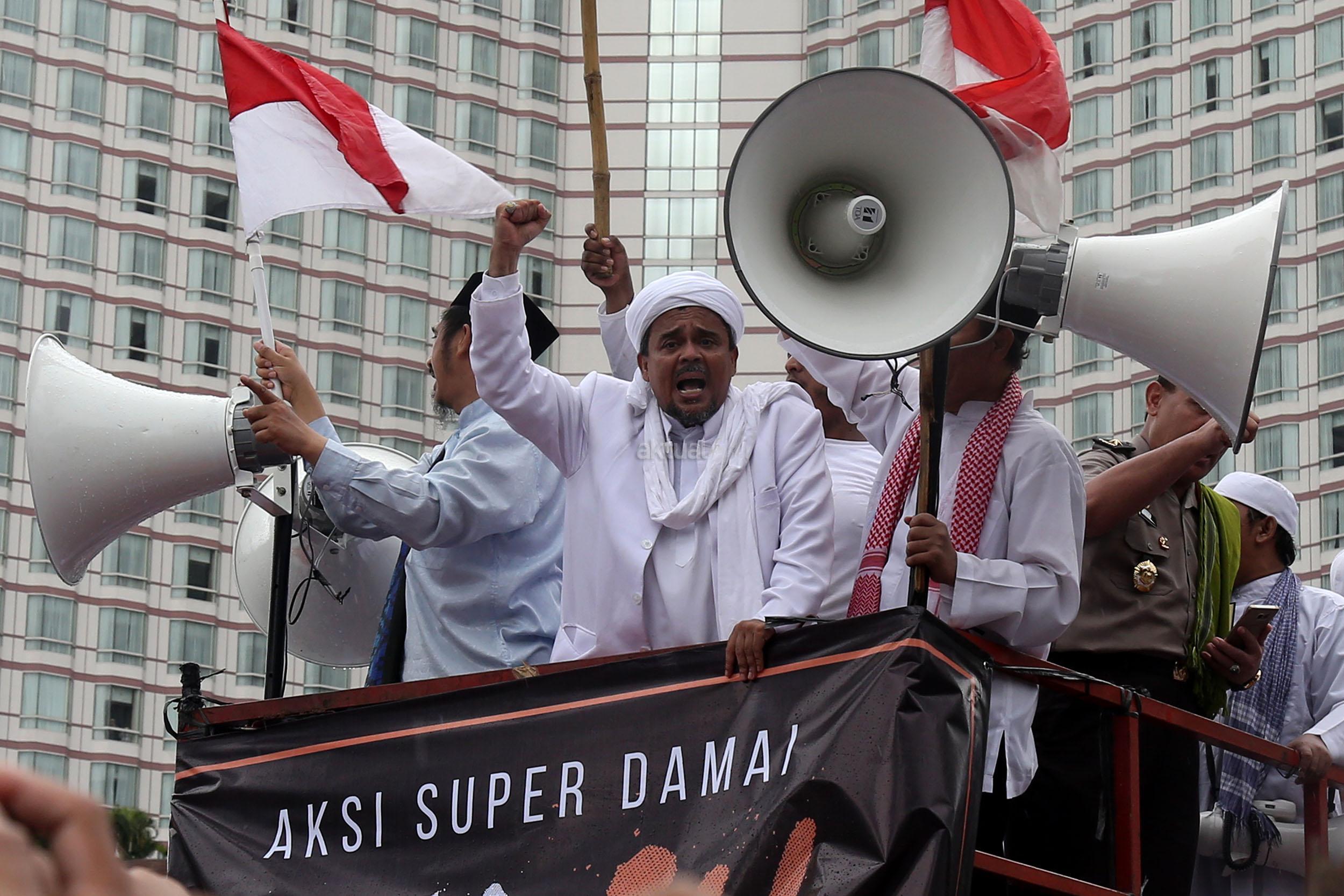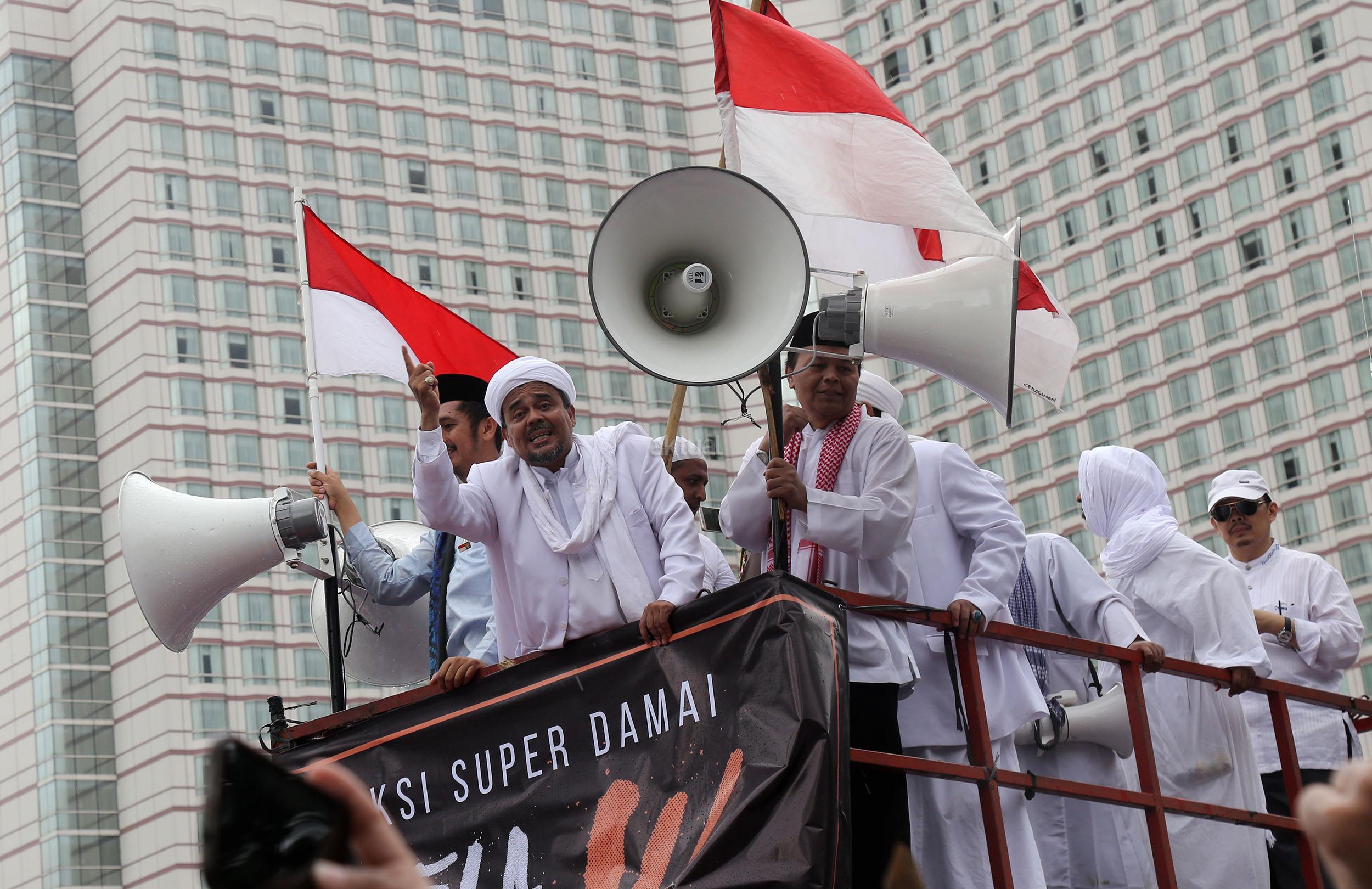 Ketua Dewan Pembina GNPF-MUI Habib Rizieq Shihab memimpin long march umat muslim usai melakukan aksi bela islam jilid III dari Monas ke Bundaran HI, Jakarta Pusat, Jumat (2/12/2016). Aksi digelar sejak pagi hingga usai salat Jumat. Jutaan massa umat Islam telah membuktikan menggelar Aksi Bela Islam III dengan tertib, aman dan super damai. AKTUAL/Tino Oktaviano