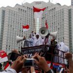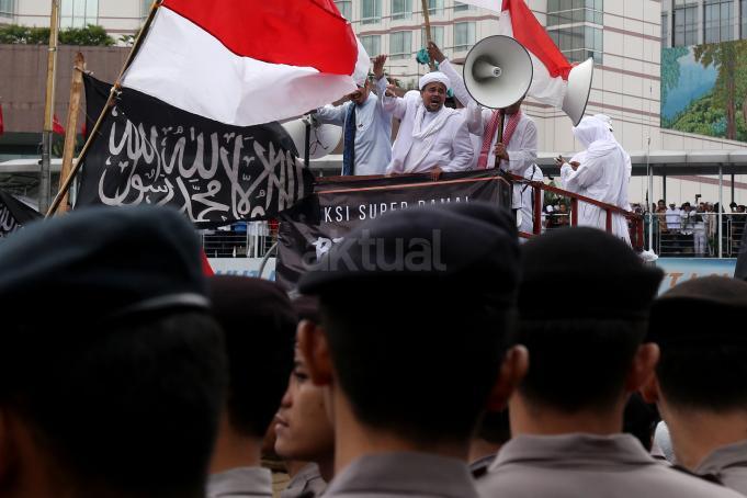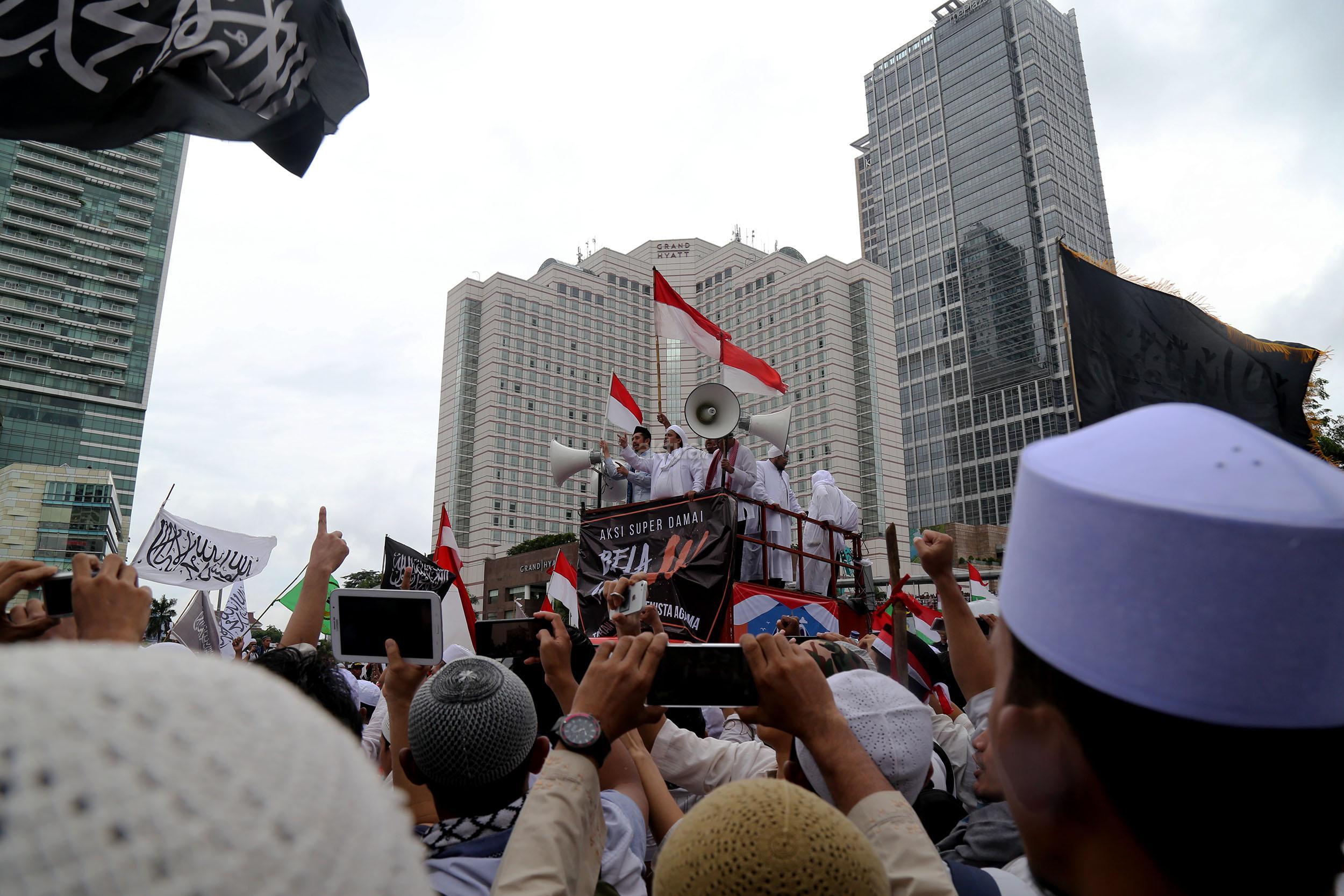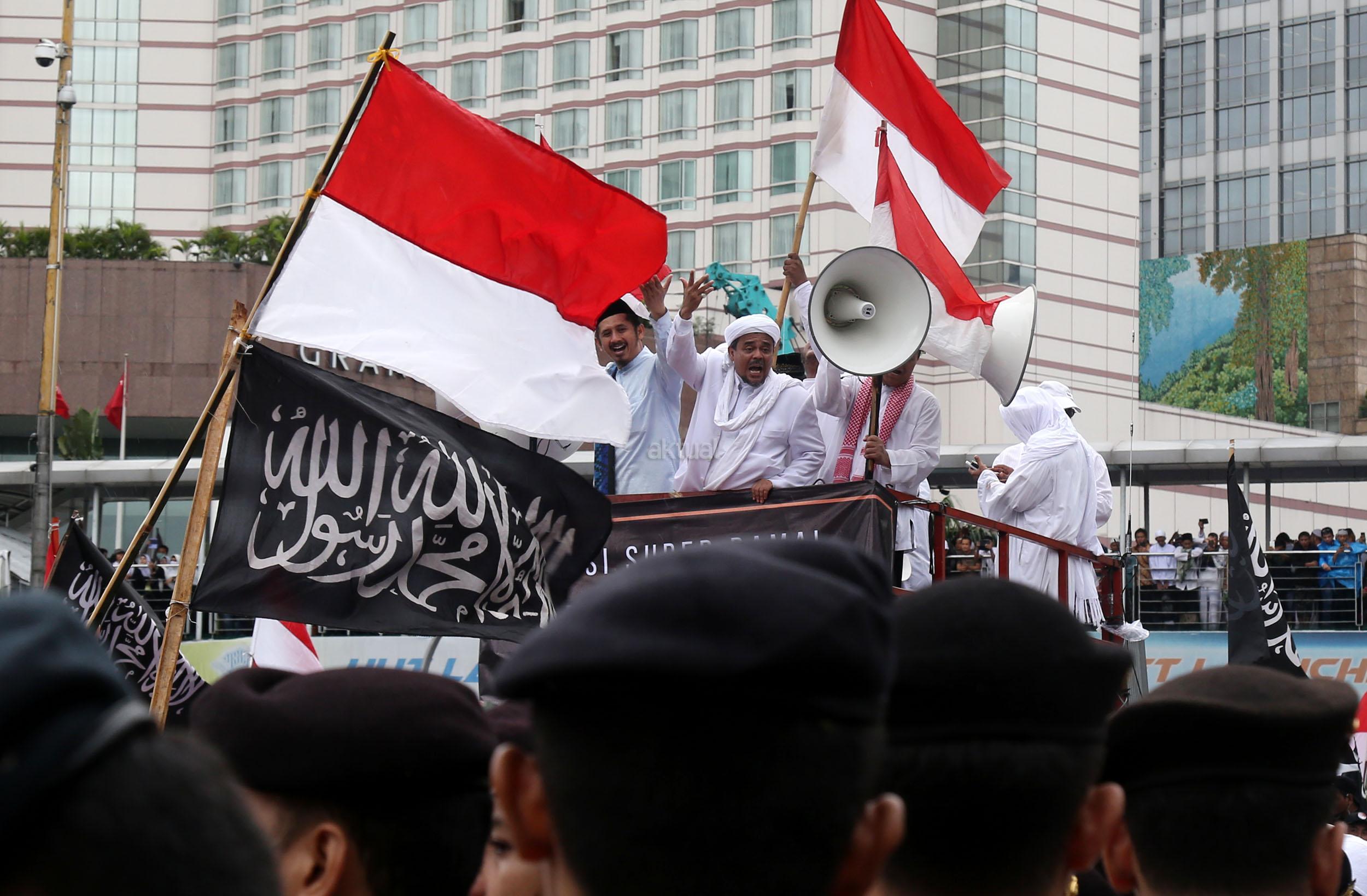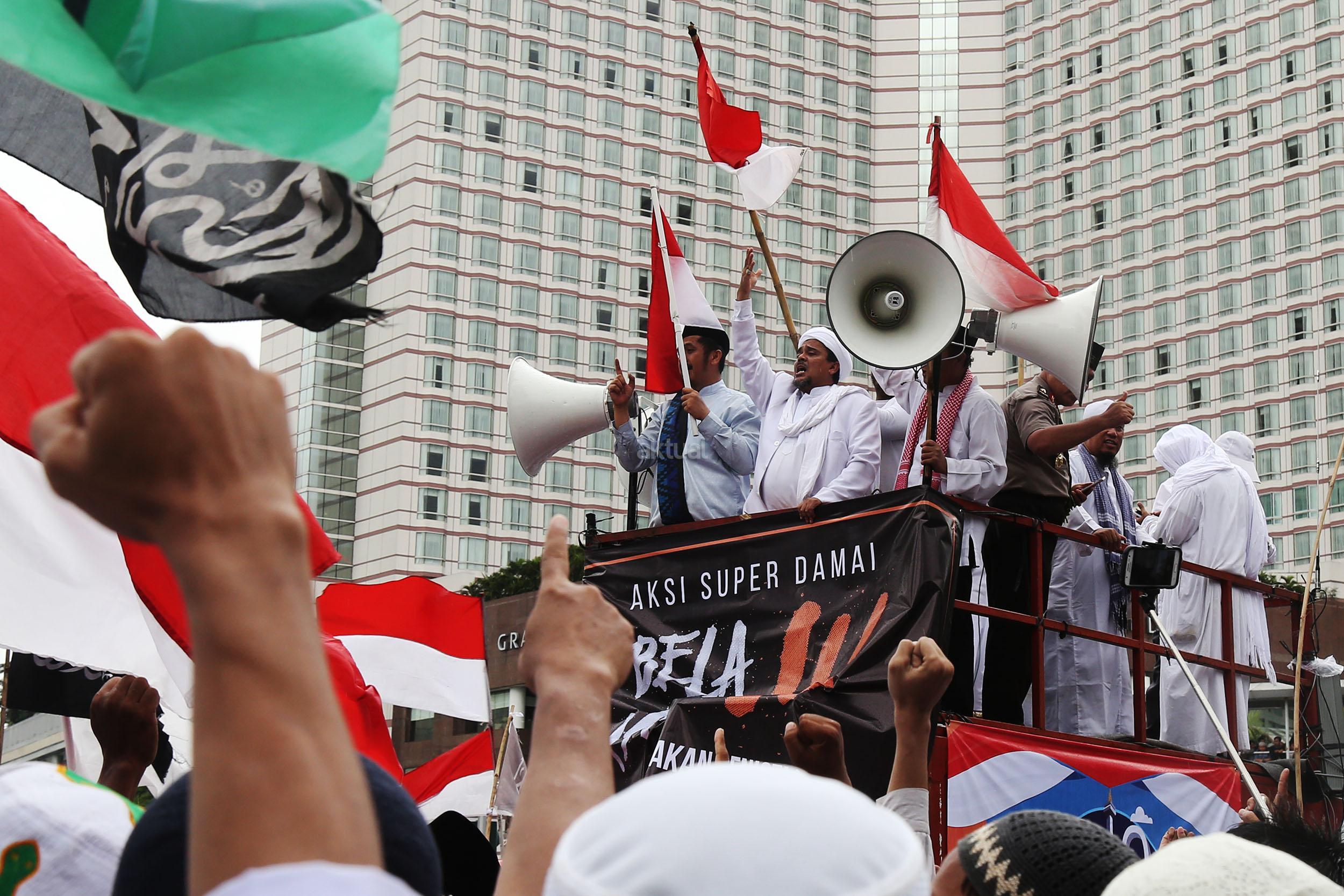 Ketua Dewan Pembina GNPF-MUI Habib Rizieq Shihab memimpin long march umat muslim usai melakukan aksi bela islam jilid III dari Monas ke Bundaran HI, Jakarta Pusat, Jumat (2/12/2016). Aksi digelar sejak pagi hingga usai salat Jumat. Jutaan massa umat Islam telah membuktikan menggelar Aksi Bela Islam III dengan tertib, aman dan super damai. AKTUAL/Tino Oktaviano