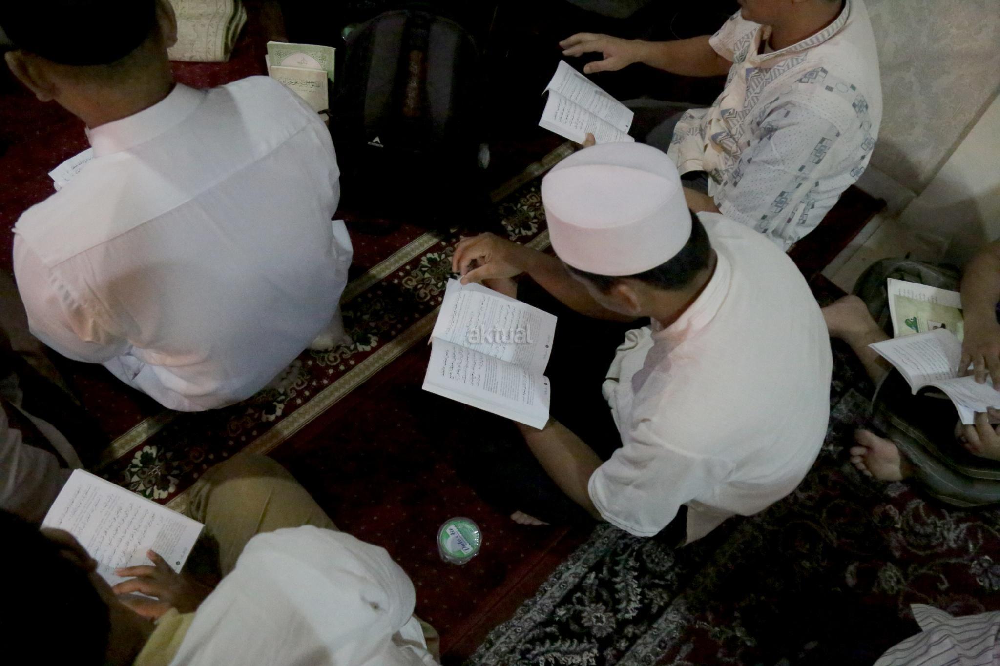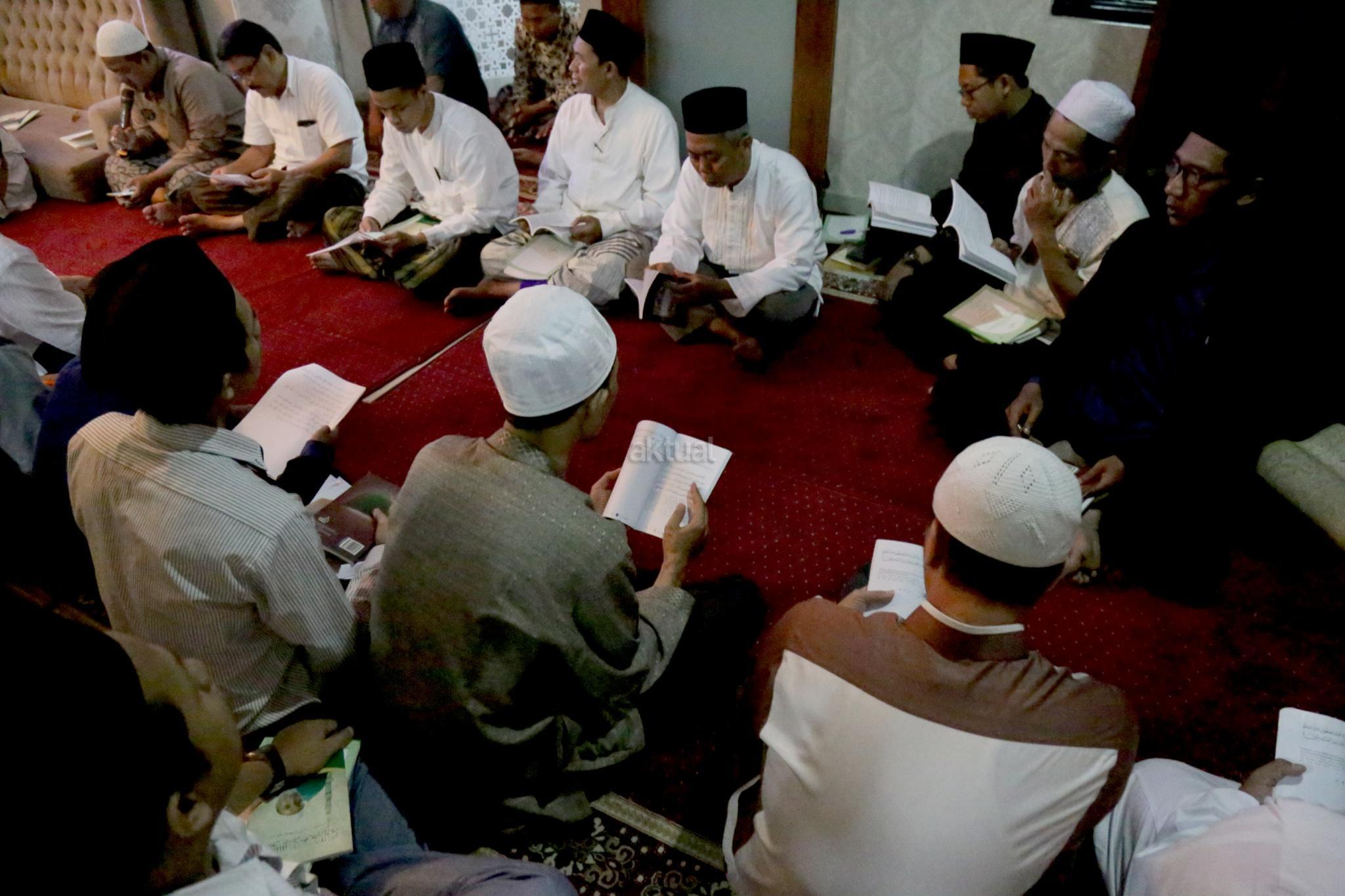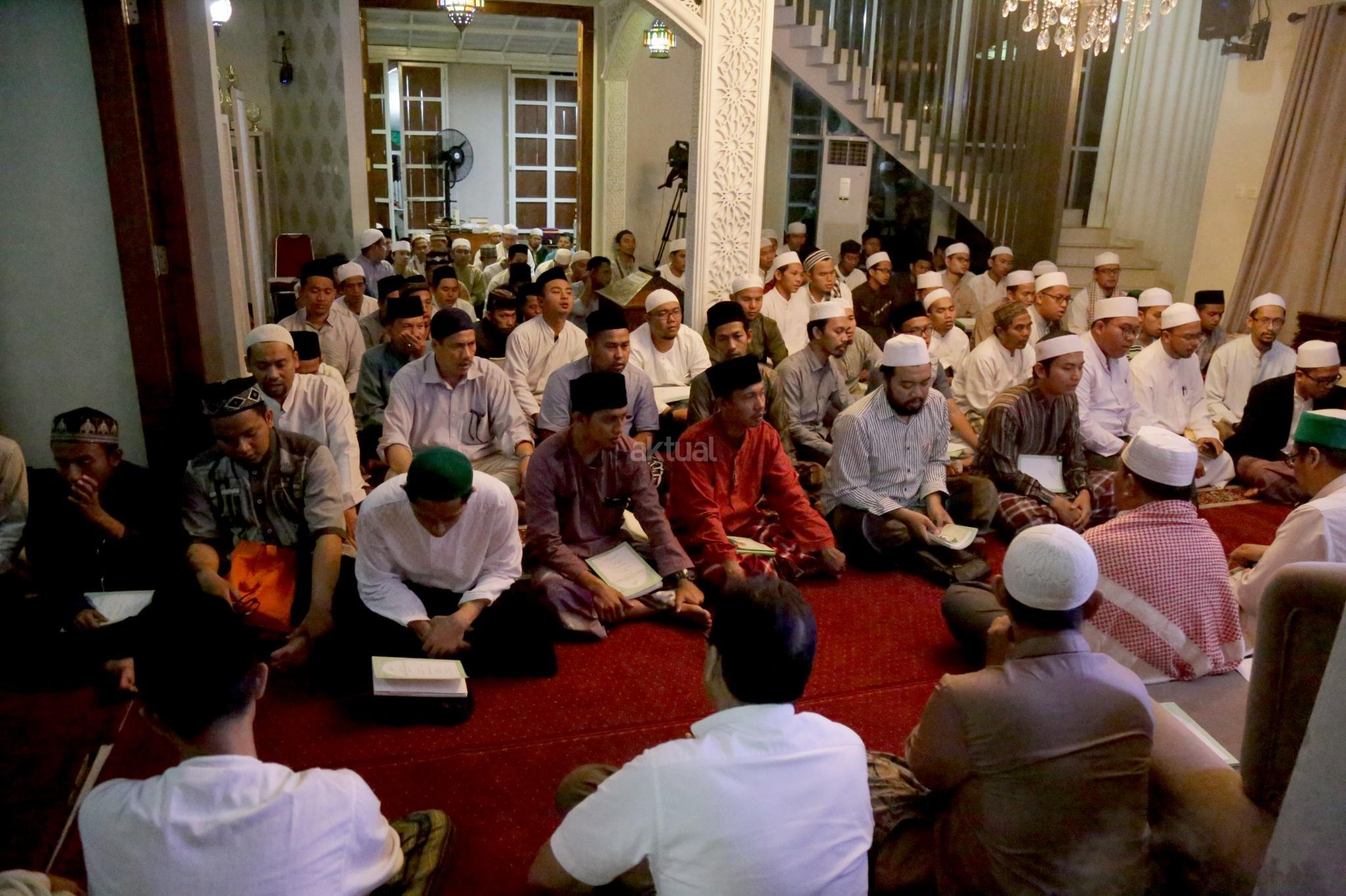 Jemaah melaksanakan Dzikir dan Sholawat usai acara Multaqo al-‘Ilmi Wa Adz-Dzikr al Alami di Zawiyah Arraudhah, Jalan Tebet Barat, Jakarta Selatan, Kamis (11/1/2018). Hadroh Usbuiyah li Thariqati Shiddiqiyah Syadzilliyah ini dilaksanakan rutin setiap Kamis malam di Zawiyah Arraudhah. AKTUAL/Tino Oktaviano