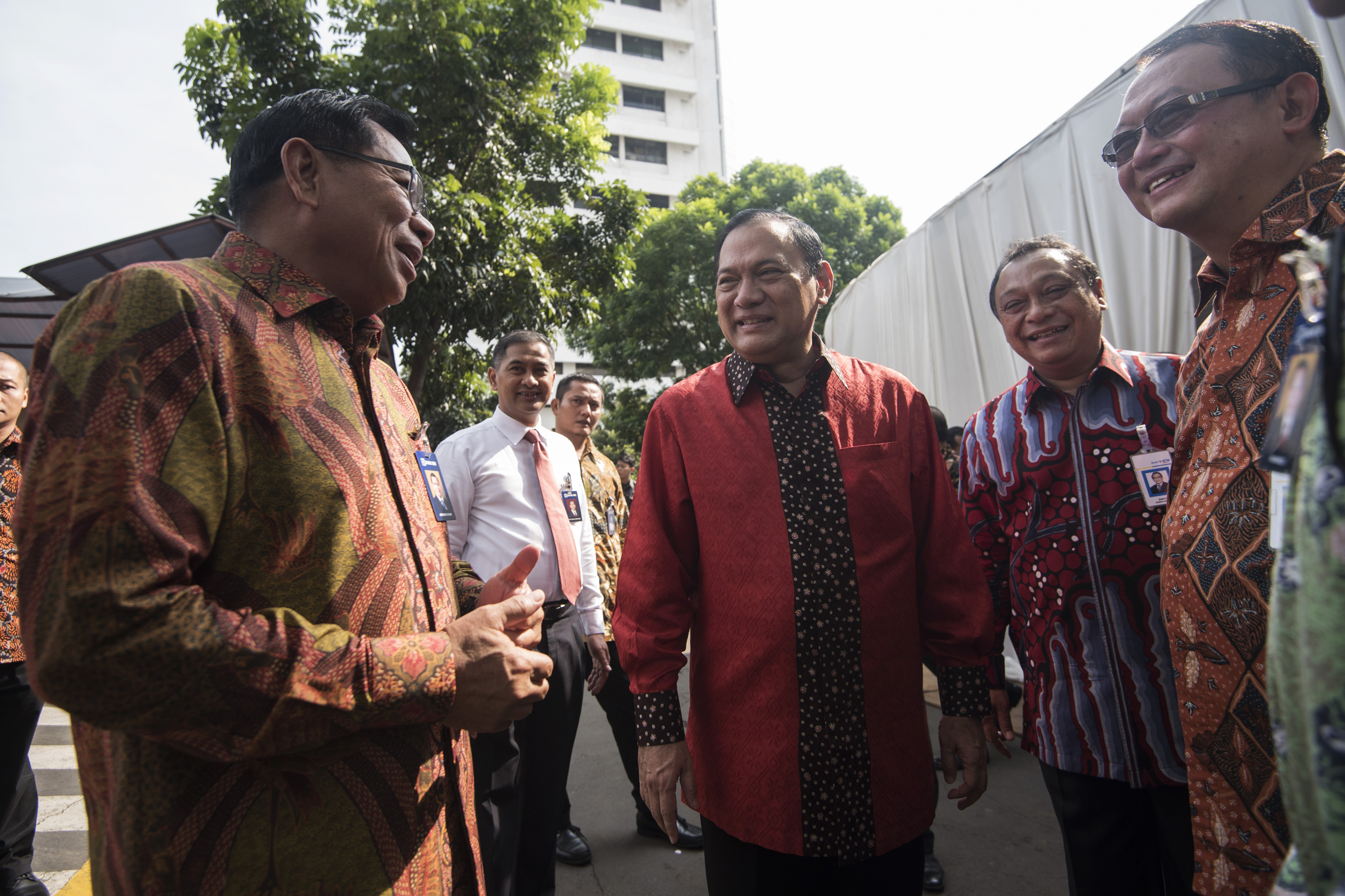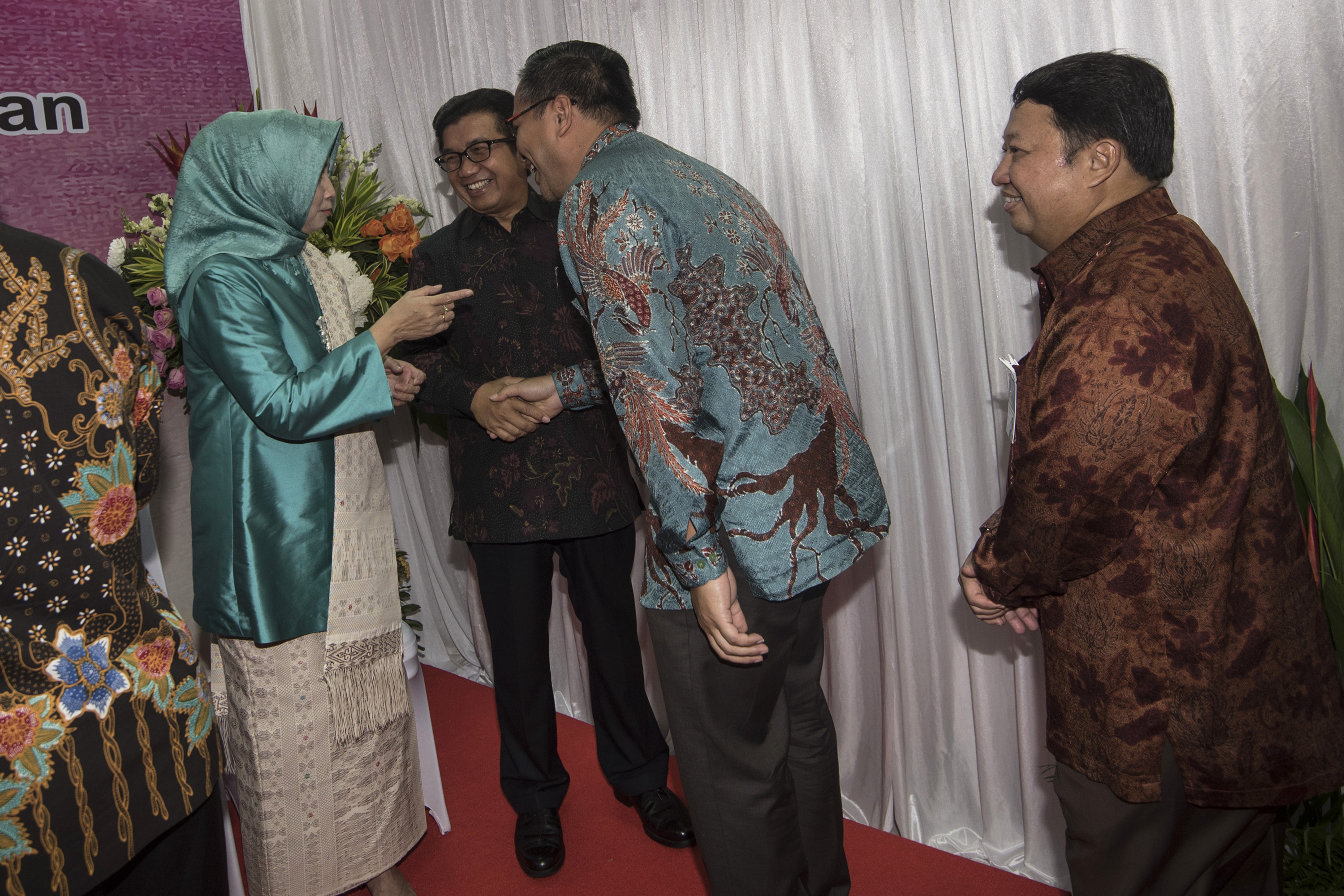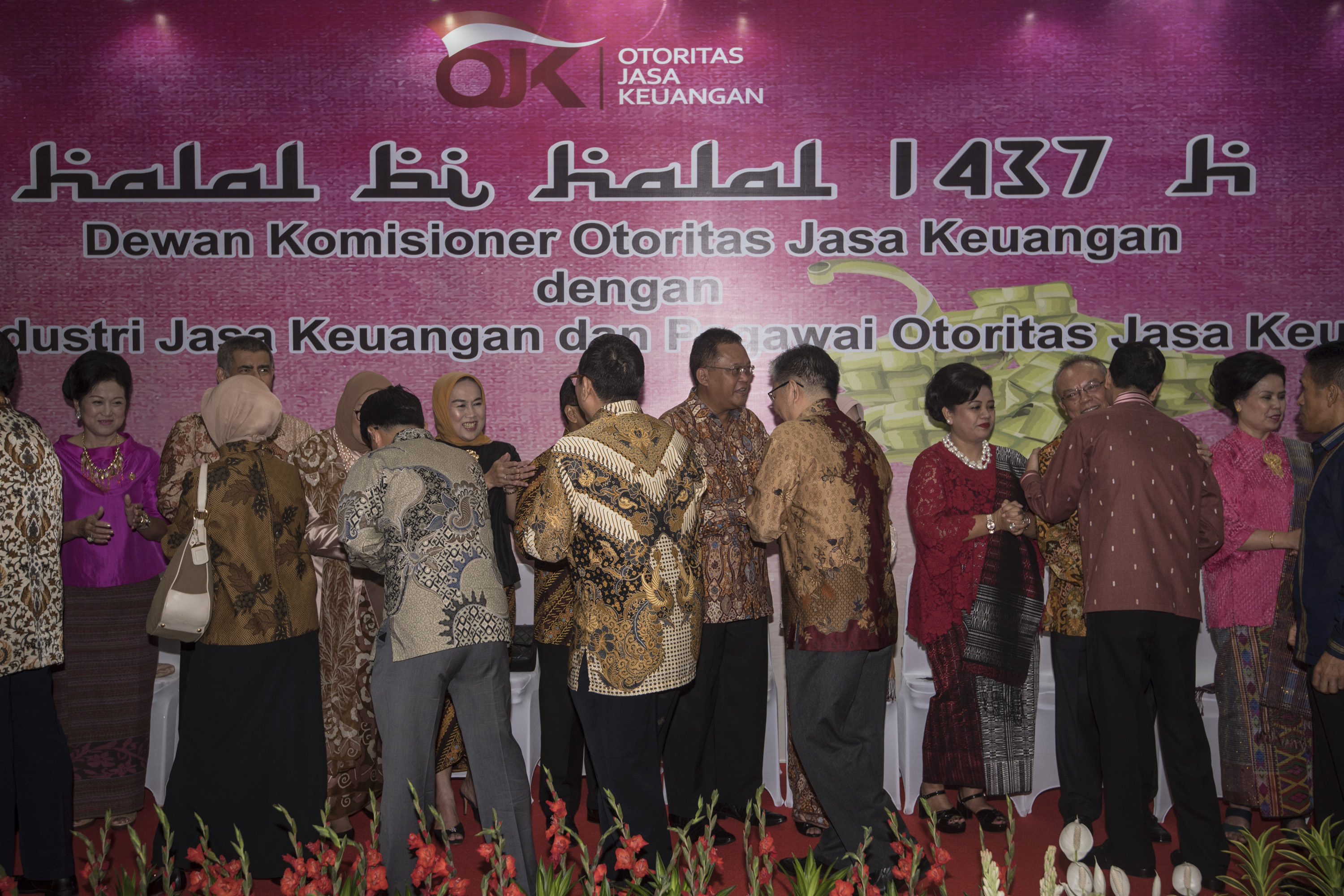 Ketua Dewan Komisioner Otoritas Jasa Keuangan (OJK) Muliaman D Hadad (kedua kiri) didampingi istri Wendradi Dodi Sarah Bey (kiri) bersalaman dengan Dirut Bank Mandiri Kartika Wirjoatmodjo (kedua kanan) yang datang bersama Wadirut Bank Mandiri Sulaiman A Arianto (kanan) saat halal bihalal Dewan Komisioner OJK di Jakarta, Selasa (12/7). Kegiatan tersebut merupakan silaturahmi dalam rangka Idulfitri 1437 H antara anggota Dewan Komisioner OJK dengan para pelaku industri keuangan. ANTARA FOTO/Sigid Kurniawan/kye/16.