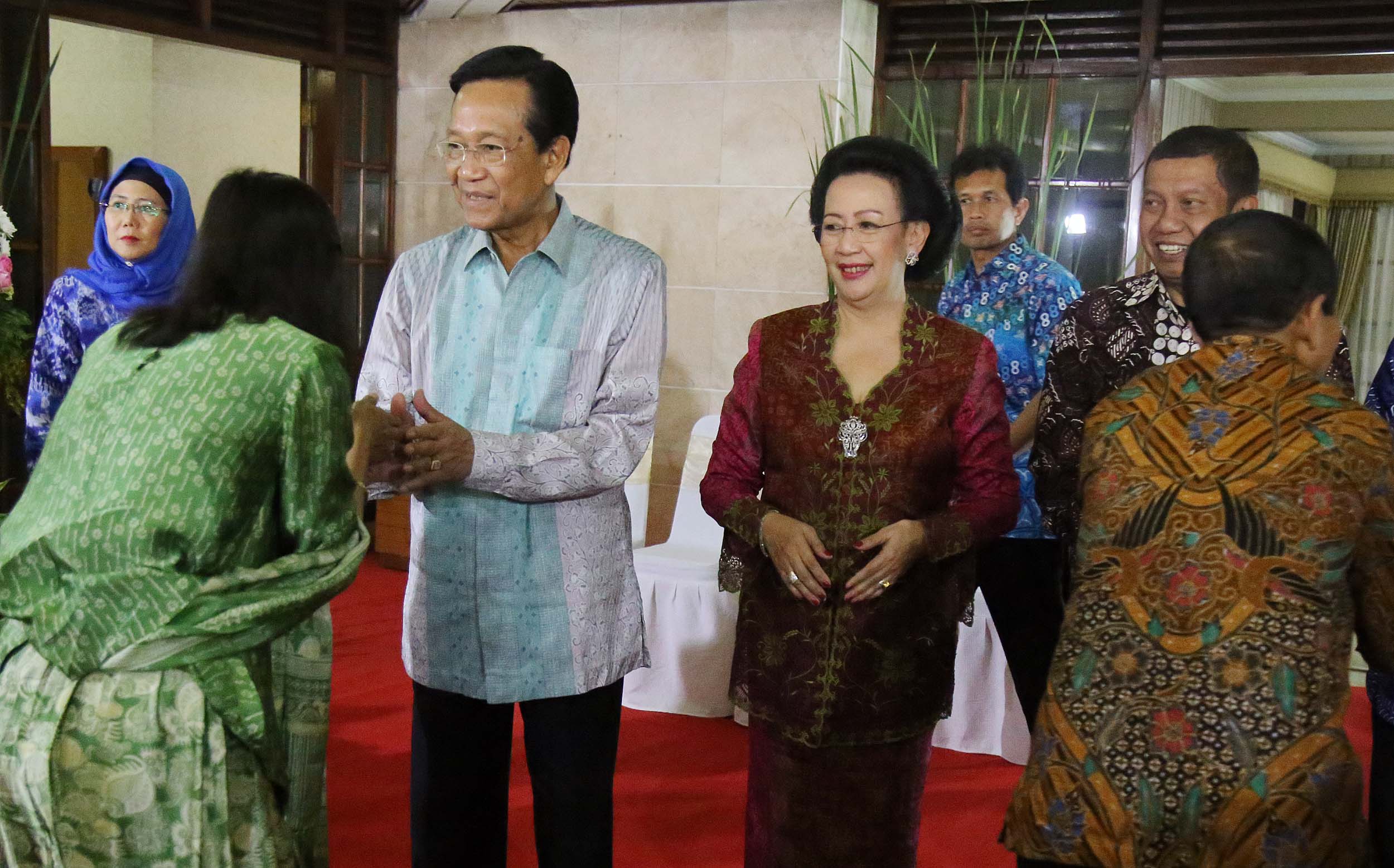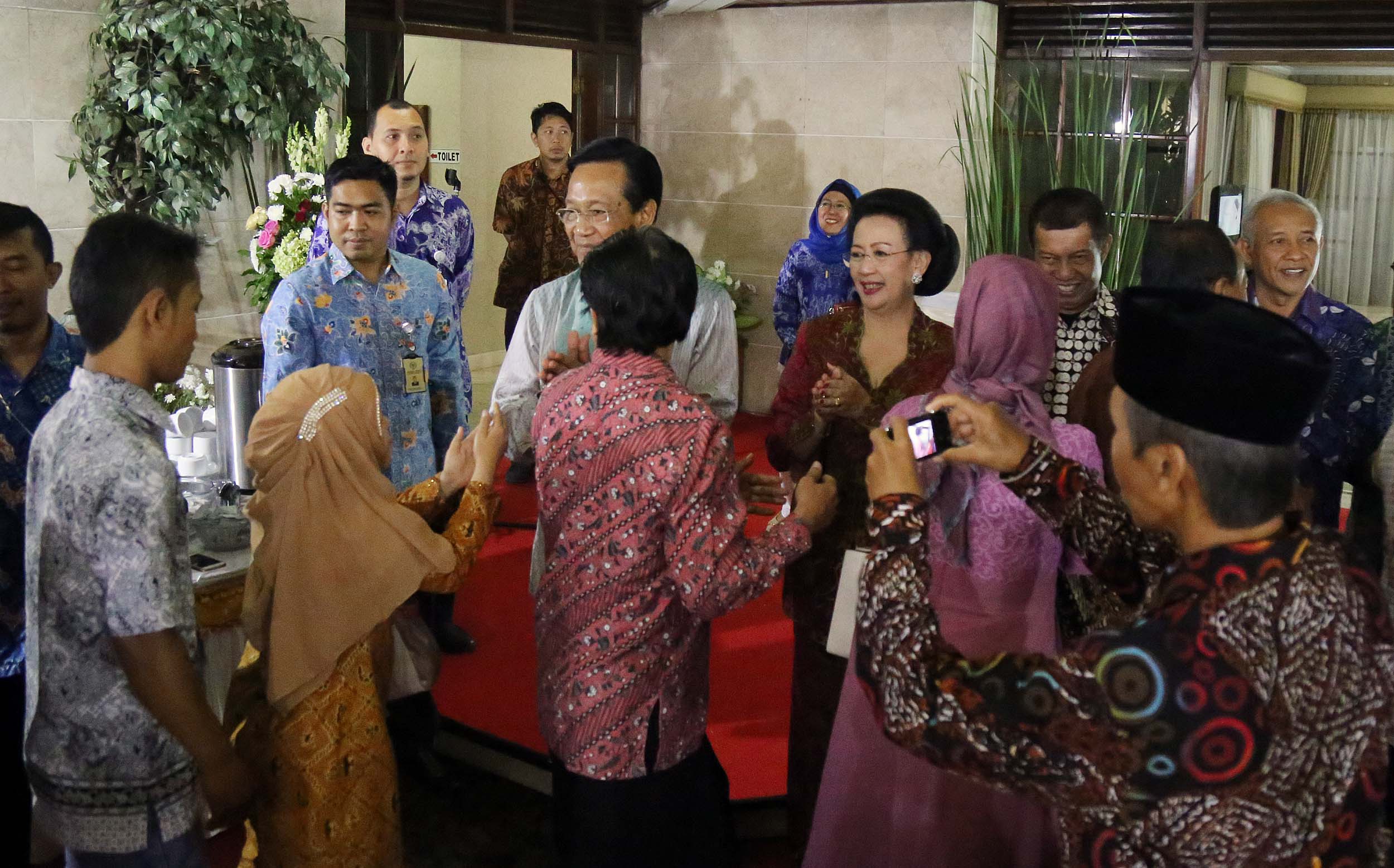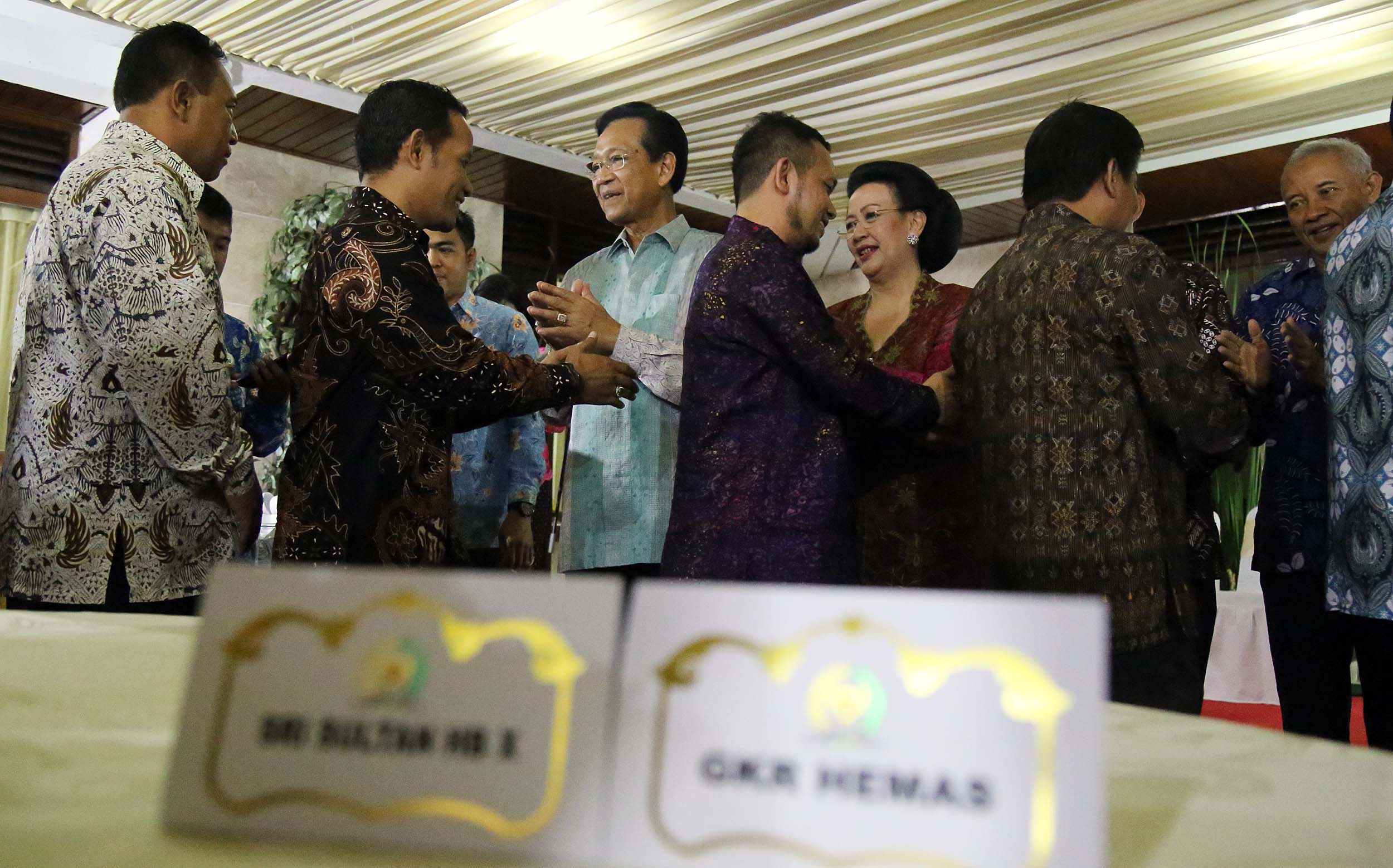 Wakil Ketua DPD RI, GKR Hemas (kiri) didampingi Gubernur DIY Sultan Hamengku Buwono X (kanan) saat halal bihalal di Kediaman Dinas di Kuningan, Jakarta, Minggu (24/7/2016). Halal bihalal dengan perwakilan warga Yogyakarta di Jakarta ini diantaranya membahas kegiatan partisipasi warga dalam kegiatan pembangunan di Propinsi DIY.