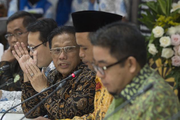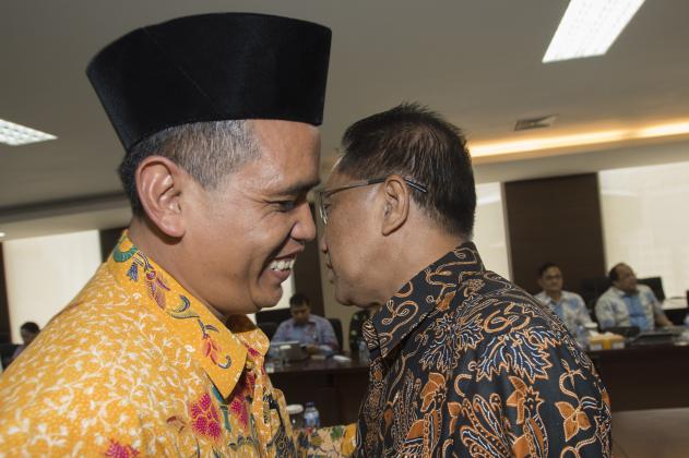 Kepala Eksekutif Pengawas Industri Keuangan Non Bank (IKNB) OJK Firdaus Djaelani (kanan) menyapa Wakil Ketua Dewan Pengurus Harian Dewan Syariah Nasional MUI Jaih Mubarok sebelum pertemuan Direksi BPJS Kesehatan, pengurus MUI, Dewan Jaminan Sosial Nasional dan OJK di Gedung Menara Merdeka, Jakarta, Selasa (4/8). Dalam pertemuan tersebut telah dicapai kesepahaman antara para pihak antara lain dalam rekomendasi "ijtima" Ulama Komisi Fatwa MUI se-Indonesia tentang penyelenggaraan jaminan kesehatan nasional oleh BPJS kesehatan, tidak ada kosa kata haram. ANTARA FOTO/Rosa Panggabean/ama/15.