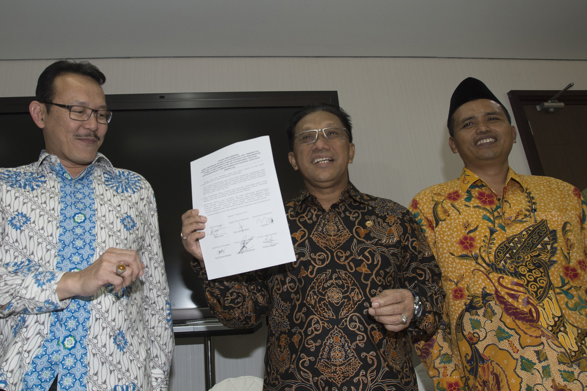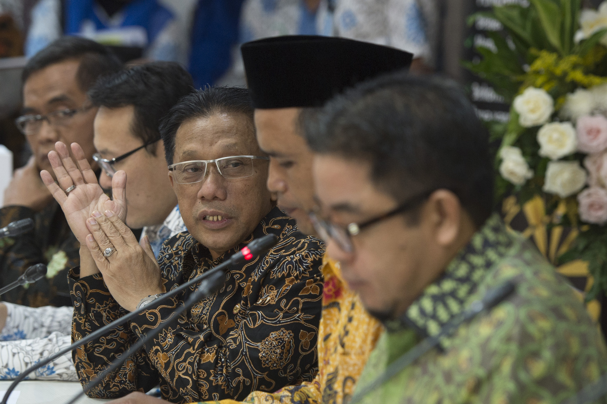 Kepala Eksekutif Pengawas Industri Keuangan Non Bank (IKNB) OJK Firdaus Djaelani (tengah) bersama Direktur Utama BPJS Kesehatan Fahmi Idris (kiri) dan Wakil Ketua Dewan Pengurus Harian Dewan Syariah Nasional MUI Jaih Mubarok (kanan) memberi keterangan pers usai pertemuan Direksi BPJS Kesehatan, pengurus MUI, Dewan Jaminan Sosial Nasional dan OJK di Gedung Menara Merdeka, Jakarta, Selasa (4/8). Dalam pertemuan tersebut telah dicapai kesepahaman antara para pihak antara lain dalam rekomendasi "ijtima" Ulama Komisi Fatwa MUI se-Indonesia tentang penyelenggaraan jaminan kesehatan nasional oleh BPJS kesehatan, tidak ada kosa kata haram. ANTARA FOTO/Rosa Panggabean/ama/15.