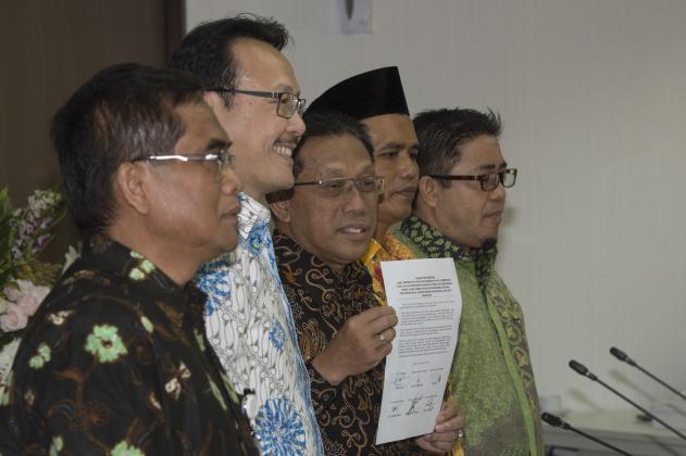 Kepala Eksekutif Pengawas Industri Keuangan Non Bank (IKNB) OJK Firdaus Djaelani (tengah) bersama Direktur Utama BPJS Kesehatan Fahmi Idris (kedua kiri), Wakil Ketua Dewan Pengurus Harian Dewan Syariah Nasional MUI Jaih Mubarok (kedua kanan), Mantan Sekjen Masyarakat Ekonomi Syariah Muhammad Syakir (kanan) dan perwakilan Kementerian Kesehatan Sundoyo (kiri) memberi keterangan pers usai pertemuan Direksi BPJS Kesehatan, pengurus MUI, Dewan Jaminan Sosial Nasional dan OJK di Gedung Menara Merdeka, Jakarta, Selasa (4/8). Dalam pertemuan tersebut telah dicapai kesepahaman antara para pihak antara lain dalam rekomendasi "ijtima" Ulama Komisi Fatwa MUI se-Indonesia tentang penyelenggaraan jaminan kesehatan nasional oleh BPJS kesehatan, tidak ada kosa kata haram. ANTARA FOTO/Rosa Panggabean/ama/15.