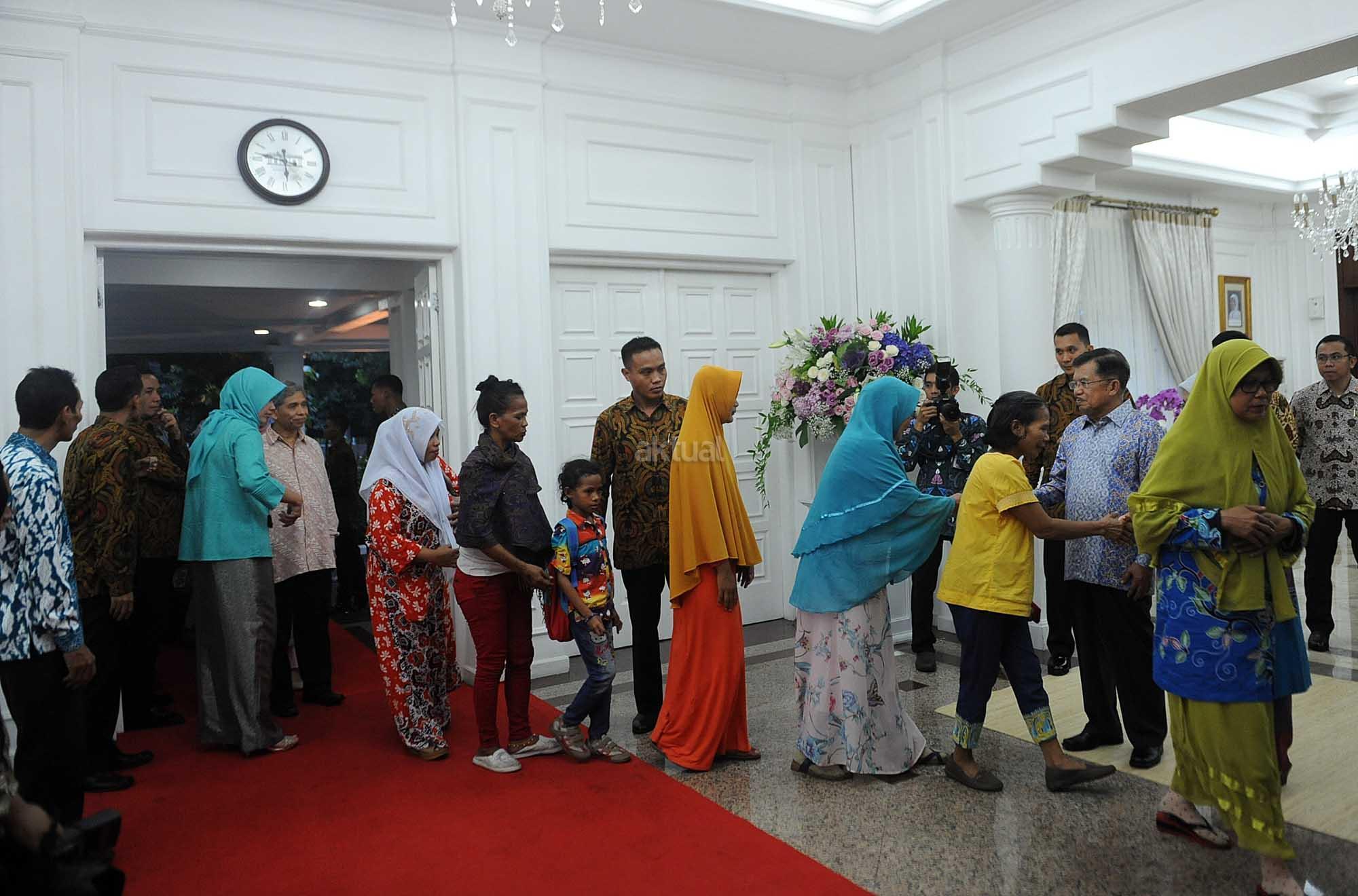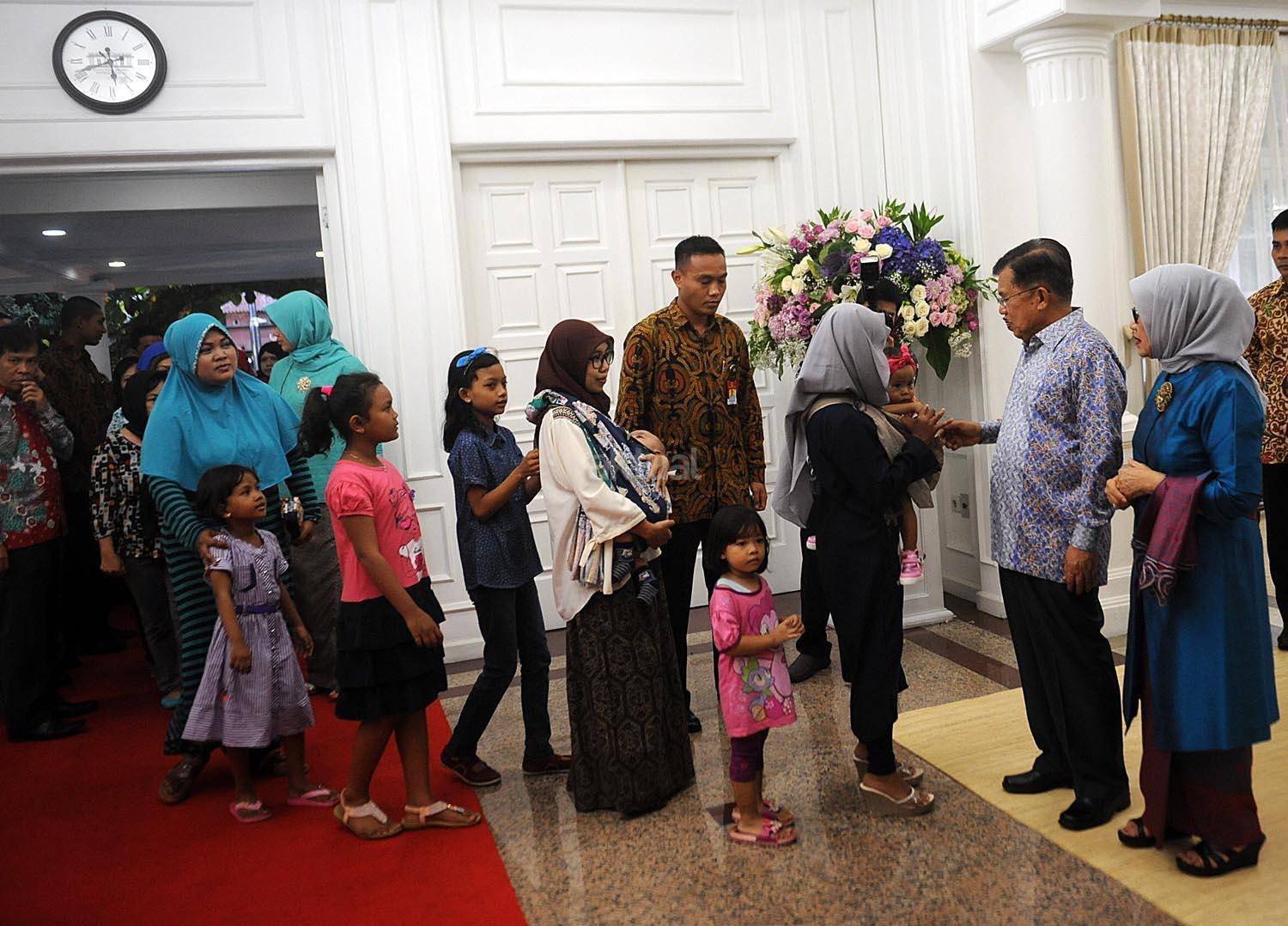 Wakil Presiden Jusuf Kalla (kedua kanan) beserta Ibu Mufidah Jusuf Kalla (kanan) menyalami warga ketika menggelar halalbihalal di Rumah Dinas Wapres, Jakarta, Minggu (25/6). Wapres menggelar halalbihalal untuk kolega dan warga yang ingin bersilaturahmi dalam rangka Idul Fitri 1438 Hijriah. AKTUAL/Tino Oktaviano
