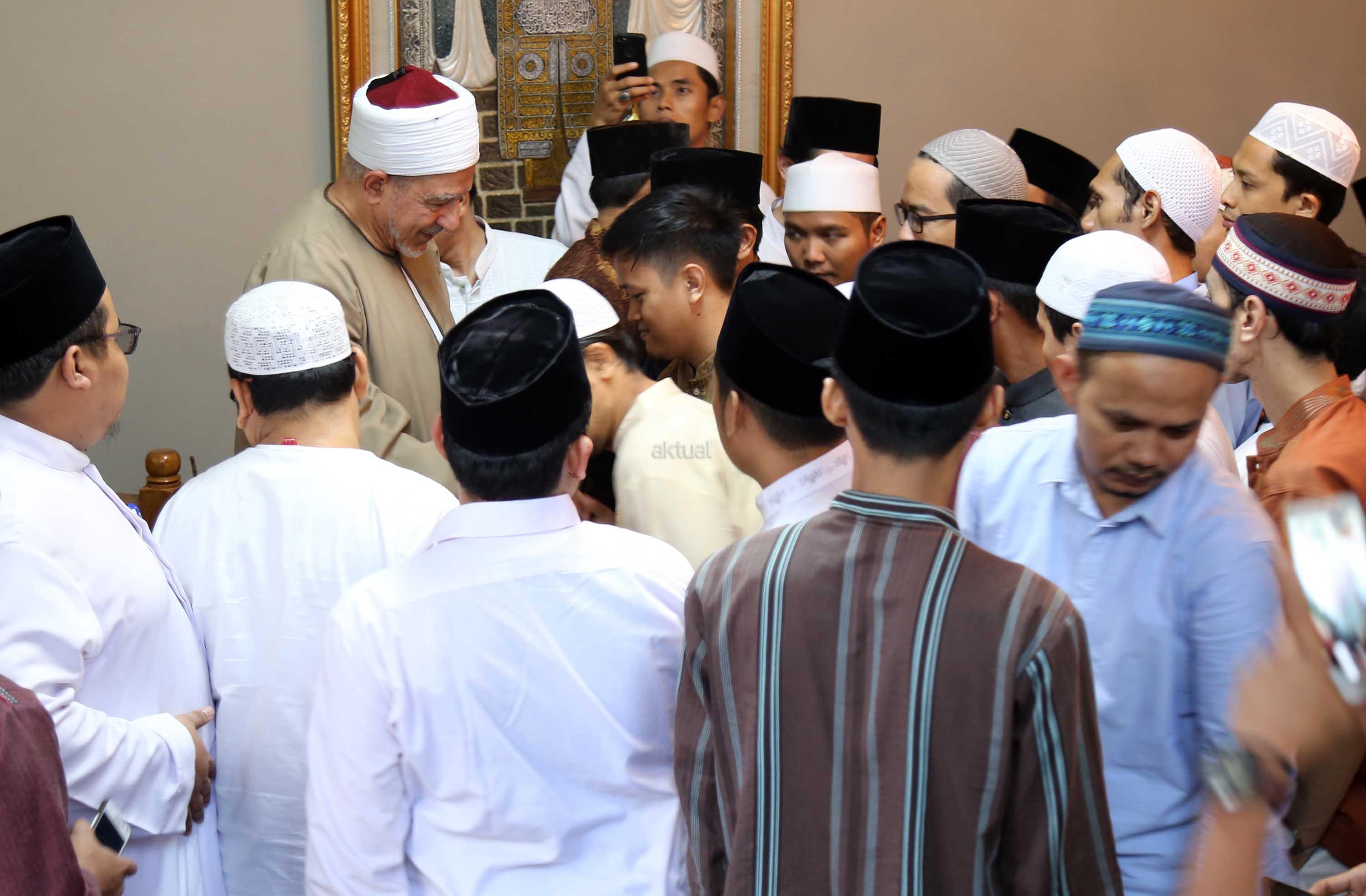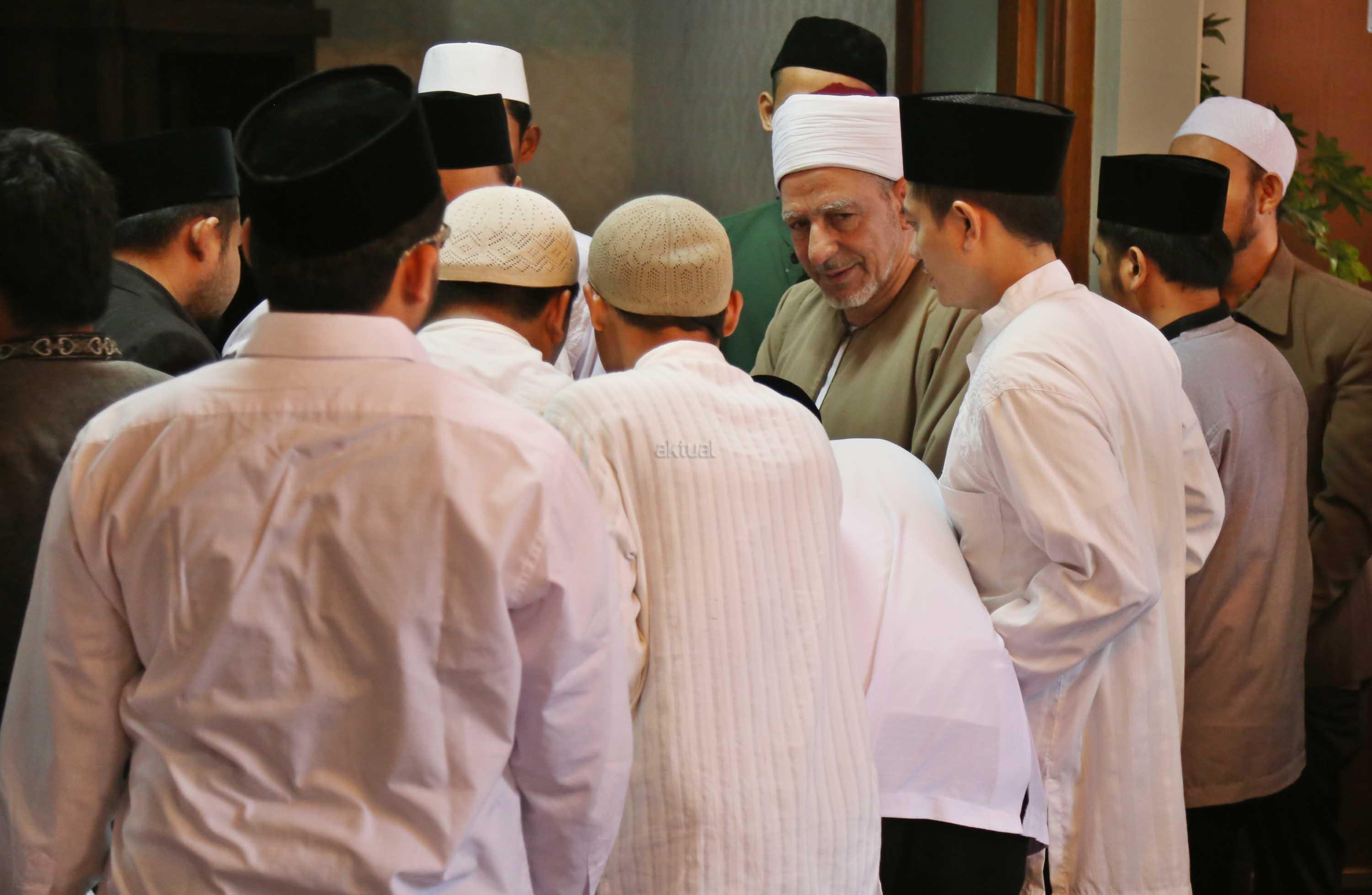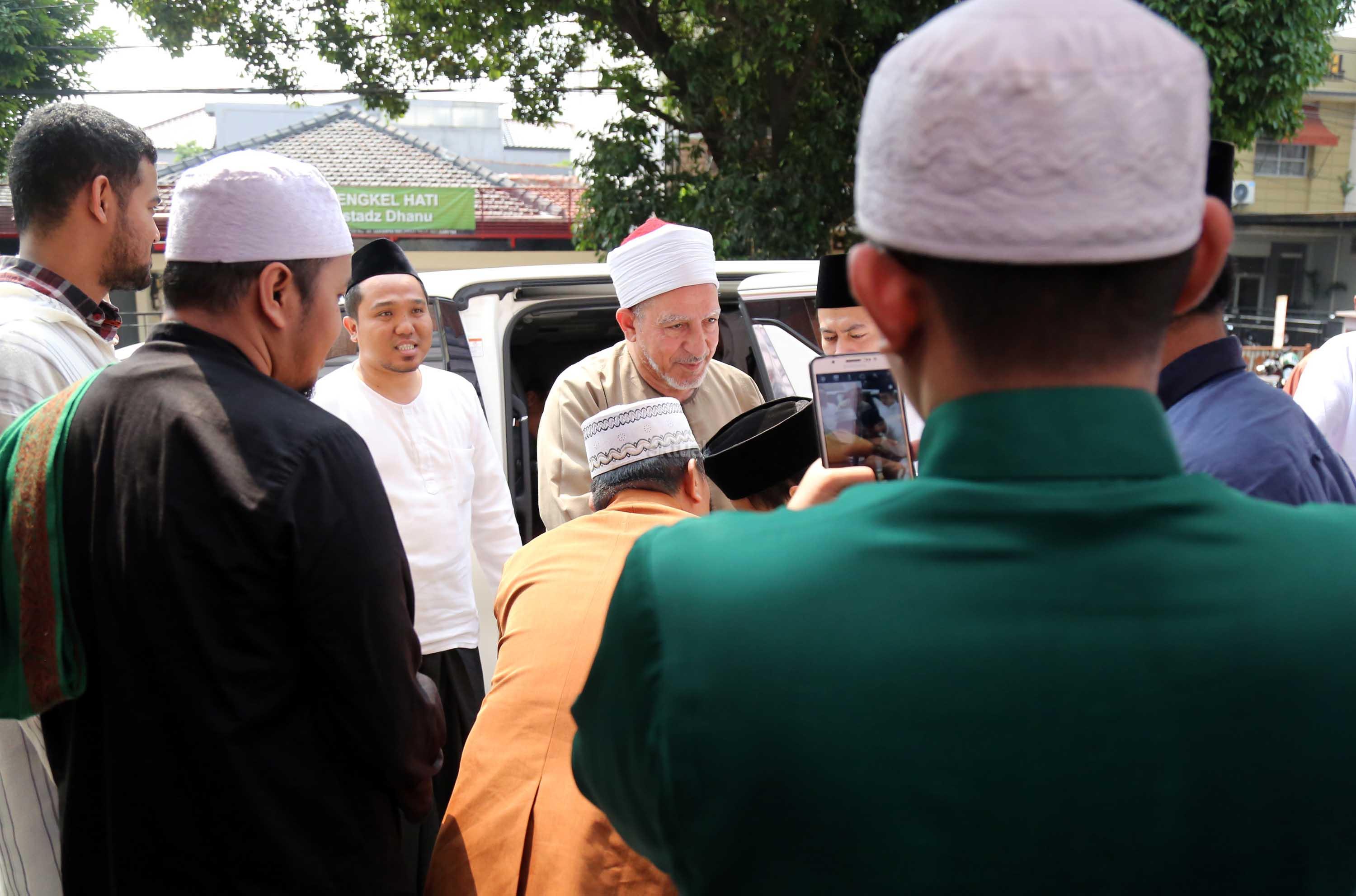 Guru Besar Universitas Al Azhar Kairo Mesir, Al Alim Allamah Syekh Prof. Dr. Fathi Abdurrahman Hijazi Al Azhari An Naqsyabandy disambut saat berkunjung ke Zawiyah Arraudhah di Jakarta, Sabtu (20/5). AKTUAL/Tino Oktaviano