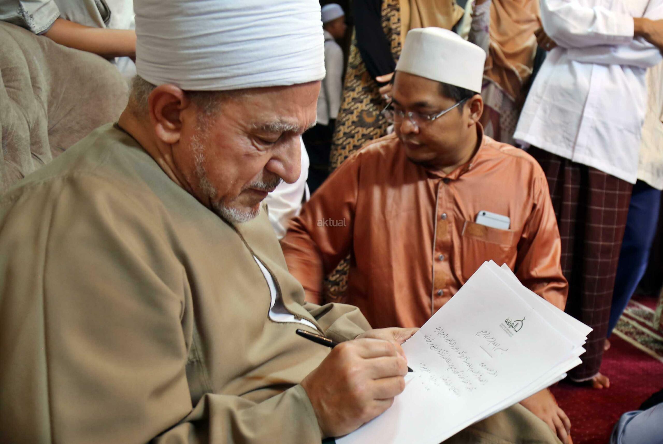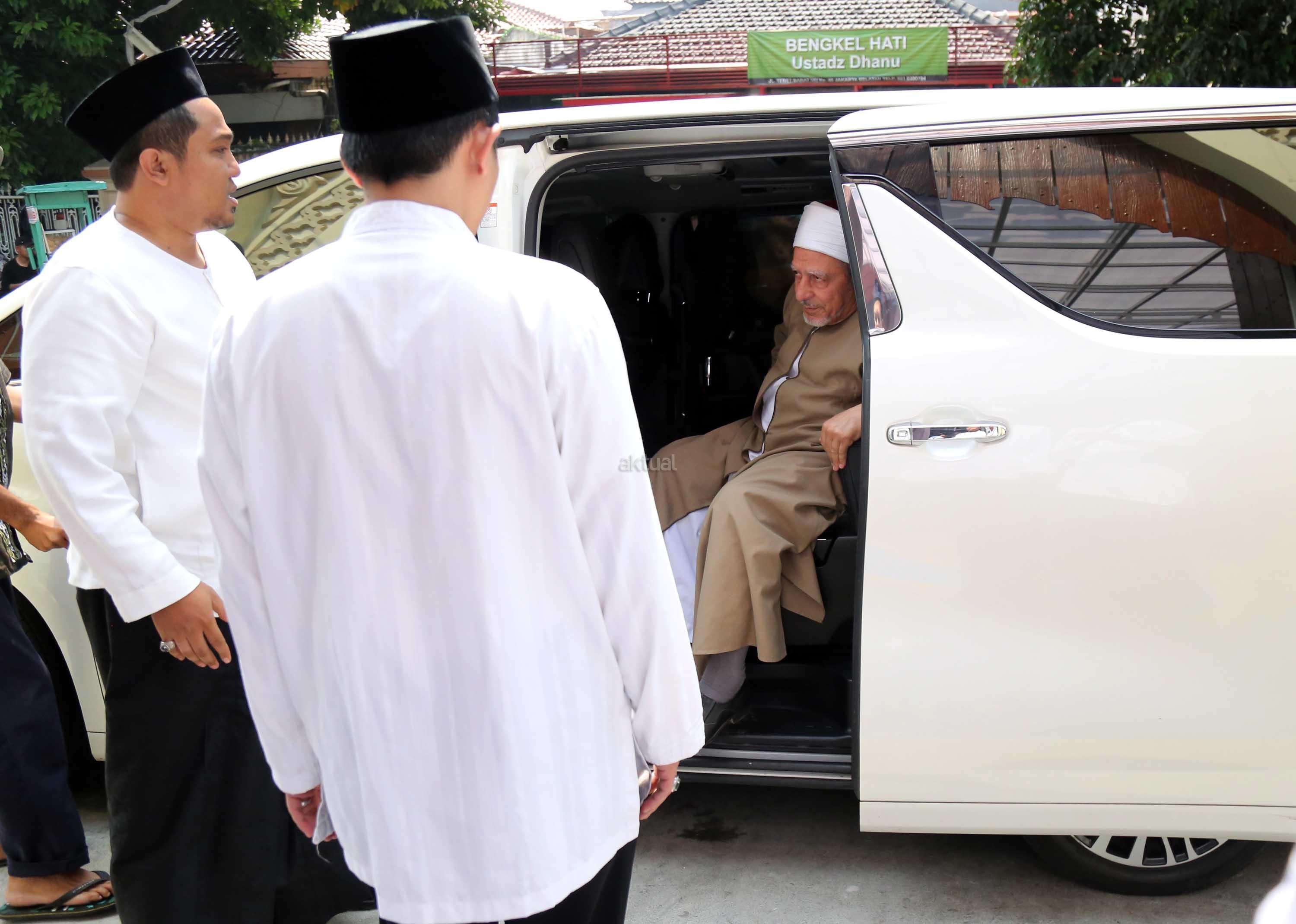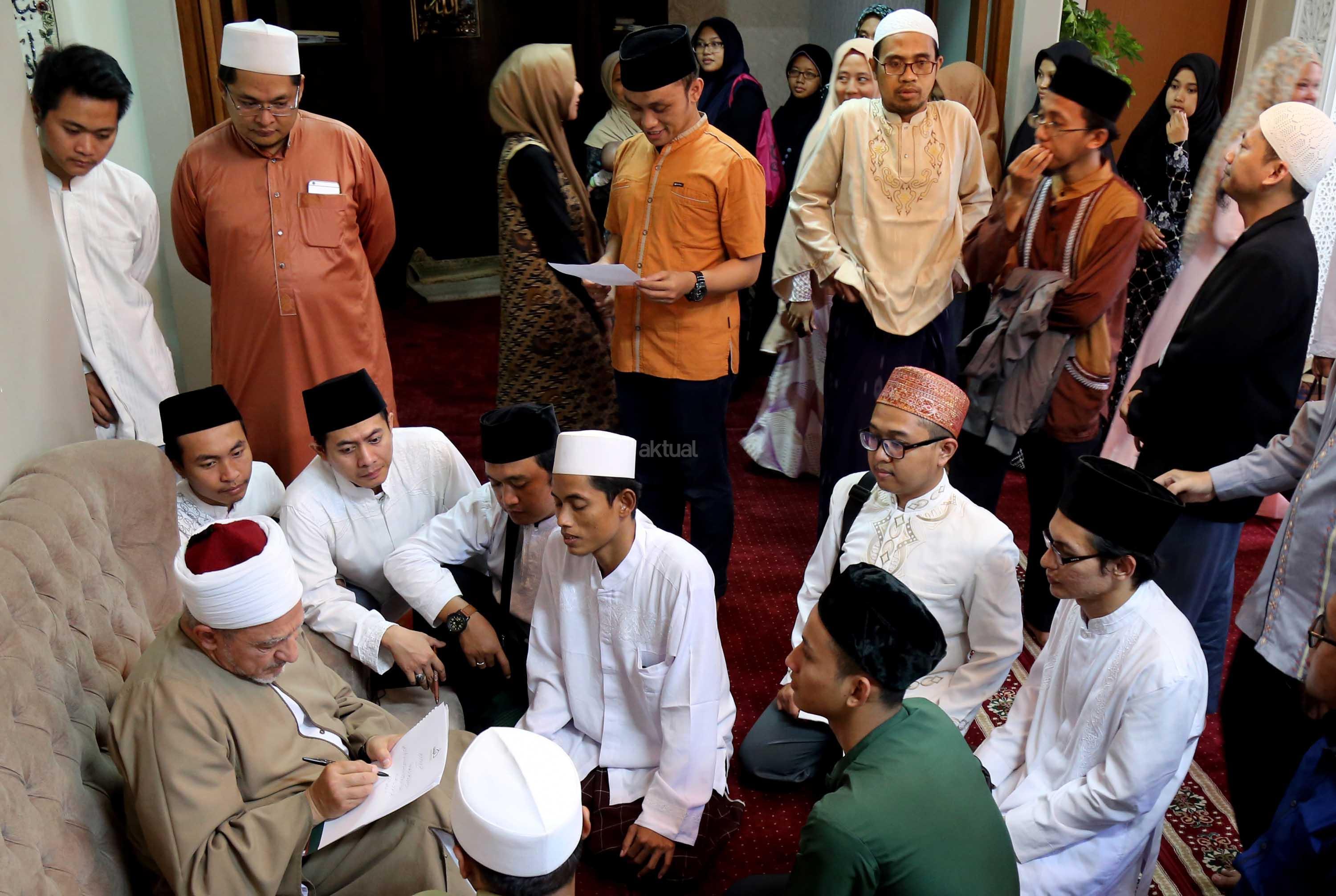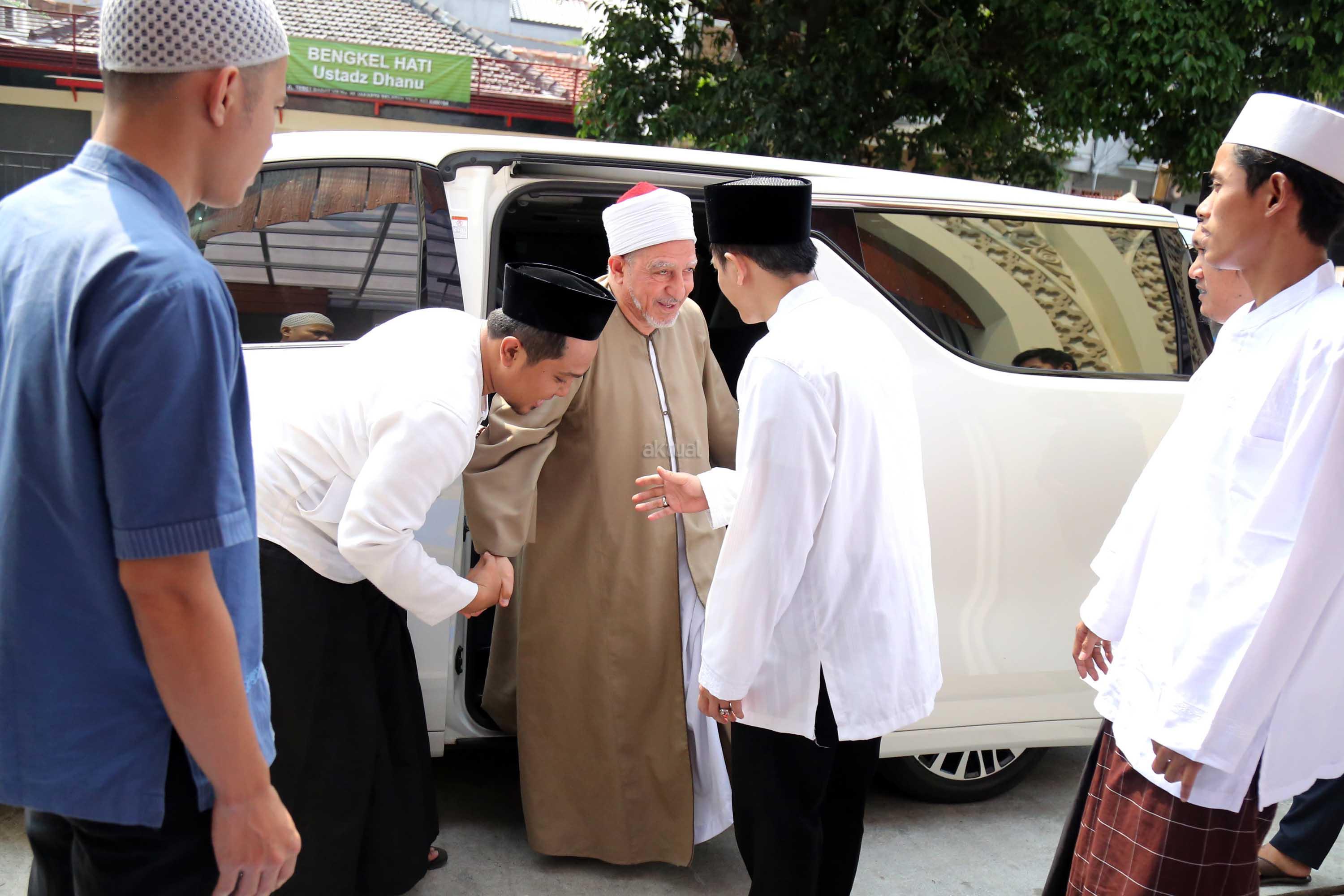 Guru Besar Universitas Al Azhar Kairo Mesir, Al Alim Allamah Syekh Prof. Dr. Fathi Abdurrahman Hijazi Al Azhari An Naqsyabandy disambut saat berkunjung ke Zawiyah Arraudhah di Jakarta, Sabtu (20/5). AKTUAL/Tino Oktaviano