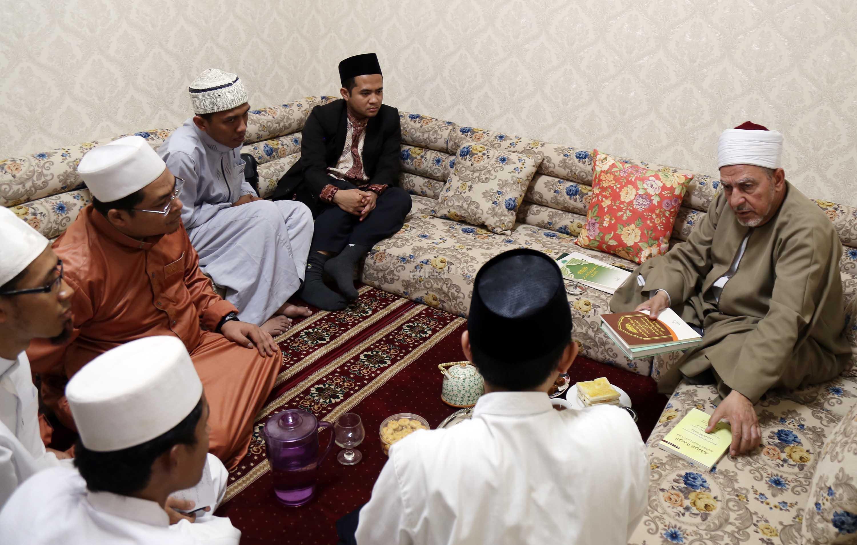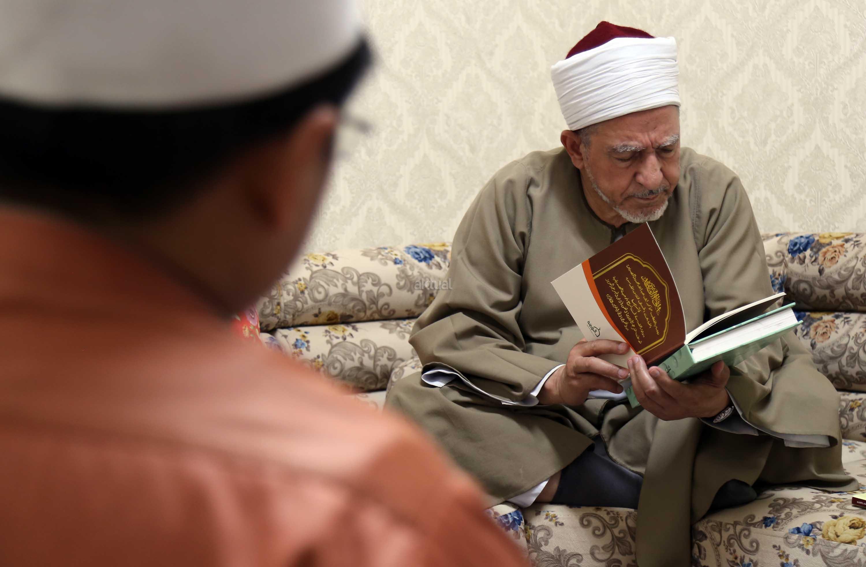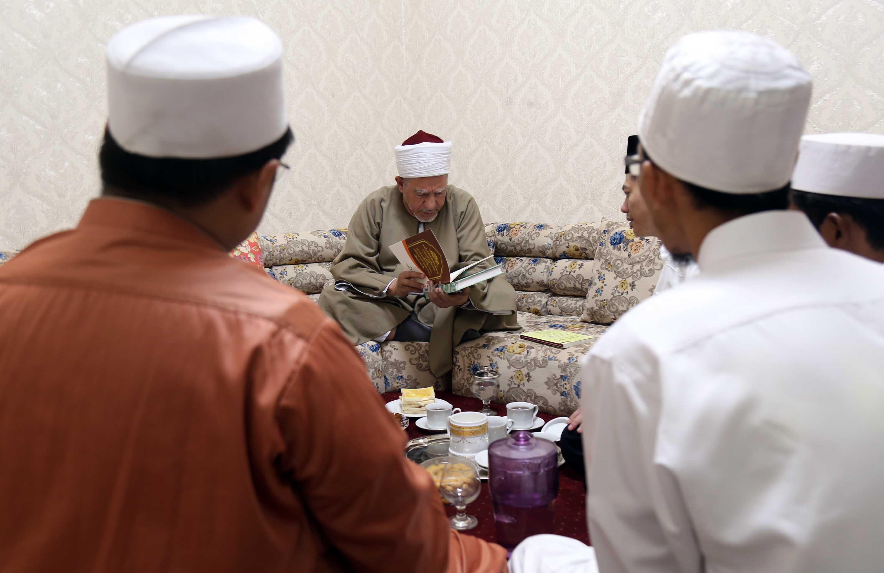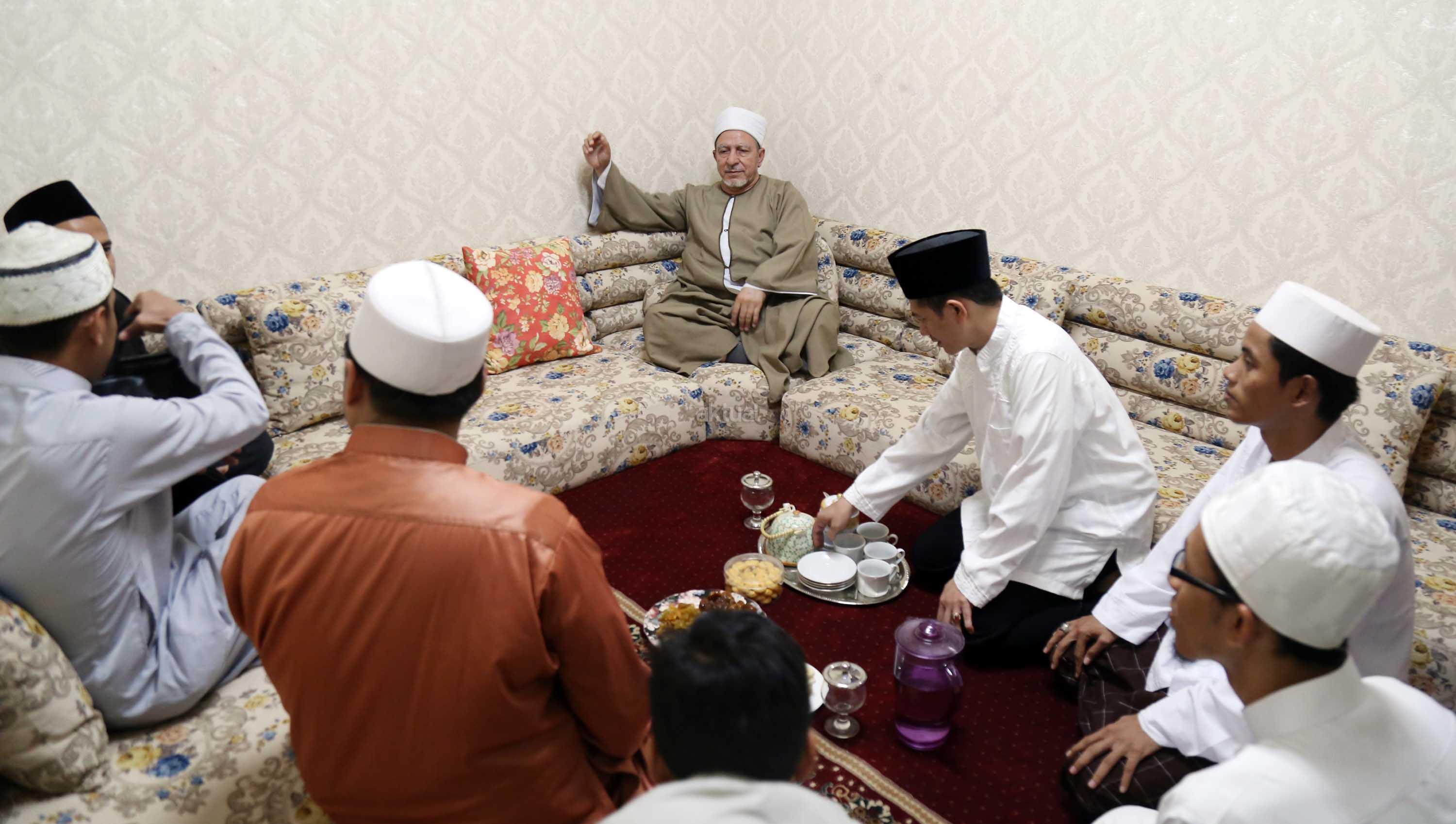 Guru Besar Universitas Al Azhar Kairo Mesir, Al Alim Allamah Syekh Prof. Dr. Fathi Abdurrahman Hijazi Al Azhari An Naqsyabandy berbincang sejenak sebelum mengisi tausiyah saat acara Halaqoh Shufiyah & Dauroh Ilmiyah yang mengambil tema “Telaah Tasawuf dalam Tantangan Zaman” di Zawiyah Arraudhah, Jalan Tebet Barat VII, No 50, Jakarta Selatan, Sabtu (20/5). Beliau menyempatkan diri ke Zawiyah Arraudhah sebelum pulang ke Mesir setelah kunjungan ke pondok Leler dan bertemu KH. Maimoen Zubair. AKTUAL/Tino Oktaviano