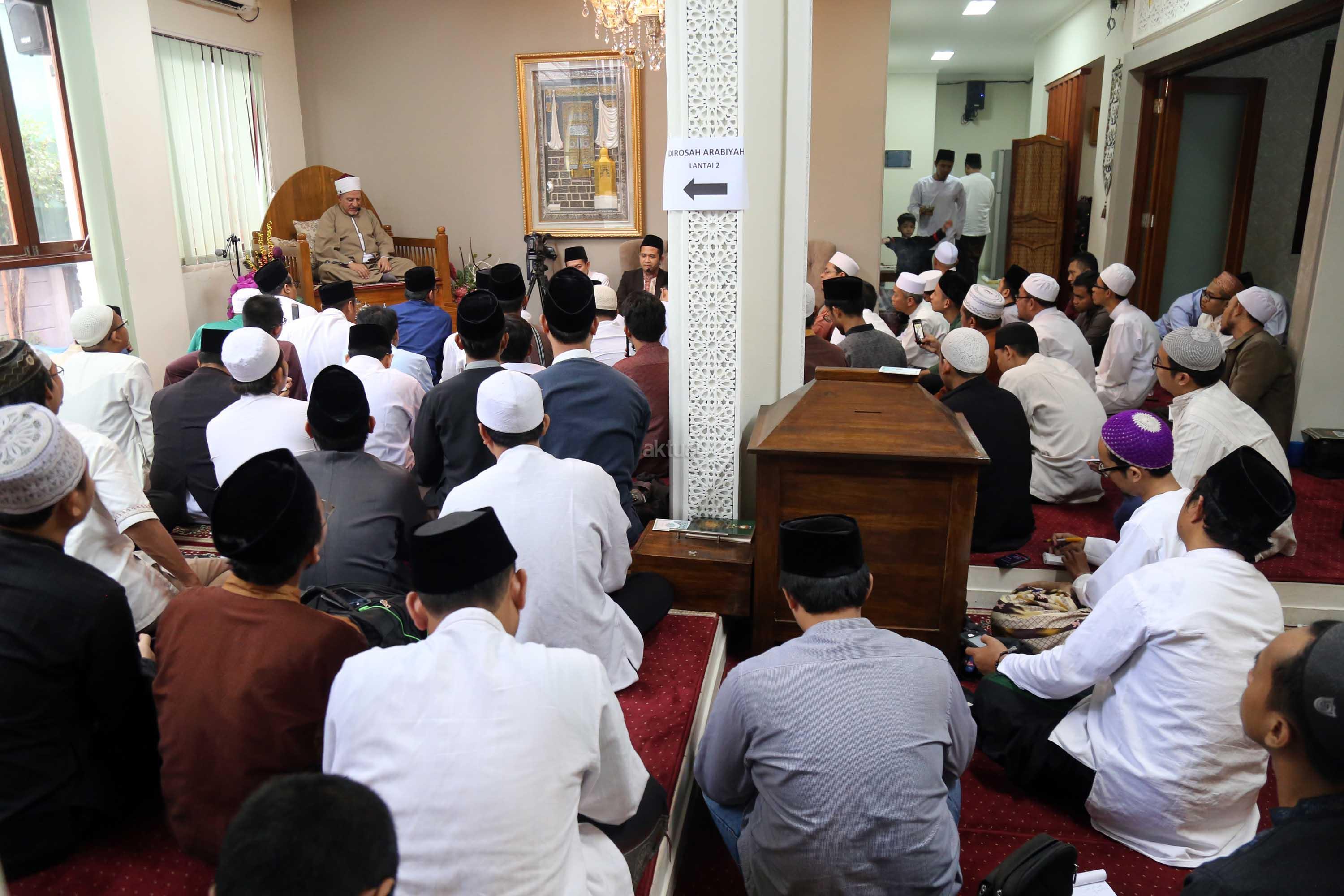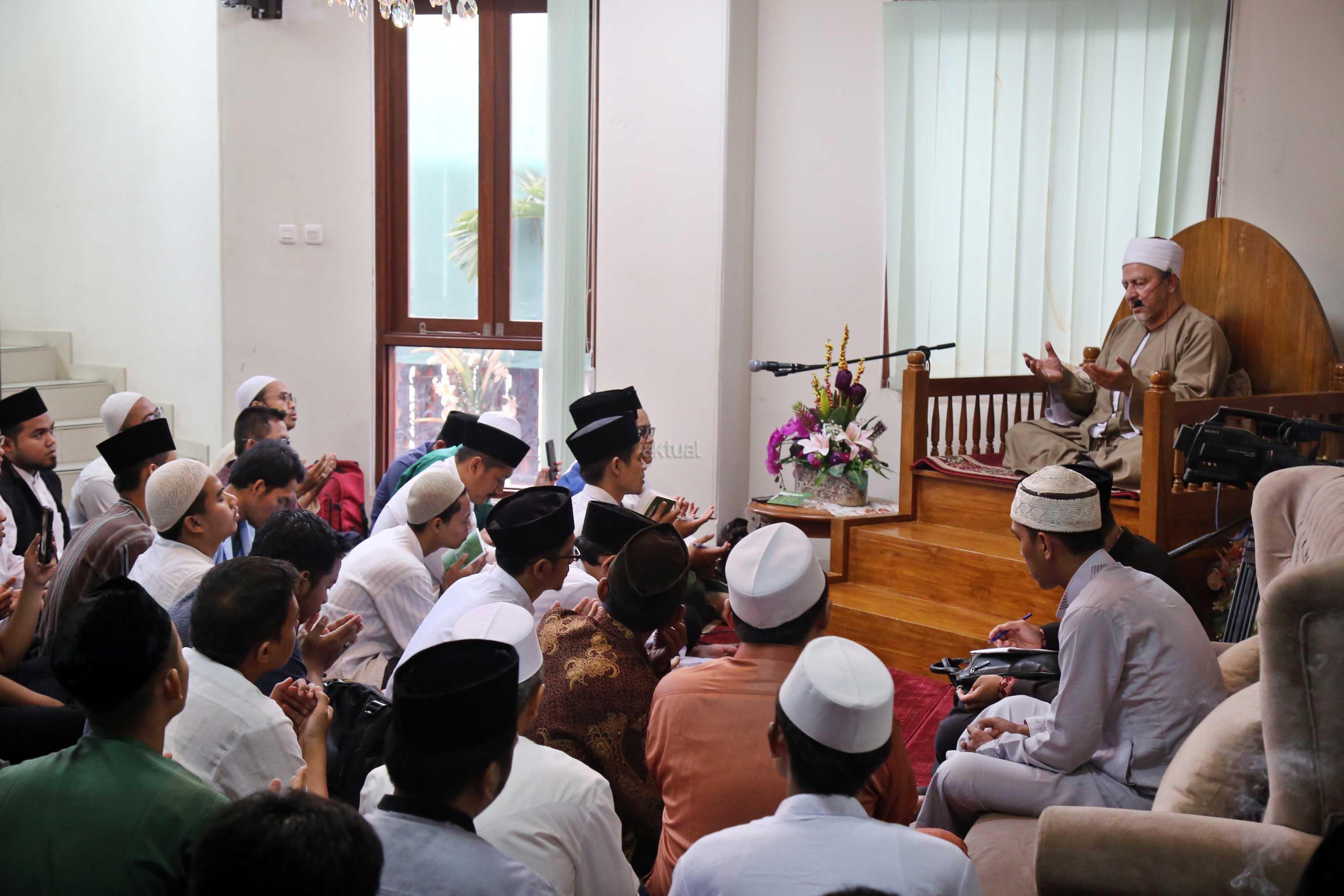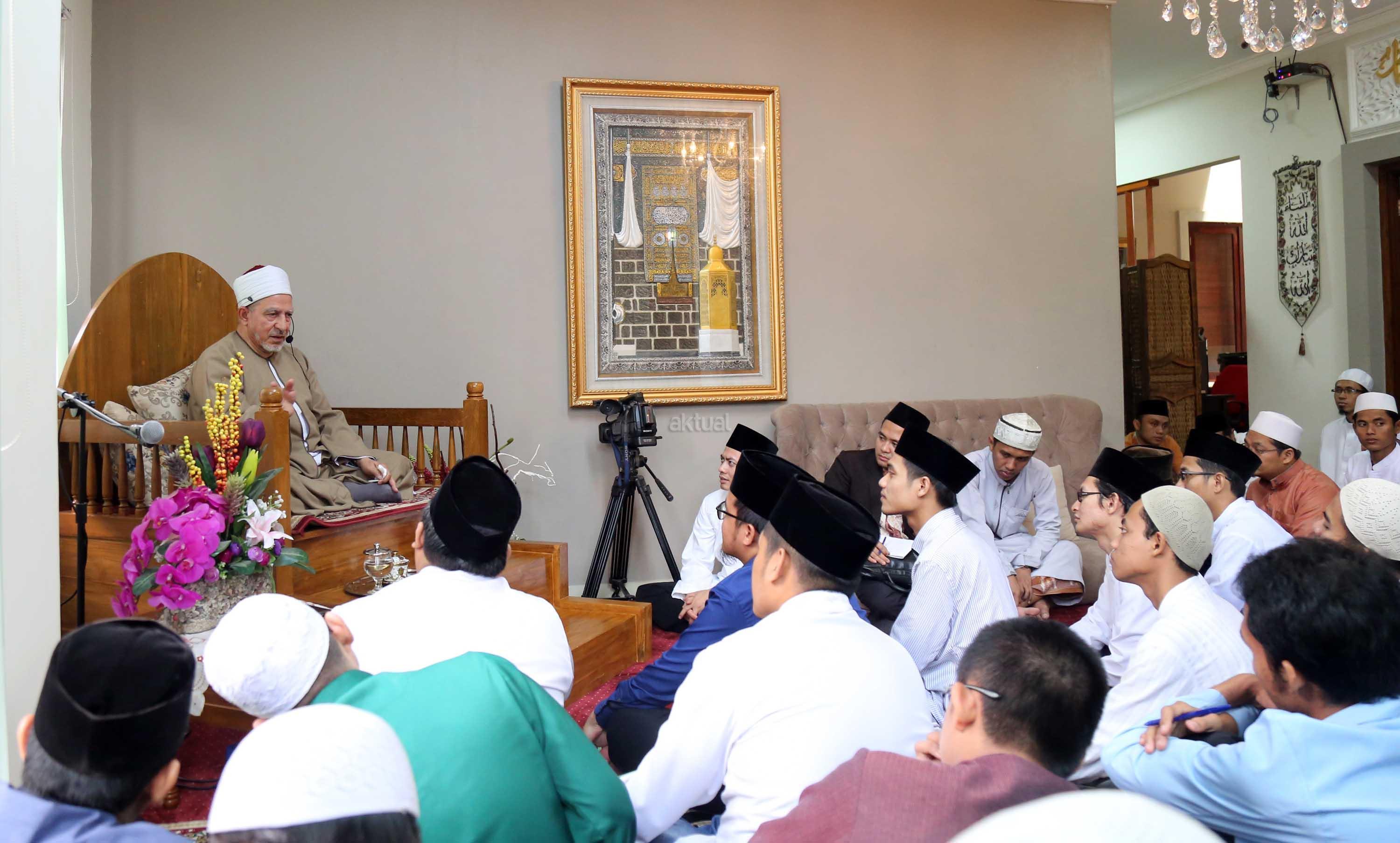 Guru Besar Universitas Al Azhar Kairo Mesir, Al Alim Allamah Syekh Prof. Dr. Fathi Abdurrahman Hijazi Al Azhari An Naqsyabandy saat menyampaikan tausiyah saat acara Halaqoh Shufiyah & Dauroh Ilmiyah yang mengambil tema "Telaah Tasawuf dalam Tantangan Zaman" di Zawiyah Arraudhah, Jalan Tebet Barat VII, No 50, Jakarta Selatan, Sabtu (20/5). Beliau menyempatkan diri ke Zawiyah Arraudhah sebelum pulang ke Mesir setelah kunjungan ke pondok Leler dan bertemu KH. Maimoen Zubair. AKTUAL/Tino Oktaviano