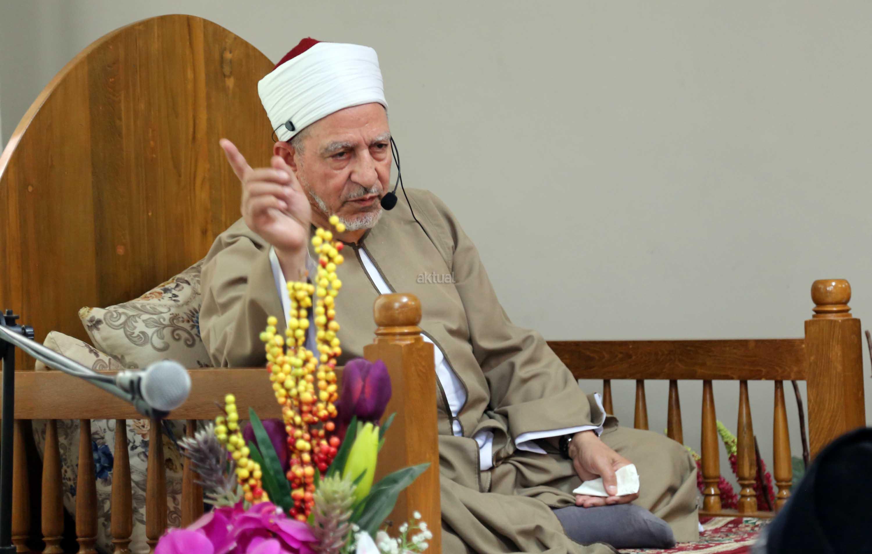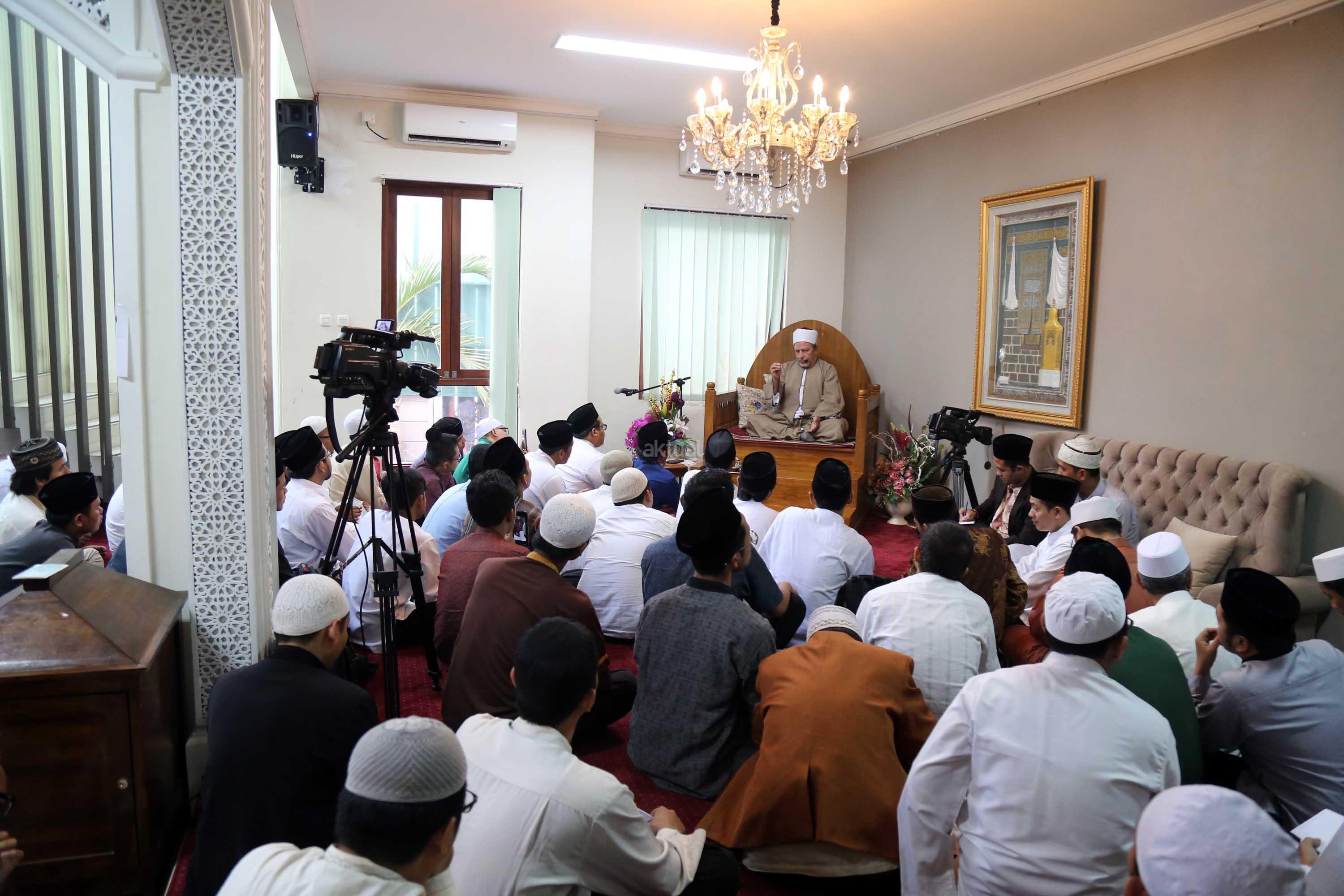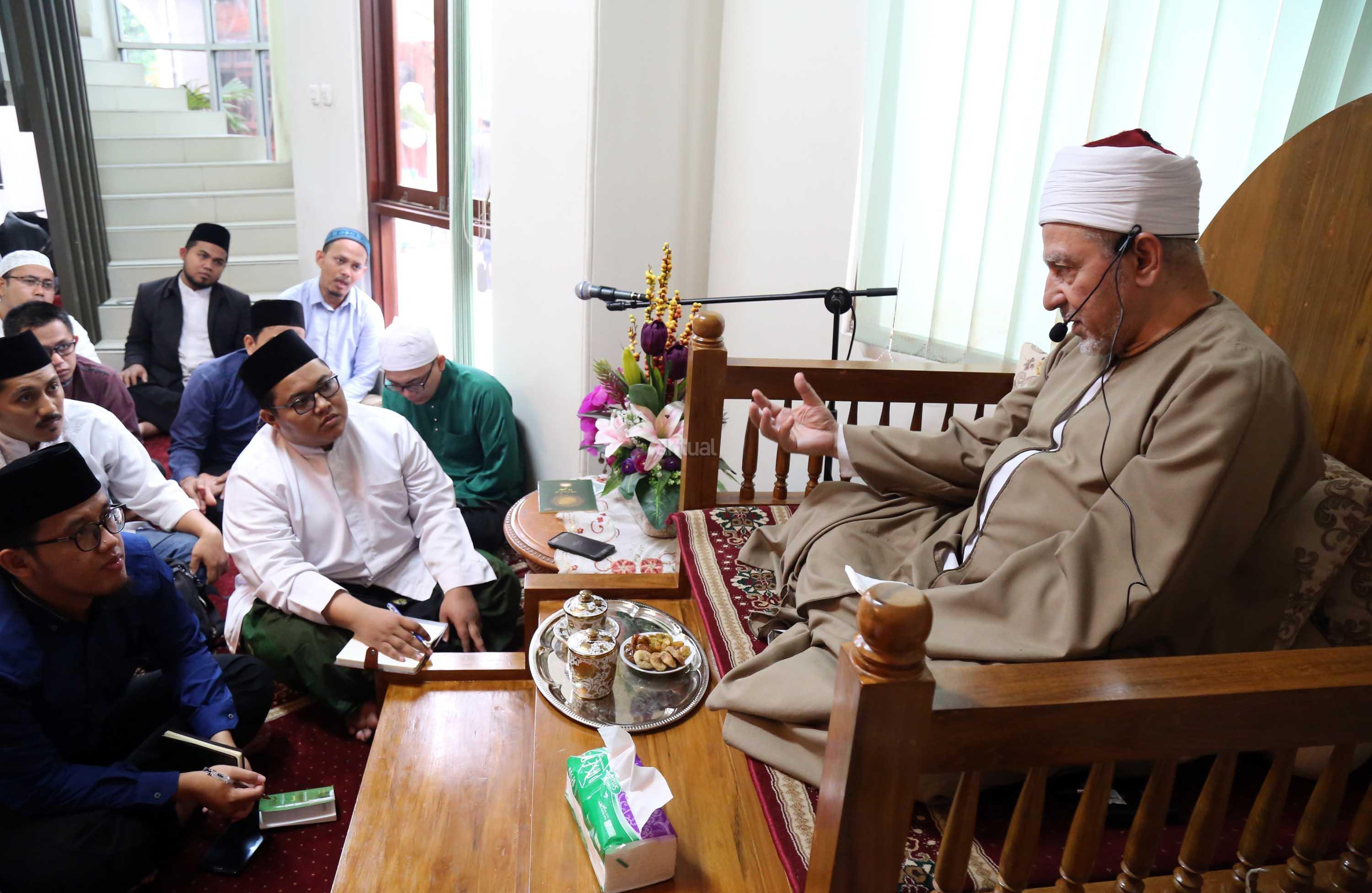 Guru Besar Universitas Al Azhar Kairo Mesir, Al Alim Allamah Syekh Prof. Dr. Fathi Abdurrahman Hijazi Al Azhari An Naqsyabandy saat menyampaikan tausiyah saat acara Halaqoh Shufiyah & Dauroh Ilmiyah yang mengambil tema "Telaah Tasawuf dalam Tantangan Zaman" di Zawiyah Arraudhah, Jalan Tebet Barat VII, No 50, Jakarta Selatan, Sabtu (20/5). Beliau menyempatkan diri ke Zawiyah Arraudhah sebelum pulang ke Mesir setelah kunjungan ke pondok Leler dan bertemu KH. Maimoen Zubair. AKTUAL/Tino Oktaviano