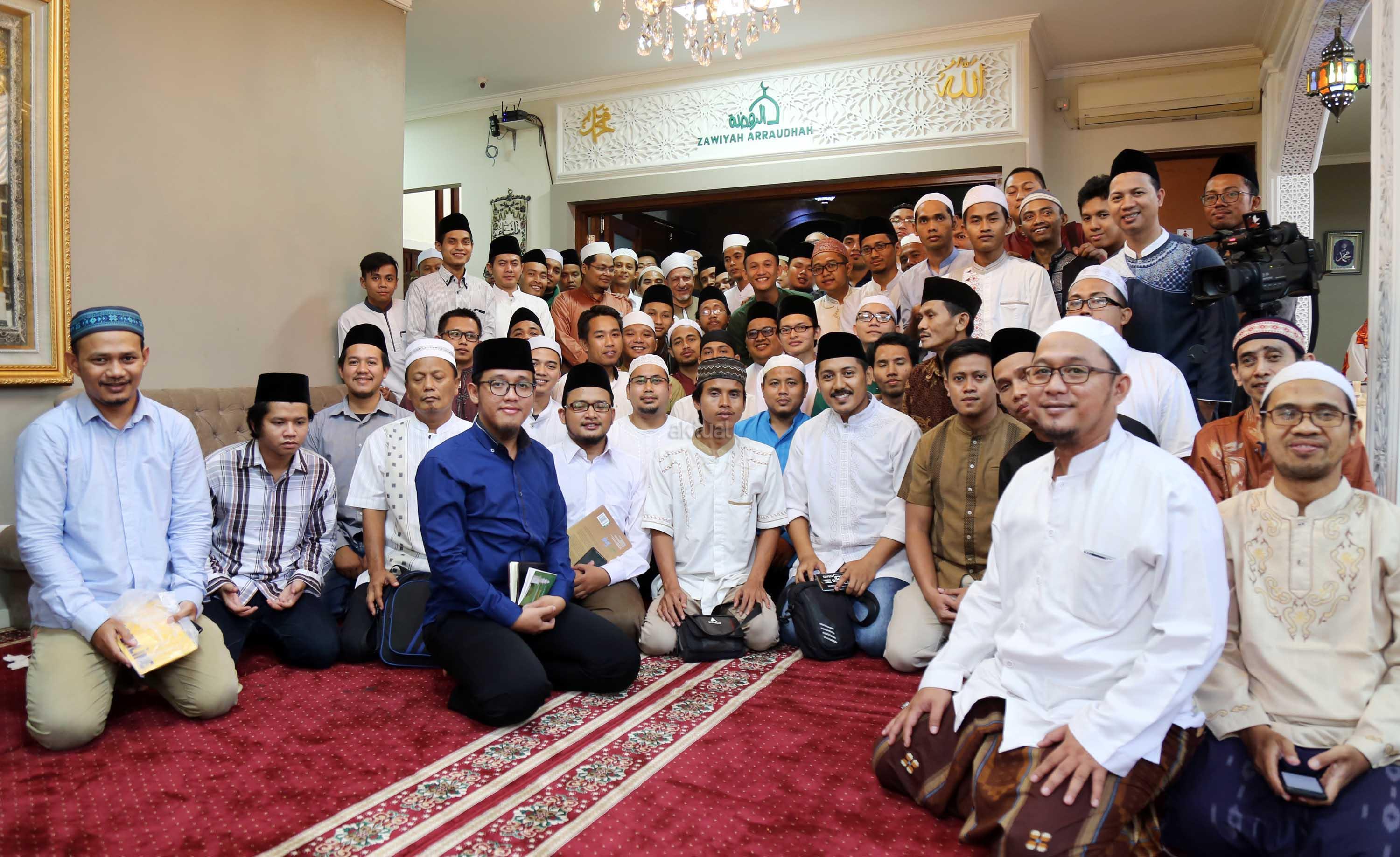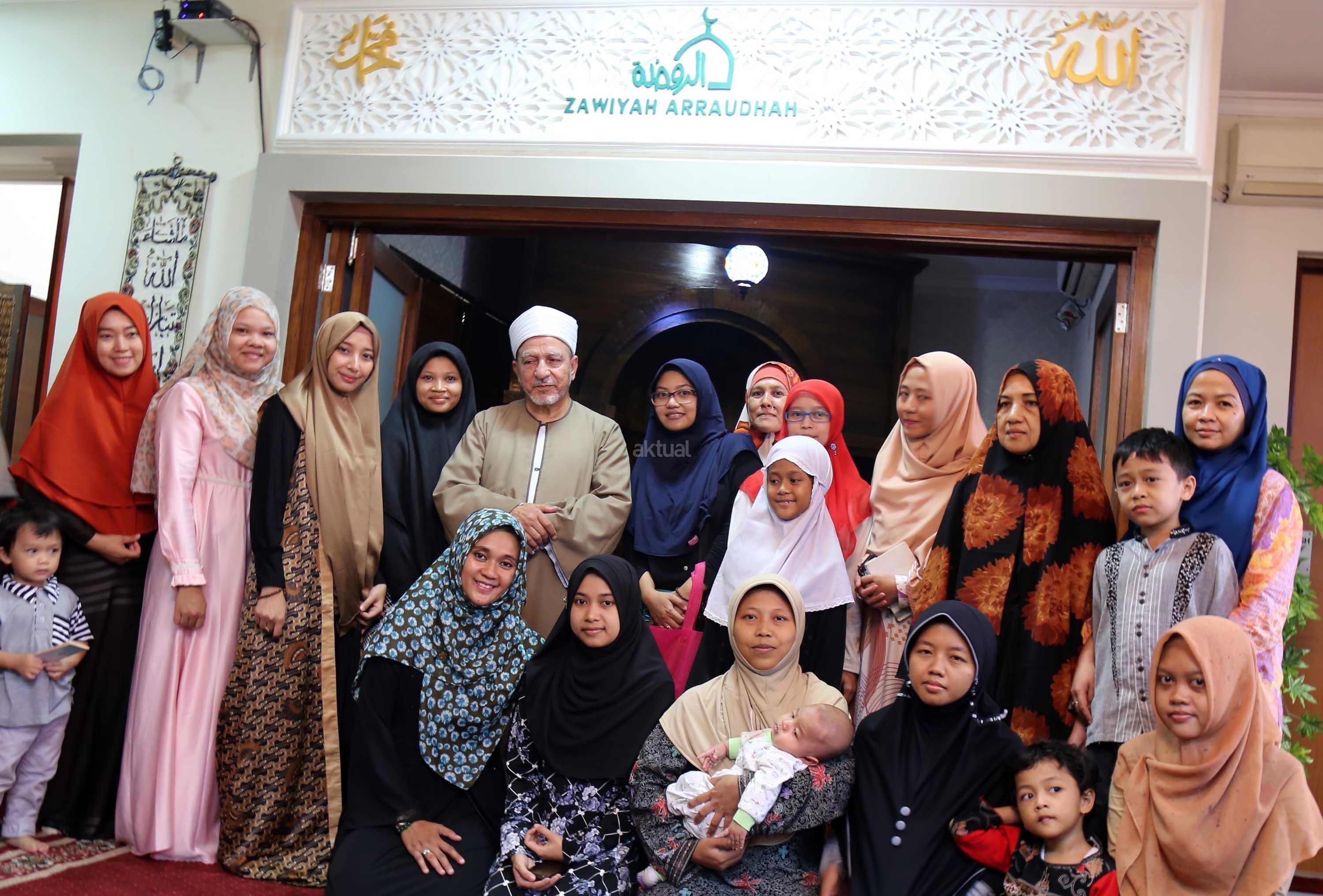 Guru Besar Universitas Al Azhar Kairo Mesir, Al Alim Allamah Syekh Prof. Dr. Fathi Abdurrahman Hijazi Al Azhari An Naqsyabandy foto bersama peserta dan panitia usai mengisi tausiyah saat acara Halaqoh Shufiyah & Dauroh Ilmiyah yang mengambil tema “Telaah Tasawuf dalam Tantangan Zaman” di Zawiyah Arraudhah, Jalan Tebet Barat VII, No 50, Jakarta Selatan, Sabtu (20/5). Beliau menyempatkan diri ke Zawiyah Arraudhah sebelum pulang ke Mesir setelah kunjungan ke pondok Leler dan bertemu KH. Maimoen Zubair. AKTUAL/Tino Oktaviano