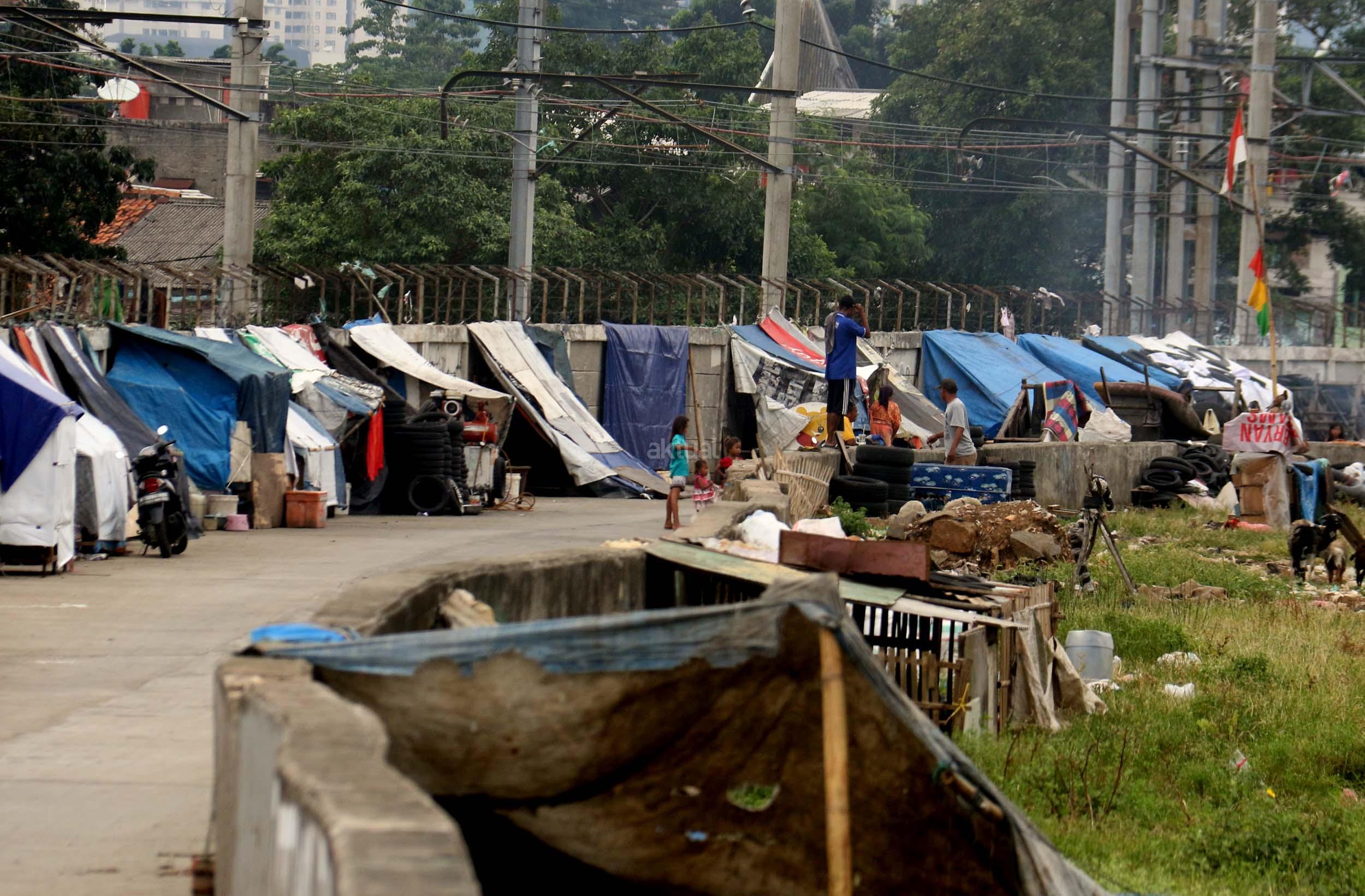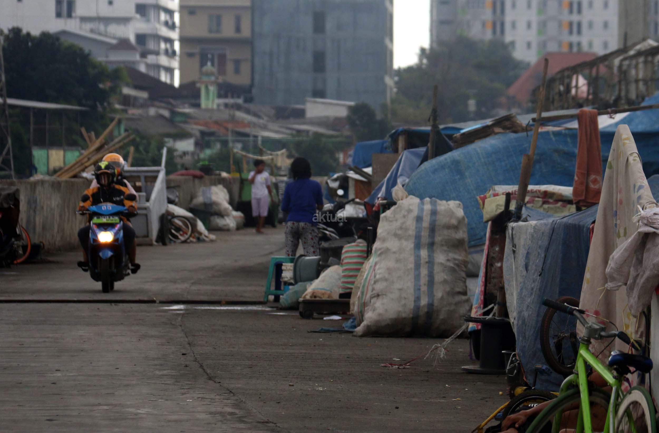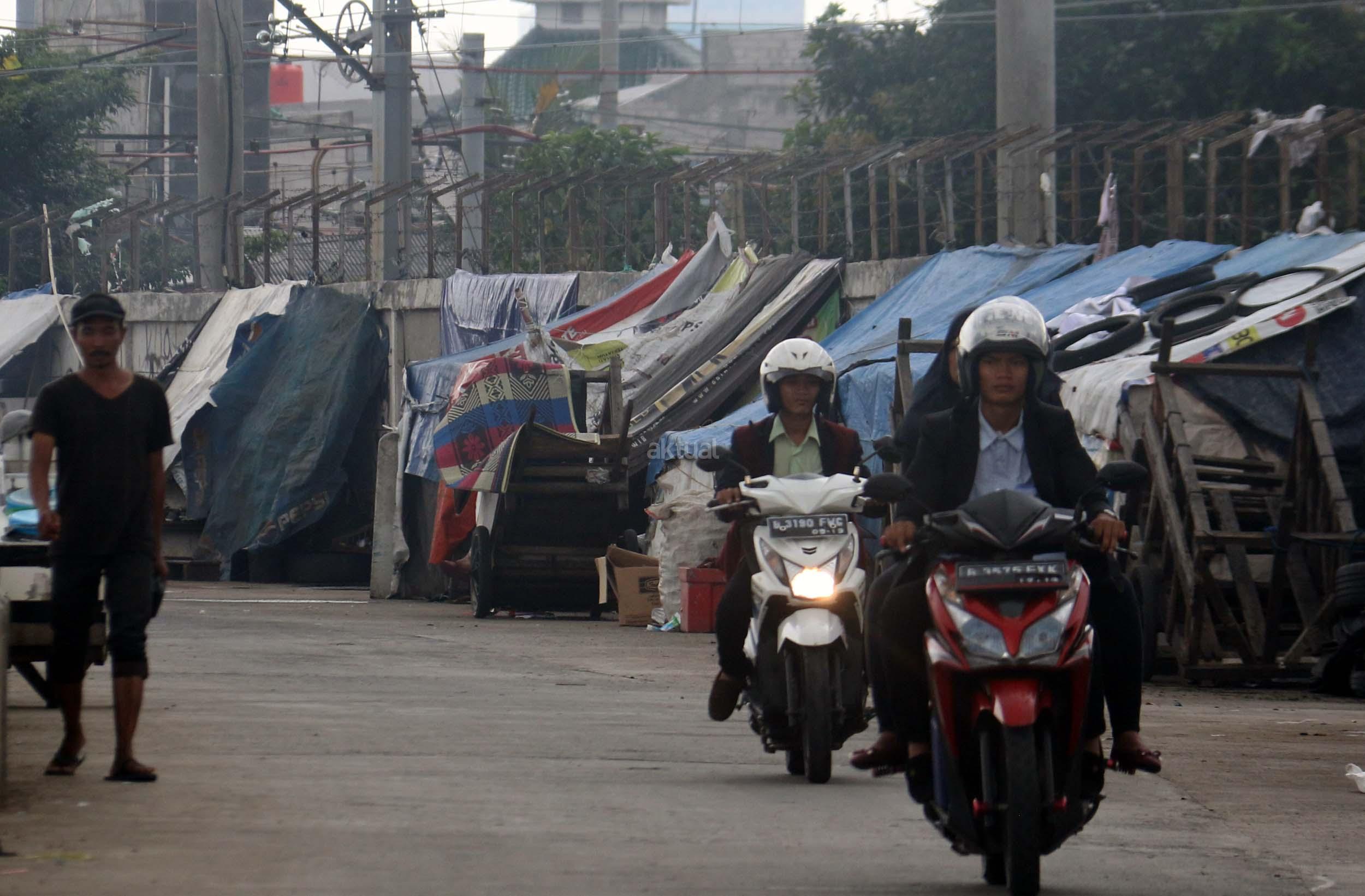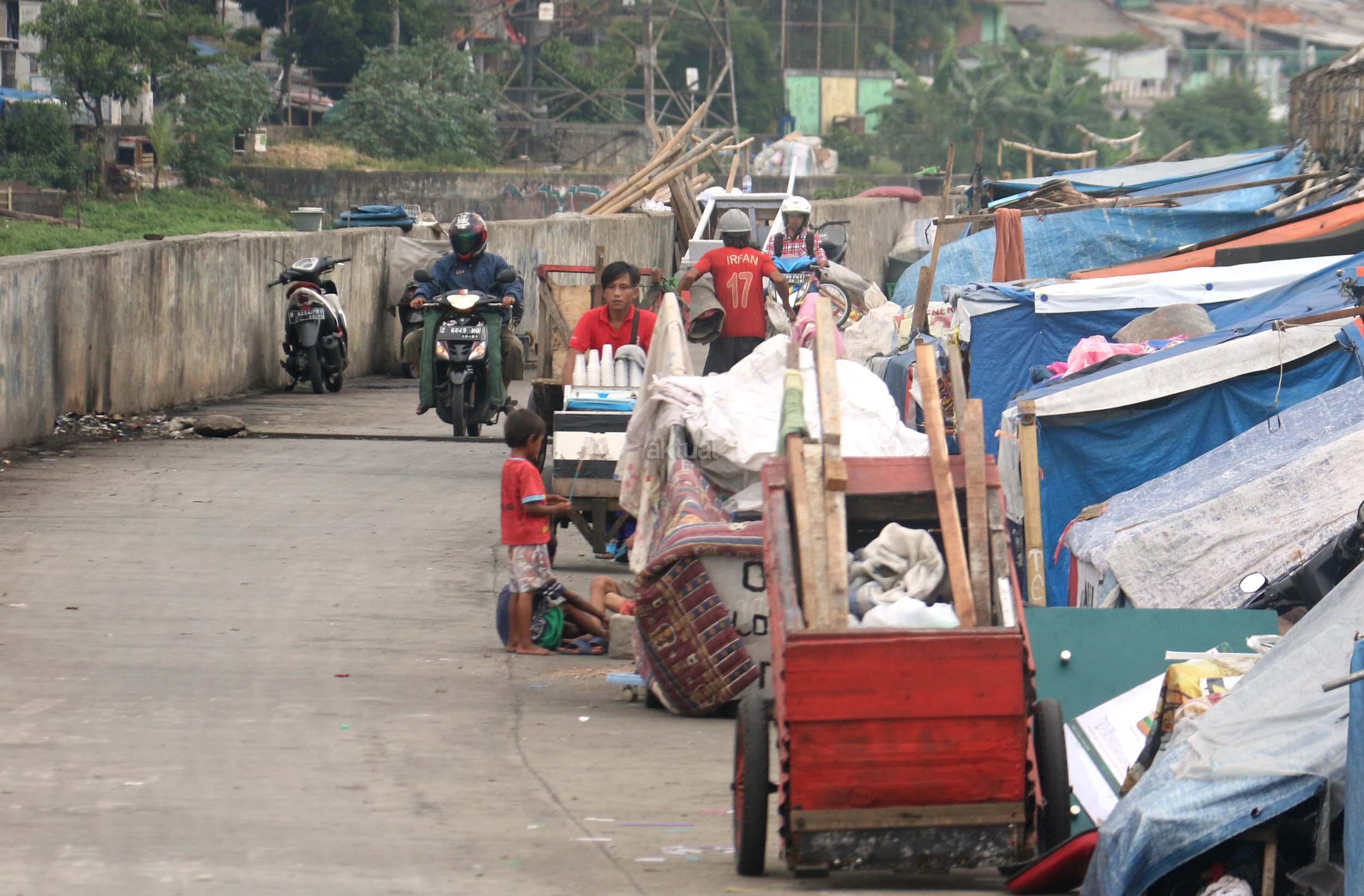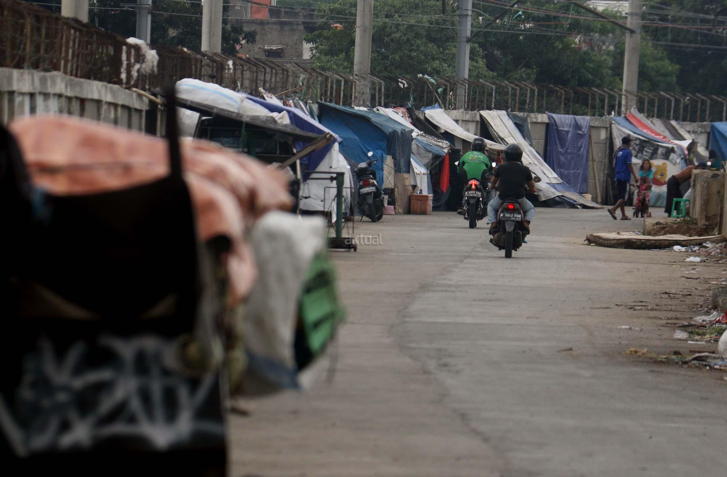 Motor melintas didepan gubuk liar memadati jalur inspeksi kanal banjir barat (KBB) di kawasan Kebon Melati, Jakarta Pusat, Rabu (4/1/2017). Sebanyak 48,91 persen penduduk Daerah Khusus Ibukota (DKI) Jakarta tidak mempunyai tempat tempat tinggal milik sendiri. Badan Pusat Statistik (BPS) terbitan tahun 2016 mencatat DKI Jakarta merupakan provinsi dengan kepadatan penduduk tertinggi di Indonesia, mencapai 15.328 jiwa per km2. AKTUAL/Munzir