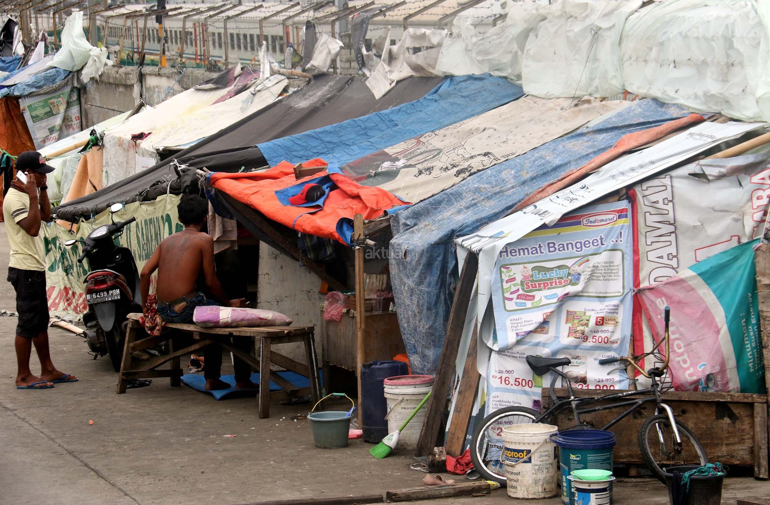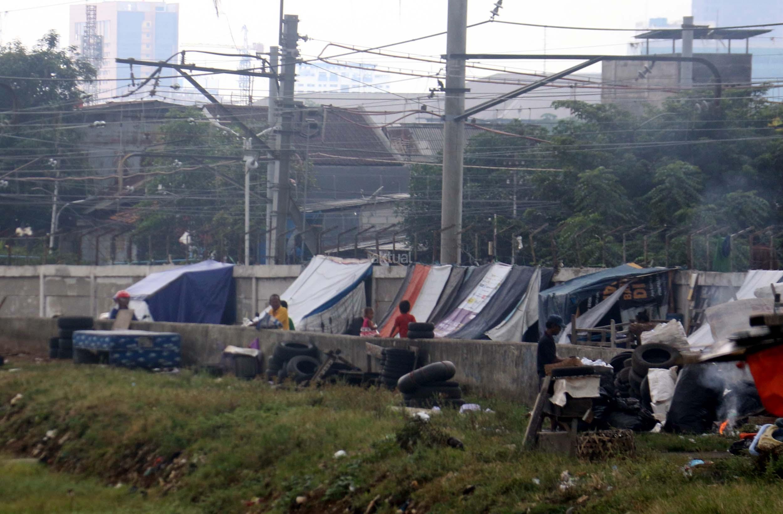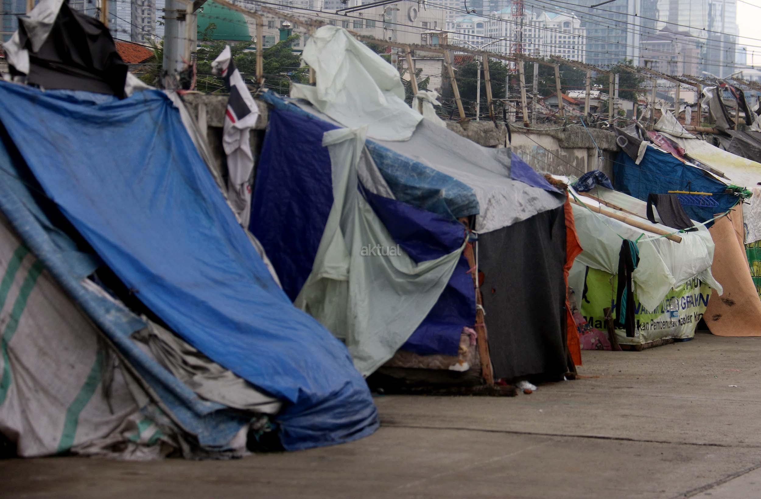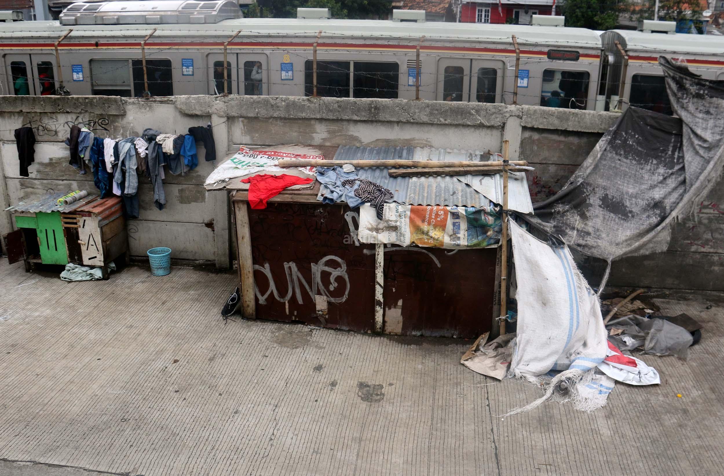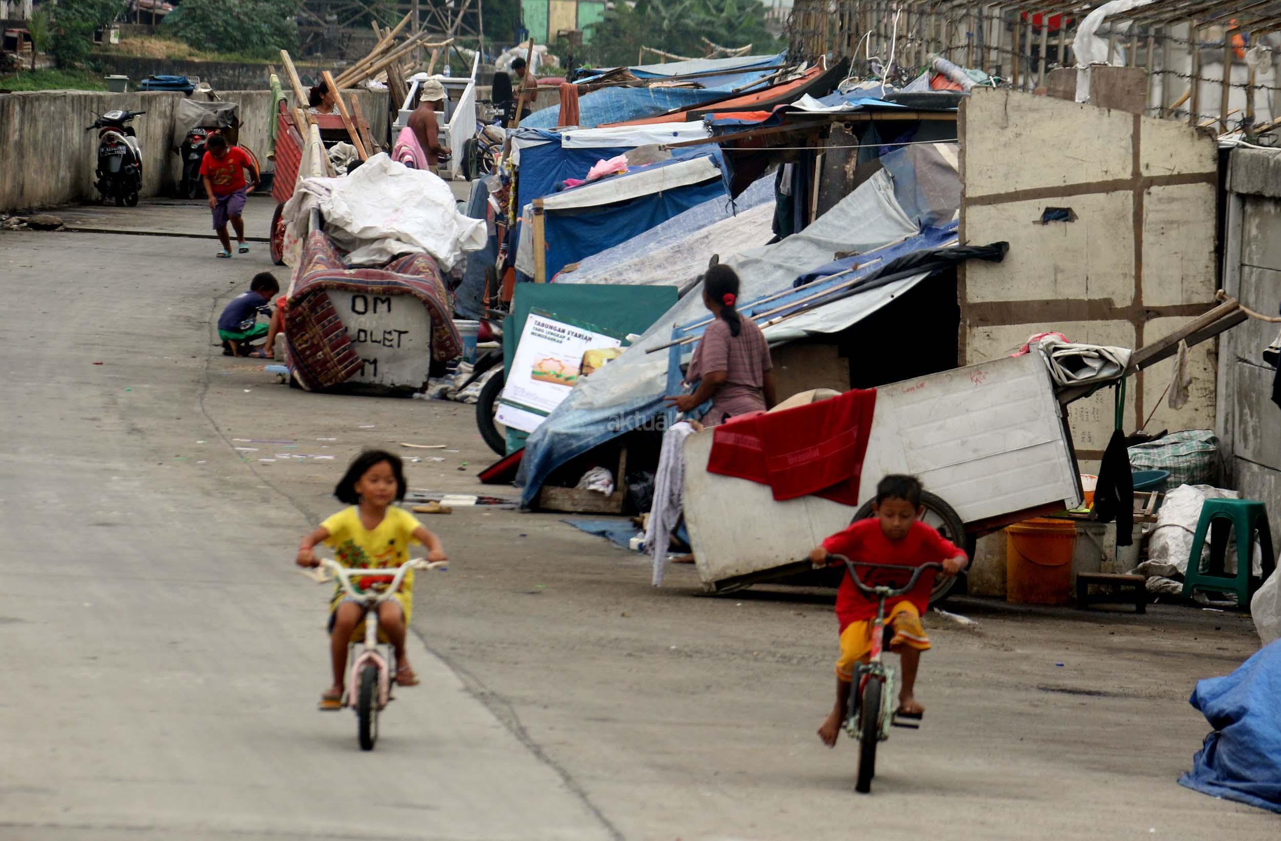 Motor melintas didepan gubuk liar memadati jalur inspeksi kanal banjir barat (KBB) di kawasan Kebon Melati, Jakarta Pusat, Rabu (4/1/2017). Sebanyak 48,91 persen penduduk Daerah Khusus Ibukota (DKI) Jakarta tidak mempunyai tempat tempat tinggal milik sendiri. Badan Pusat Statistik (BPS) terbitan tahun 2016 mencatat DKI Jakarta merupakan provinsi dengan kepadatan penduduk tertinggi di Indonesia, mencapai 15.328 jiwa per km2. AKTUAL/Munzir