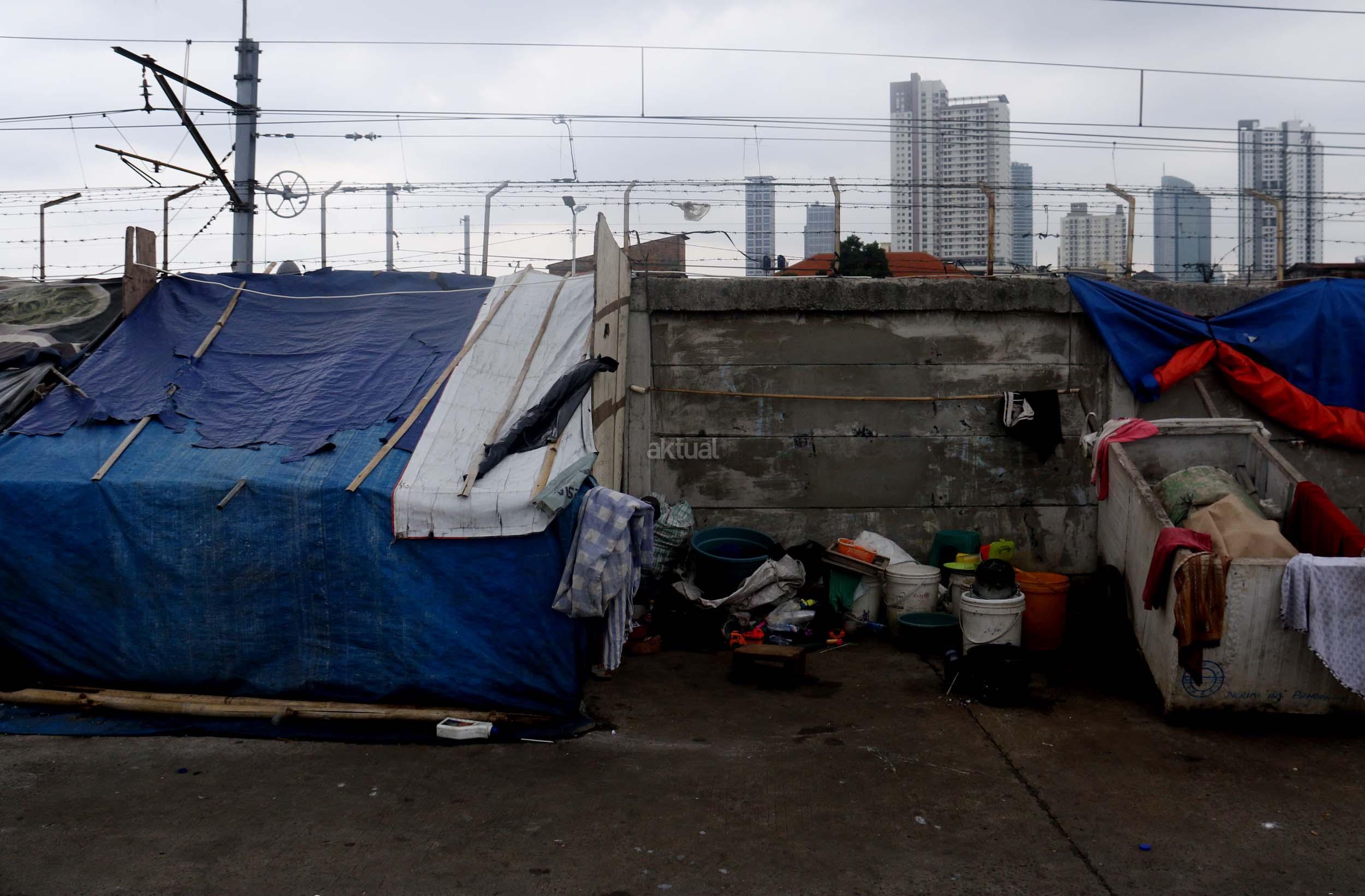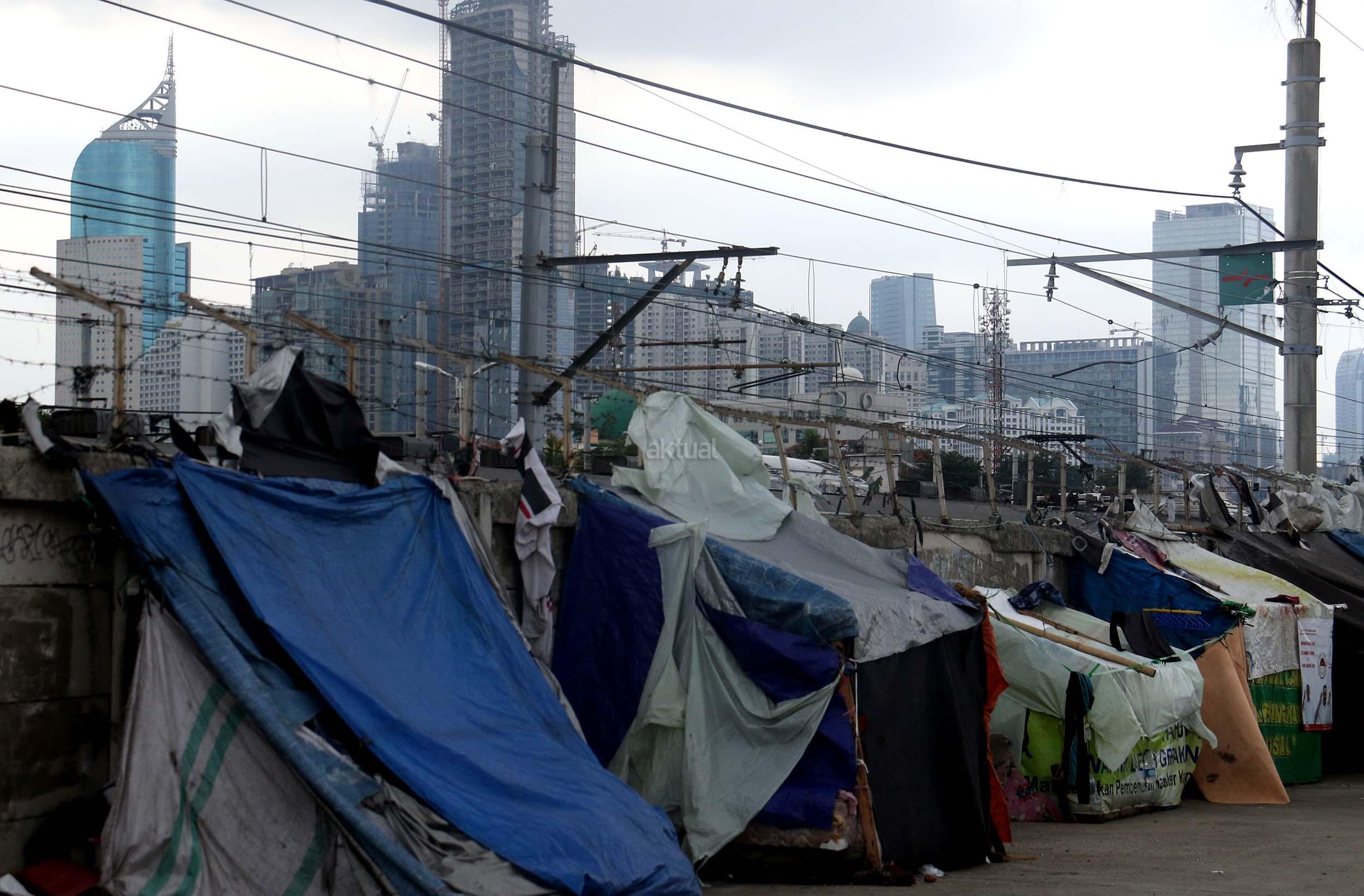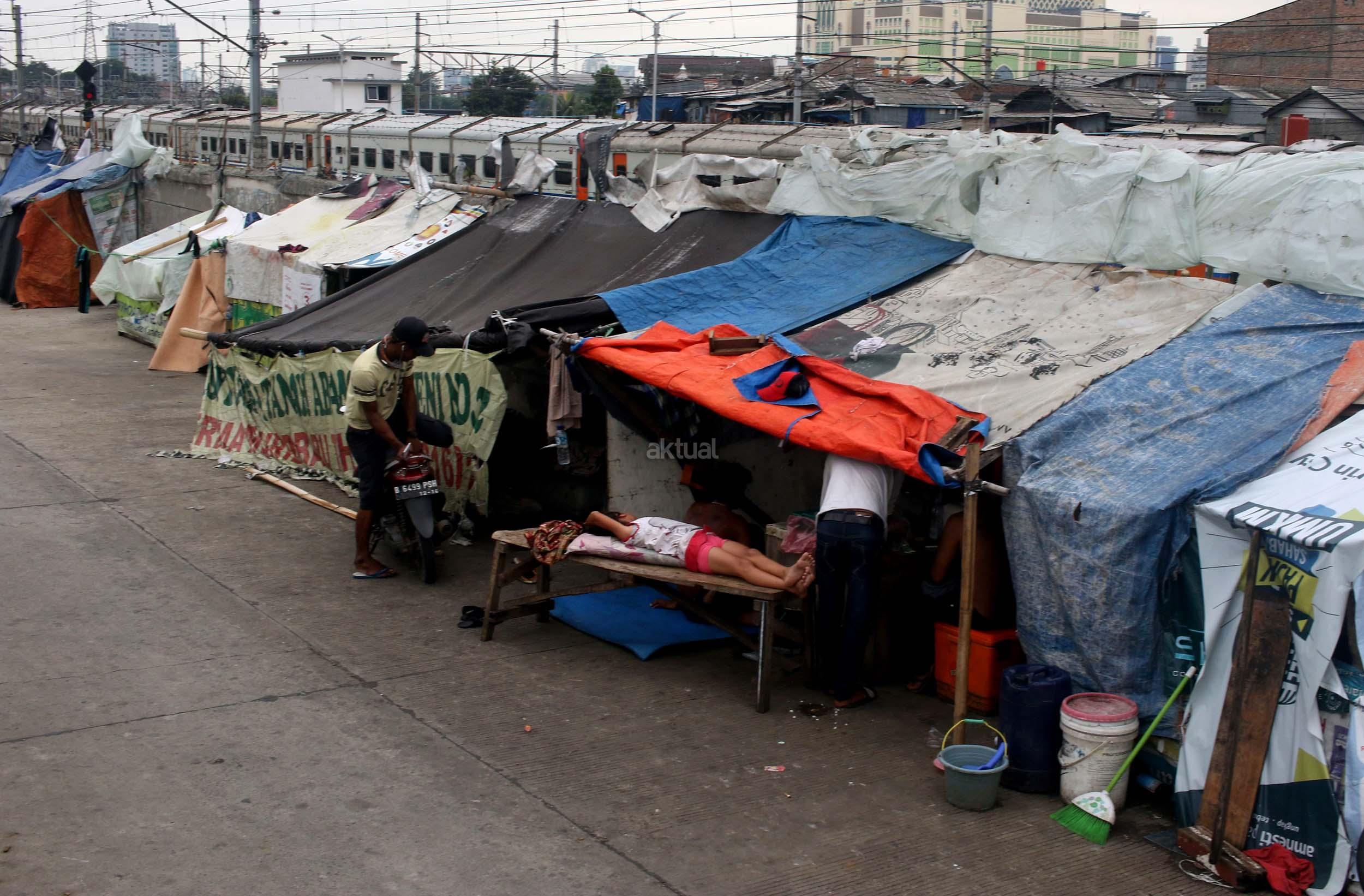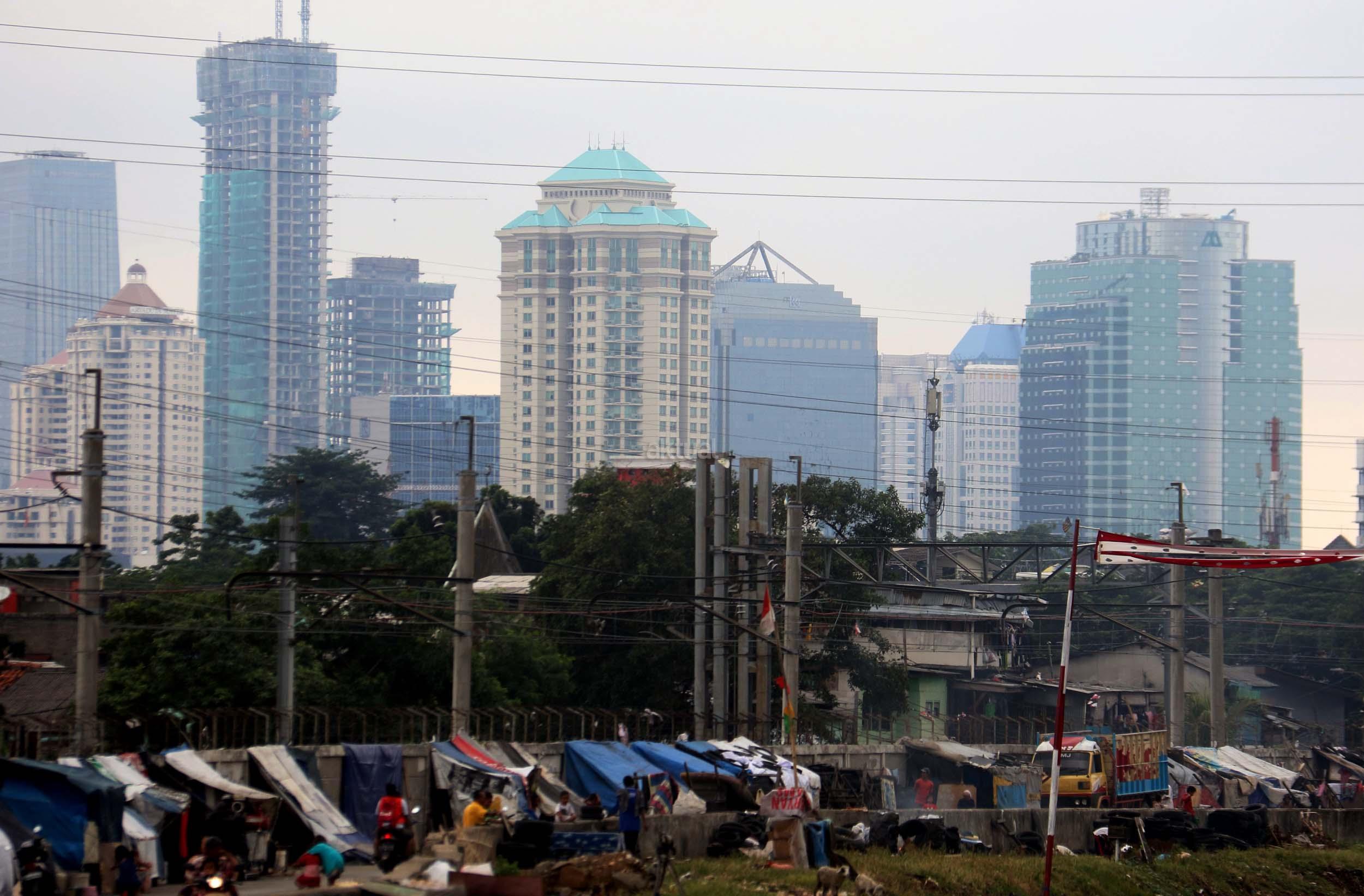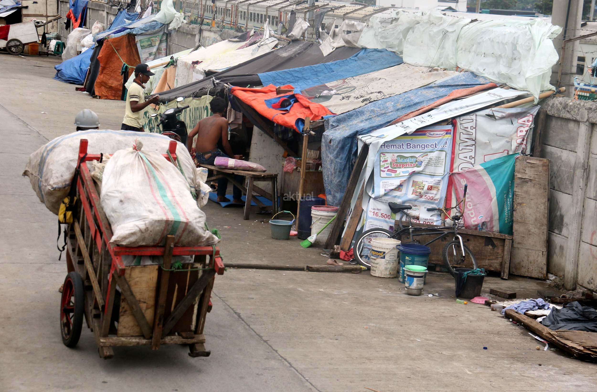 Motor melintas didepan gubuk liar memadati jalur inspeksi kanal banjir barat (KBB) di kawasan Kebon Melati, Jakarta Pusat, Rabu (4/1/2017). Sebanyak 48,91 persen penduduk Daerah Khusus Ibukota (DKI) Jakarta tidak mempunyai tempat tempat tinggal milik sendiri. Badan Pusat Statistik (BPS) terbitan tahun 2016 mencatat DKI Jakarta merupakan provinsi dengan kepadatan penduduk tertinggi di Indonesia, mencapai 15.328 jiwa per km2. AKTUAL/Munzir