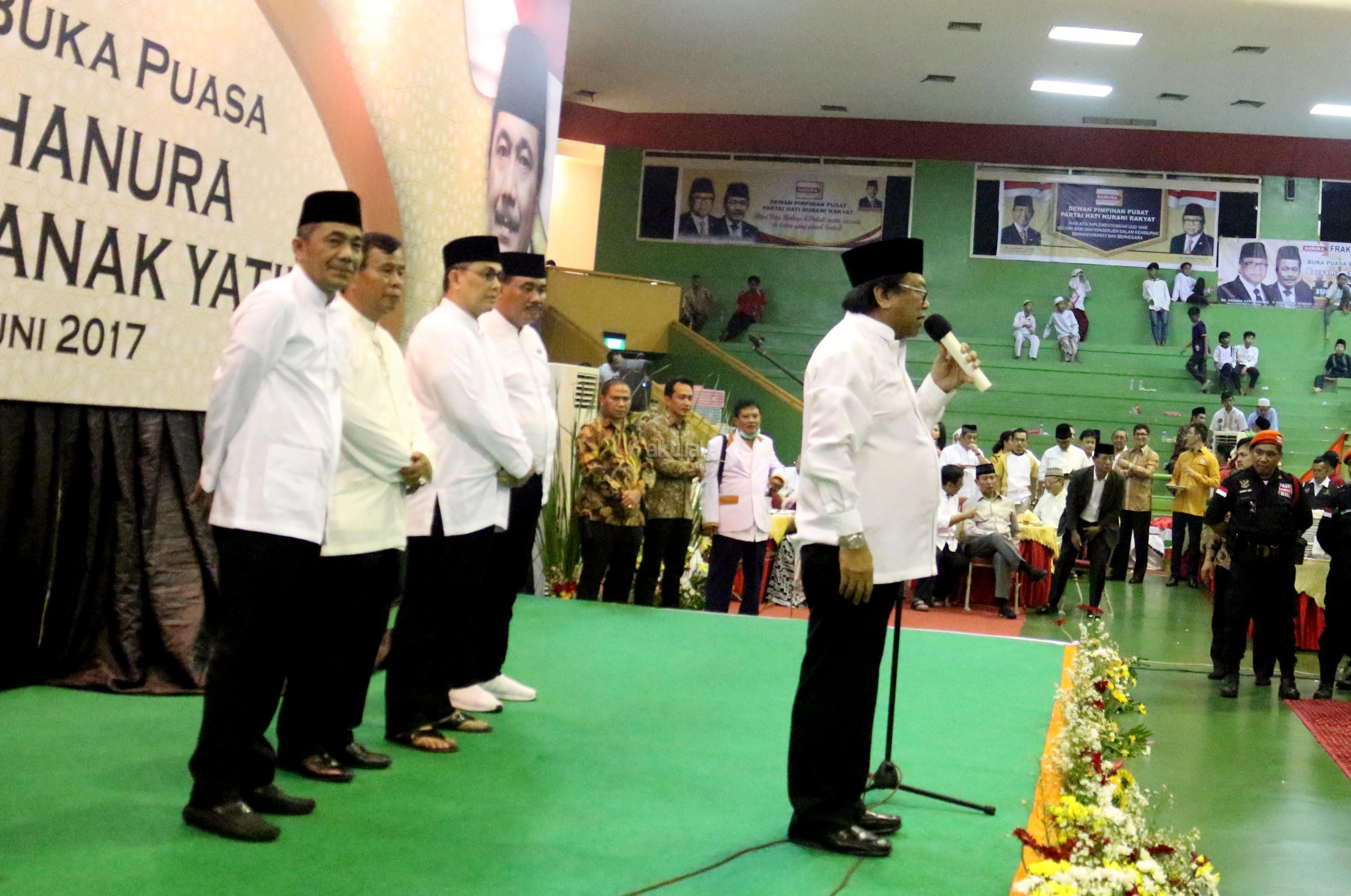 Ketua Dewan Kehormatan Partai Hanura yang juga Menkopolhukan Wiranto memberikan santunan secara simbolis kepada anak yatim, dalam acara “Silahturahmi dan Buka Puasa Bersama DPP Partai Hanura bersama Anak Yatim”, di Jakarta, Jumat (16/6/2017). Dalam acara tersebut Partai Hanura memberikan santunan uang dan bingkisan kepada sedikitnya 1000 anak Yatim-Piatu dan Dhuafa se Jakarta, agar dapat memenuhi kebutuhan untuk merayakan Lebaran Idul Fitri 1438 H. AKTUAL/Munzir