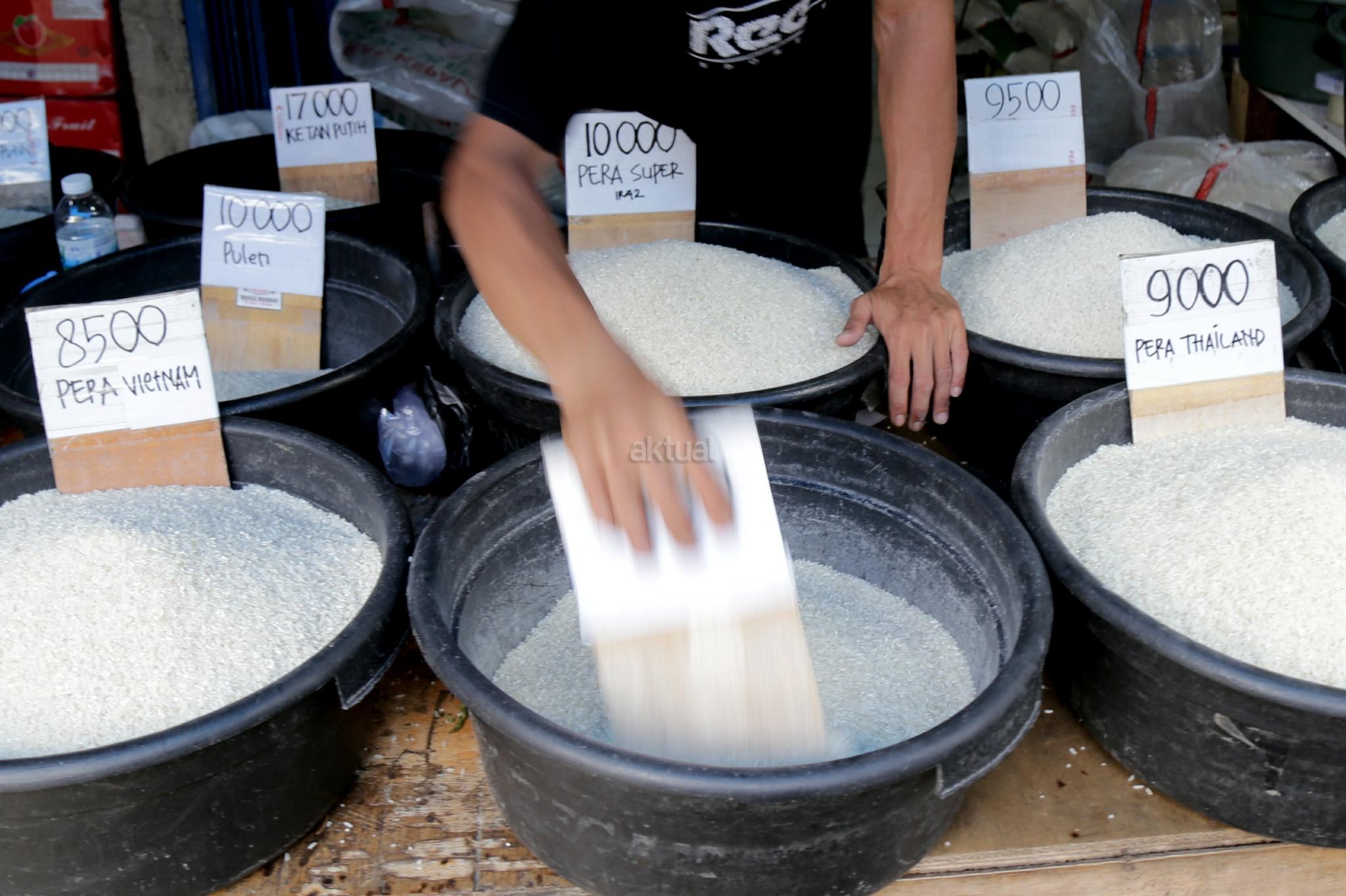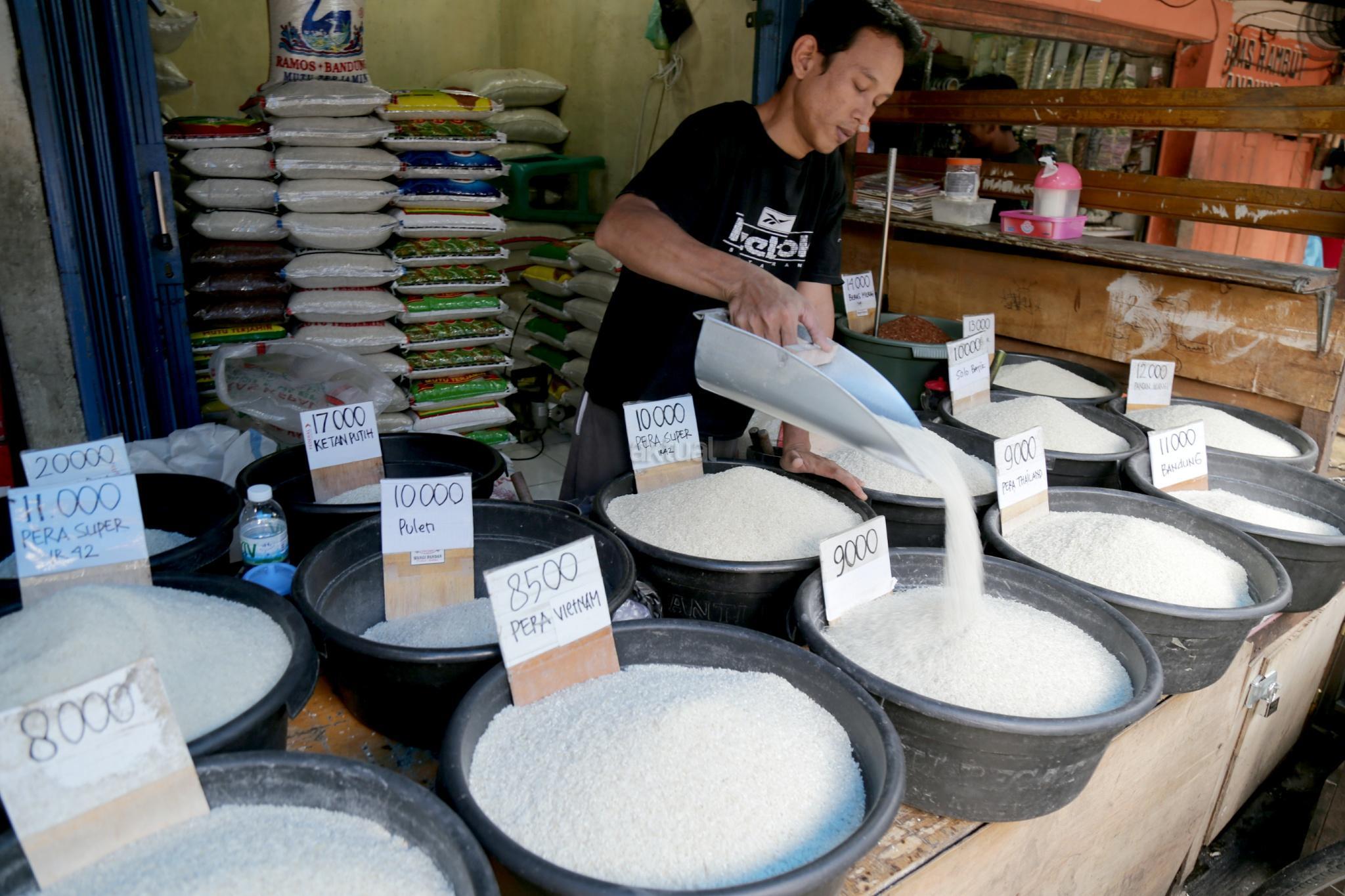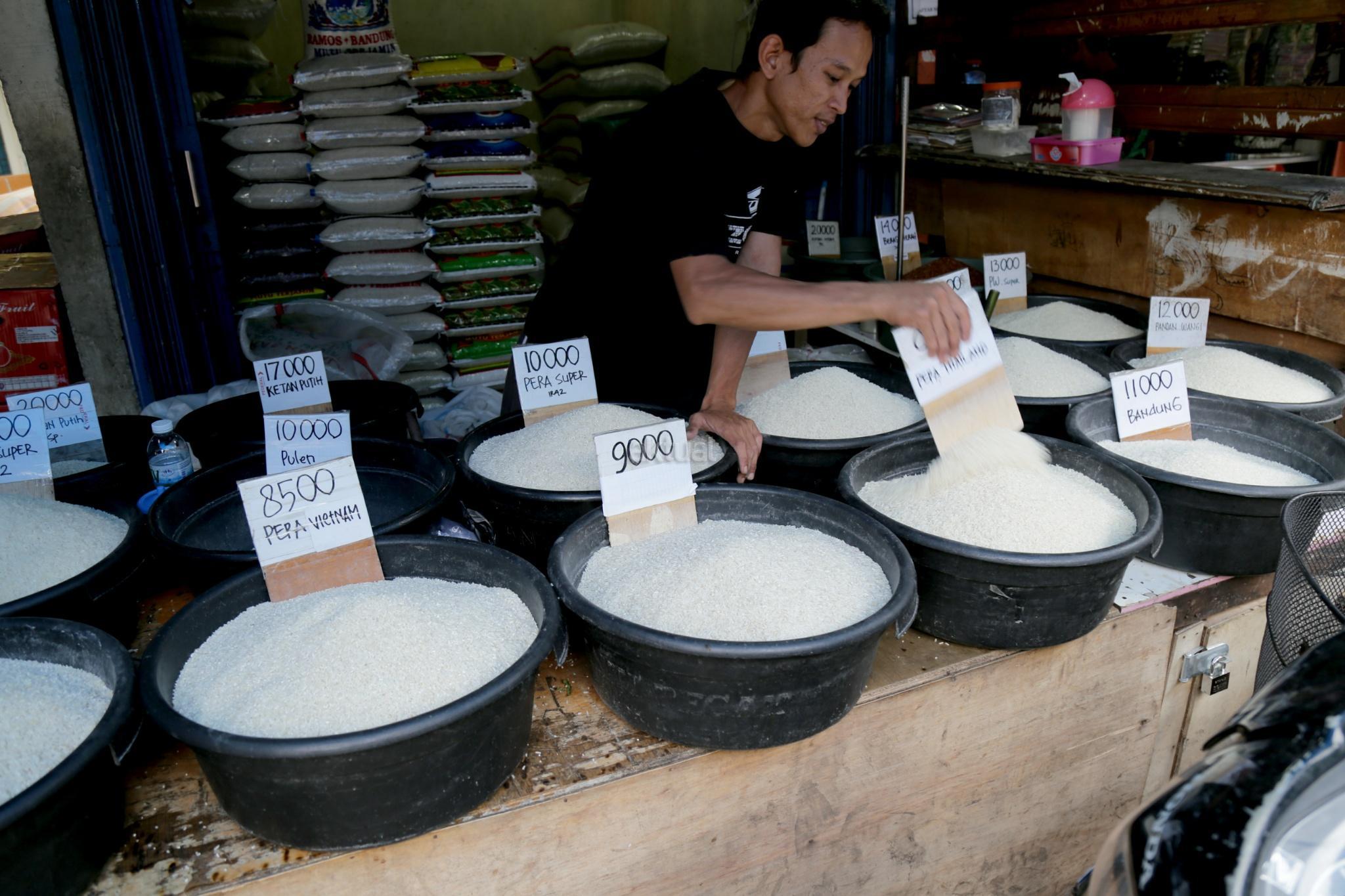 Pedagang beras membereskan beras di Pasar Rumput, Jakarta Selatan, Jumat (26/1/2018). Kenaikan harga komoditas beras yang terjadi sejak akhir 2017 telah semakin menurunkan daya beli kalangan buruh. Konfederasi Serikat Pekerja Indonesia (KSPI) menilai kondisi itu semakin memperburuk kondisi ekonomi para buruh. pemerintah juga terkesan kewalahan saat gejolak terbukti terjadi. Hal ini terbukti dengan perbedaan data yang ditunjukkan Kementerian Pertanian, Kementerian Perdagangan, hingga Badan Urusan Logistik (BULOG) terkait data stok beras. AKTUAL/Tino Oktaviano