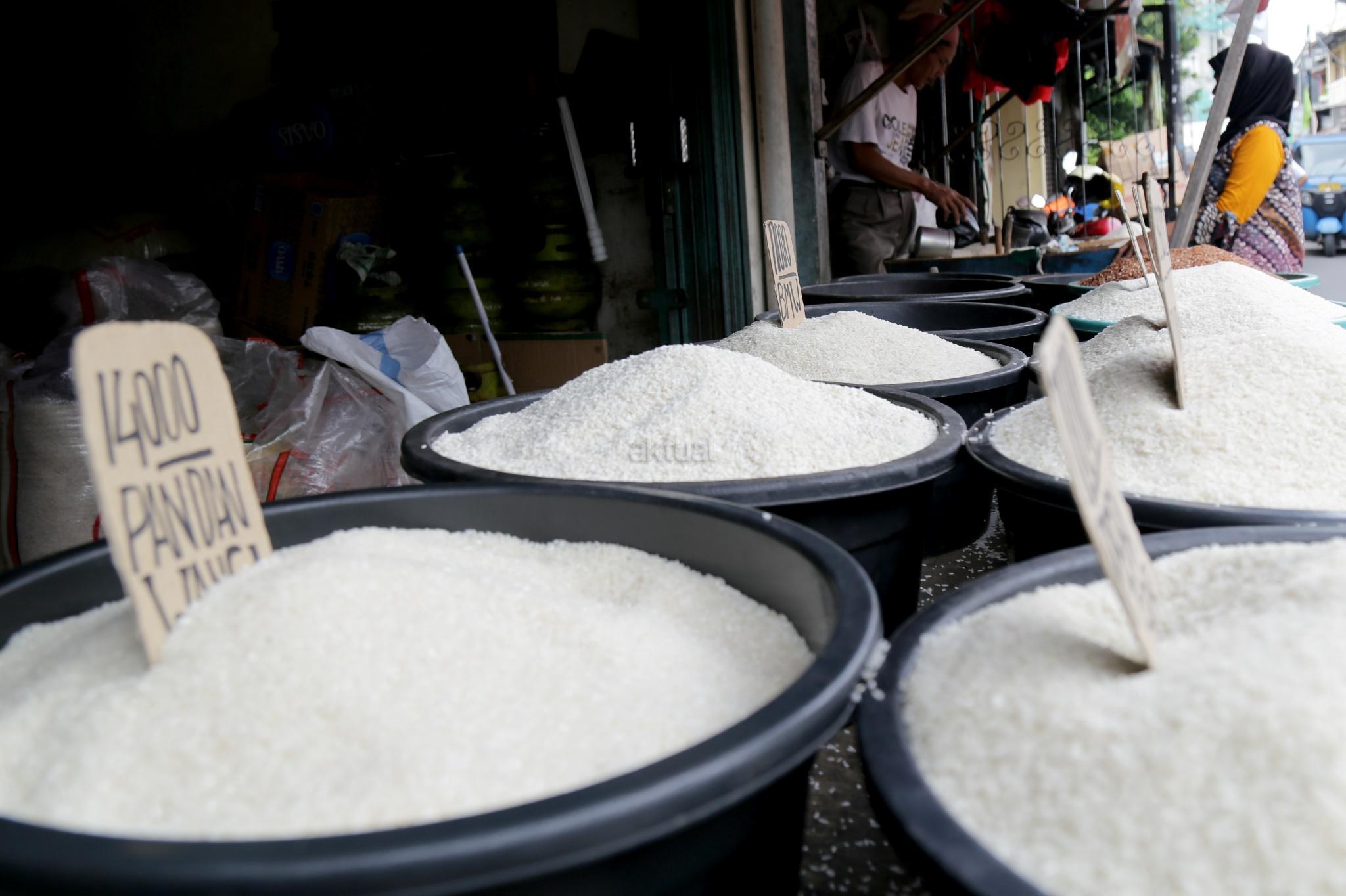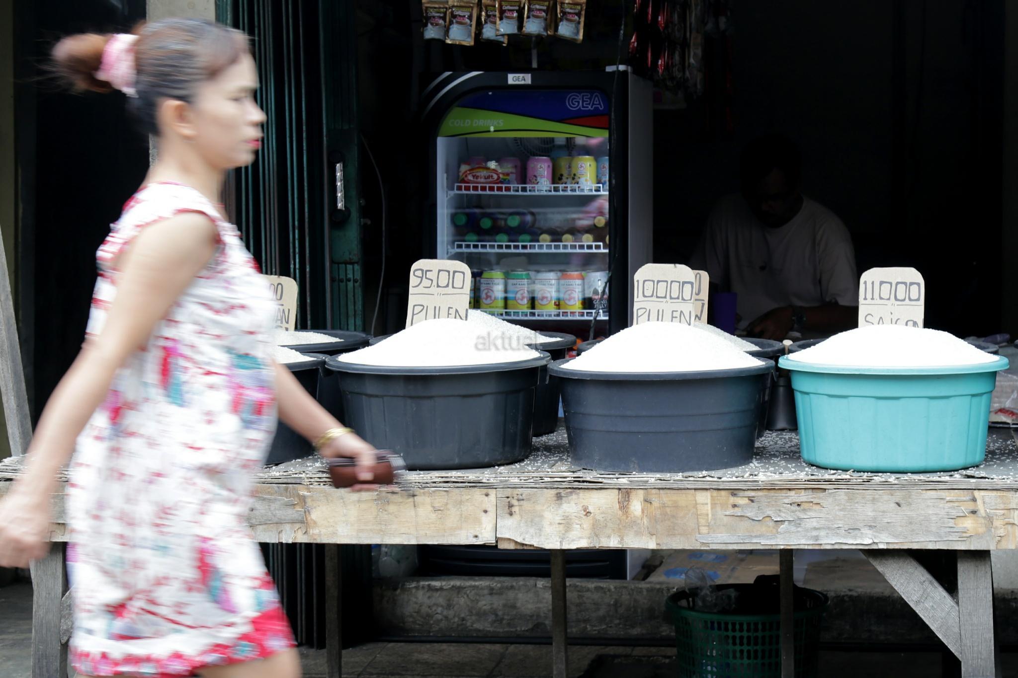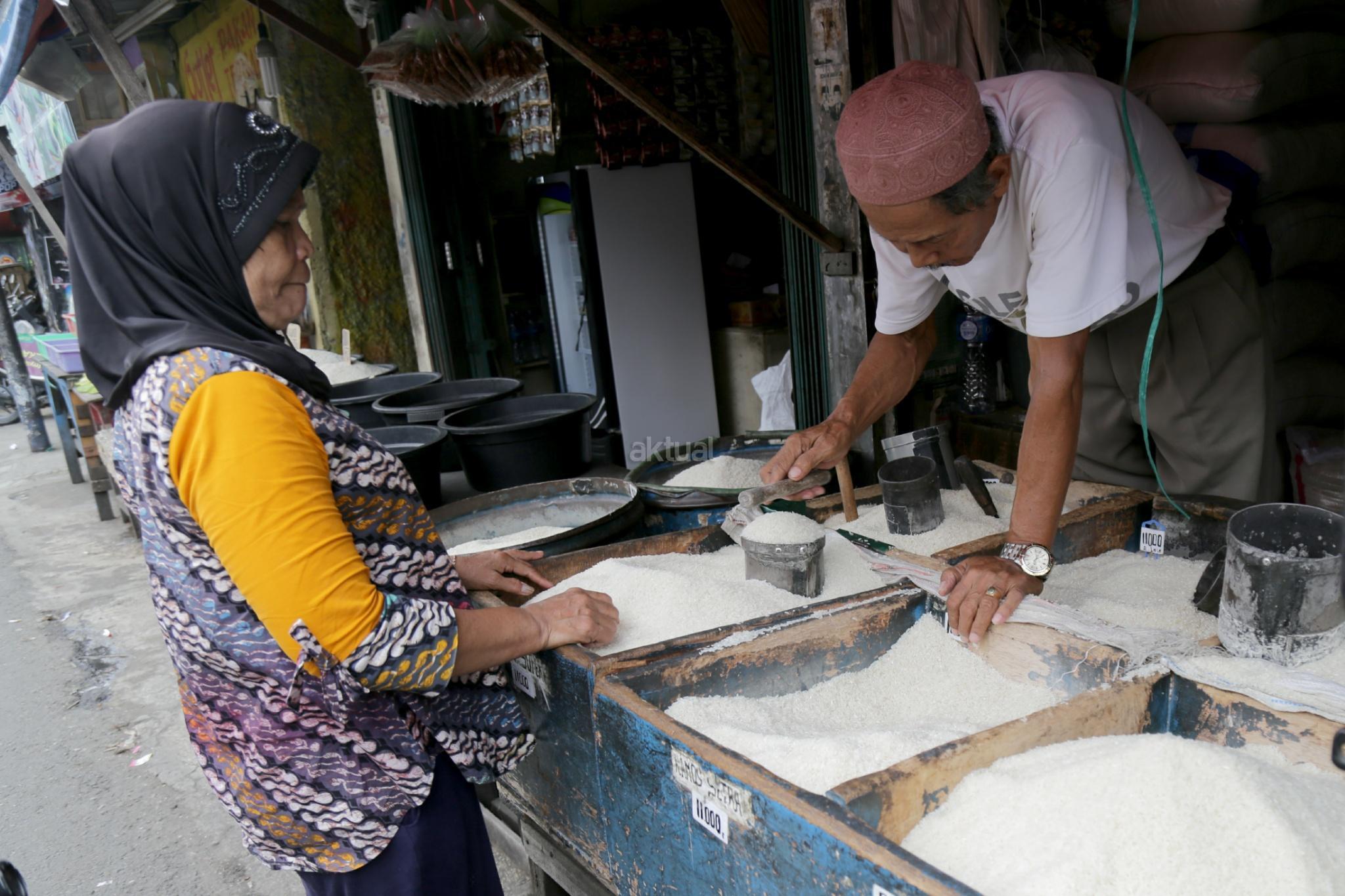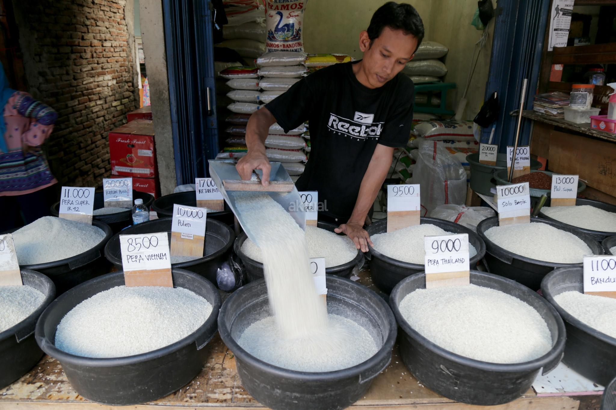 Pedagang beras membereskan beras di Pasar Rumput, Jakarta Selatan, Jumat (26/1/2018). Kenaikan harga komoditas beras yang terjadi sejak akhir 2017 telah semakin menurunkan daya beli kalangan buruh. Konfederasi Serikat Pekerja Indonesia (KSPI) menilai kondisi itu semakin memperburuk kondisi ekonomi para buruh. pemerintah juga terkesan kewalahan saat gejolak terbukti terjadi. Hal ini terbukti dengan perbedaan data yang ditunjukkan Kementerian Pertanian, Kementerian Perdagangan, hingga Badan Urusan Logistik (BULOG) terkait data stok beras. AKTUAL/Tino Oktaviano