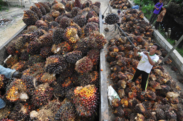 Pekerja memuat tandan buah segar (TBS) kelapa sawit di tempat penampungan sementara kelapa sawit Desa Bunga Tanjung, Betara, Tanjung Jabung Barat, Jambi, Minggu (26/6). Harga TBS kelapa sawit di tingkat penampung di daerah itu terus menurun dari Rp1.500 per kilogram pada bulan lalu menjadi Rp1.150 per kilogram pada hari ini. ANTARA FOTO/Wahdi Septiawan/pd/16.