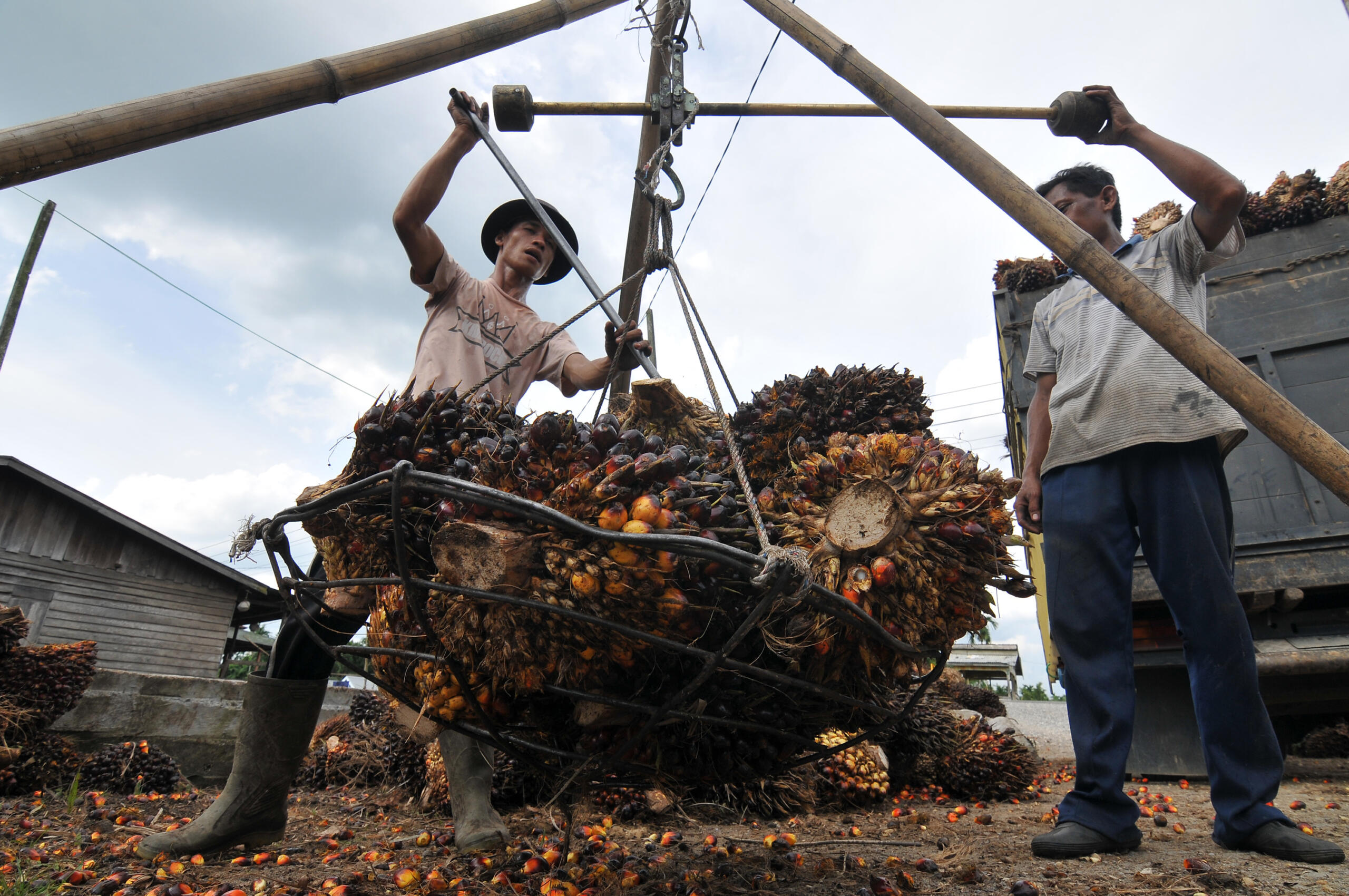Pekerja menimbang tandan buah segar (TBS) kelapa sawit di tempat penampungan sementara kelapa sawit Desa Bunga Tanjung, Betara, Tanjung Jabung Barat, Jambi, Minggu (26/6). Harga TBS kelapa sawit di tingkat penampung di daerah itu terus menurun dari Rp1.500 per kilogram pada bulan lalu menjadi Rp1.150 per kilogram pada hari ini. ANTARA FOTO/Wahdi Septiawan/pd/16.