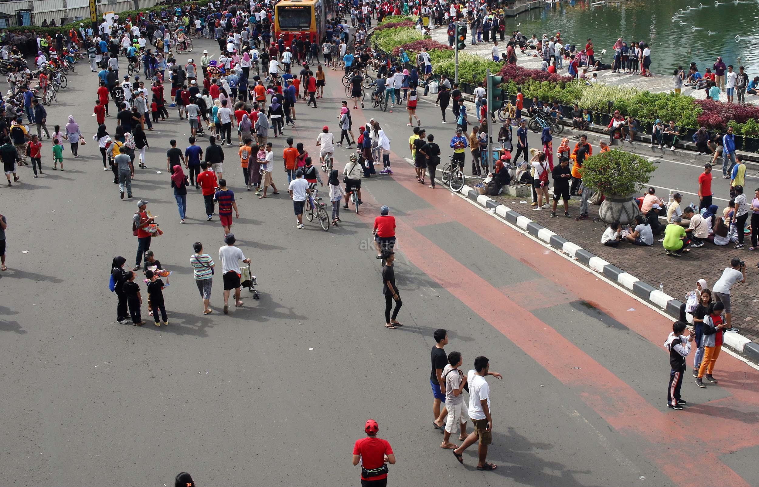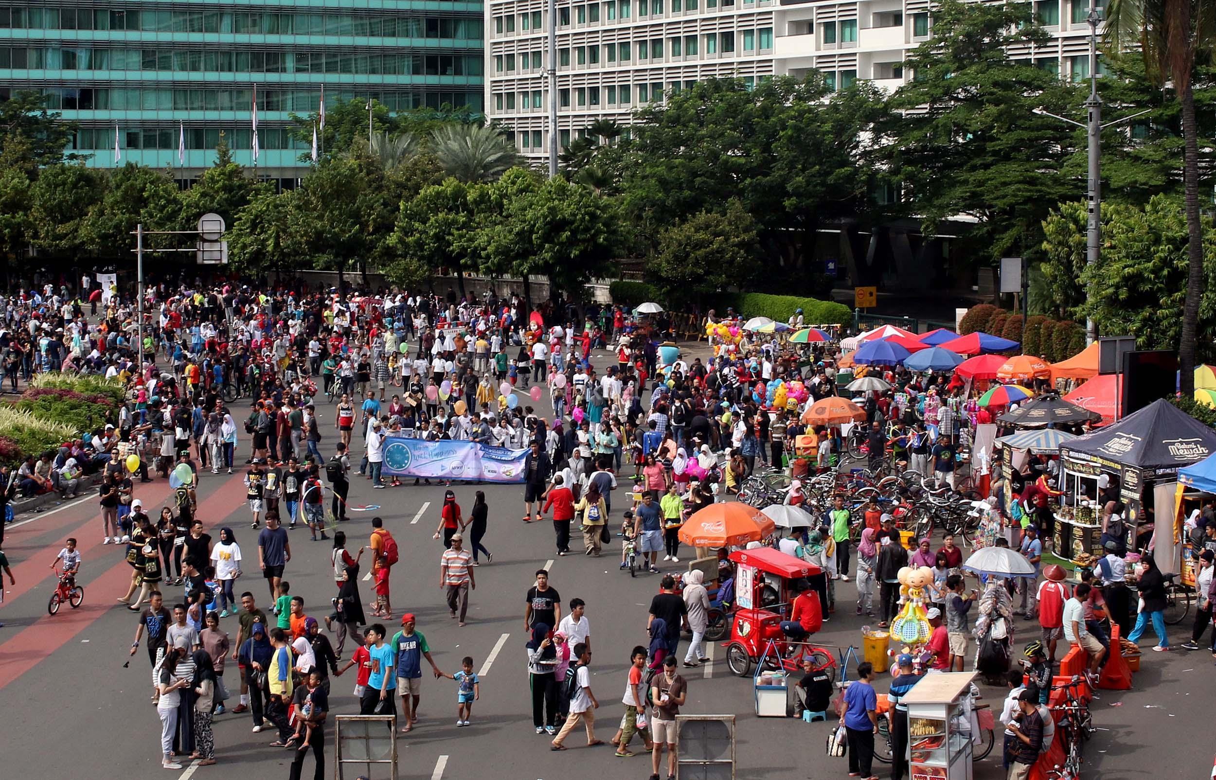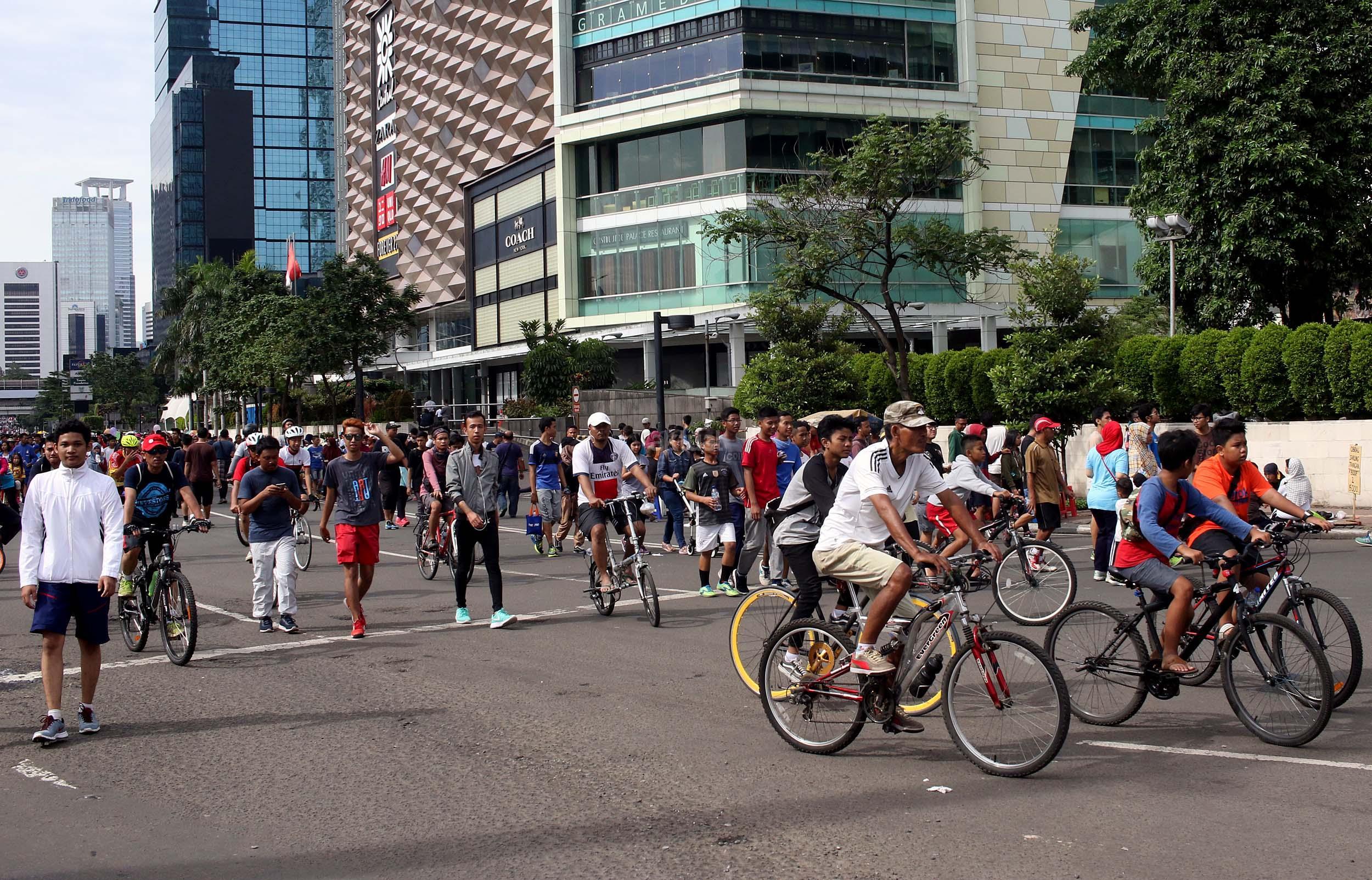 Sejumlah warga memanfaatkan Hari Bebas Kendaraan Bermotor (HBKB) dengan berolahraga di kawasan Bunderan HI, , Jakarta, Minggu (9/10/2016). HBKB yang digelar setiap hari Minggu tersebut untuk mengurangi tingkat polusi di Jakarta.