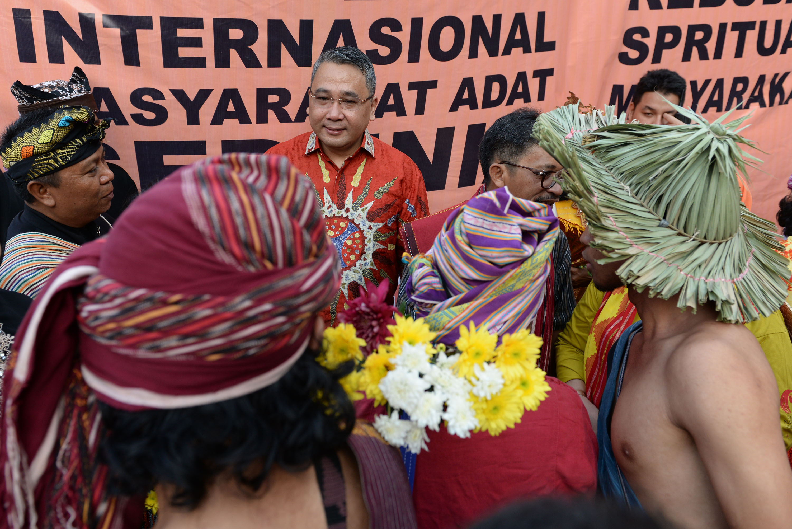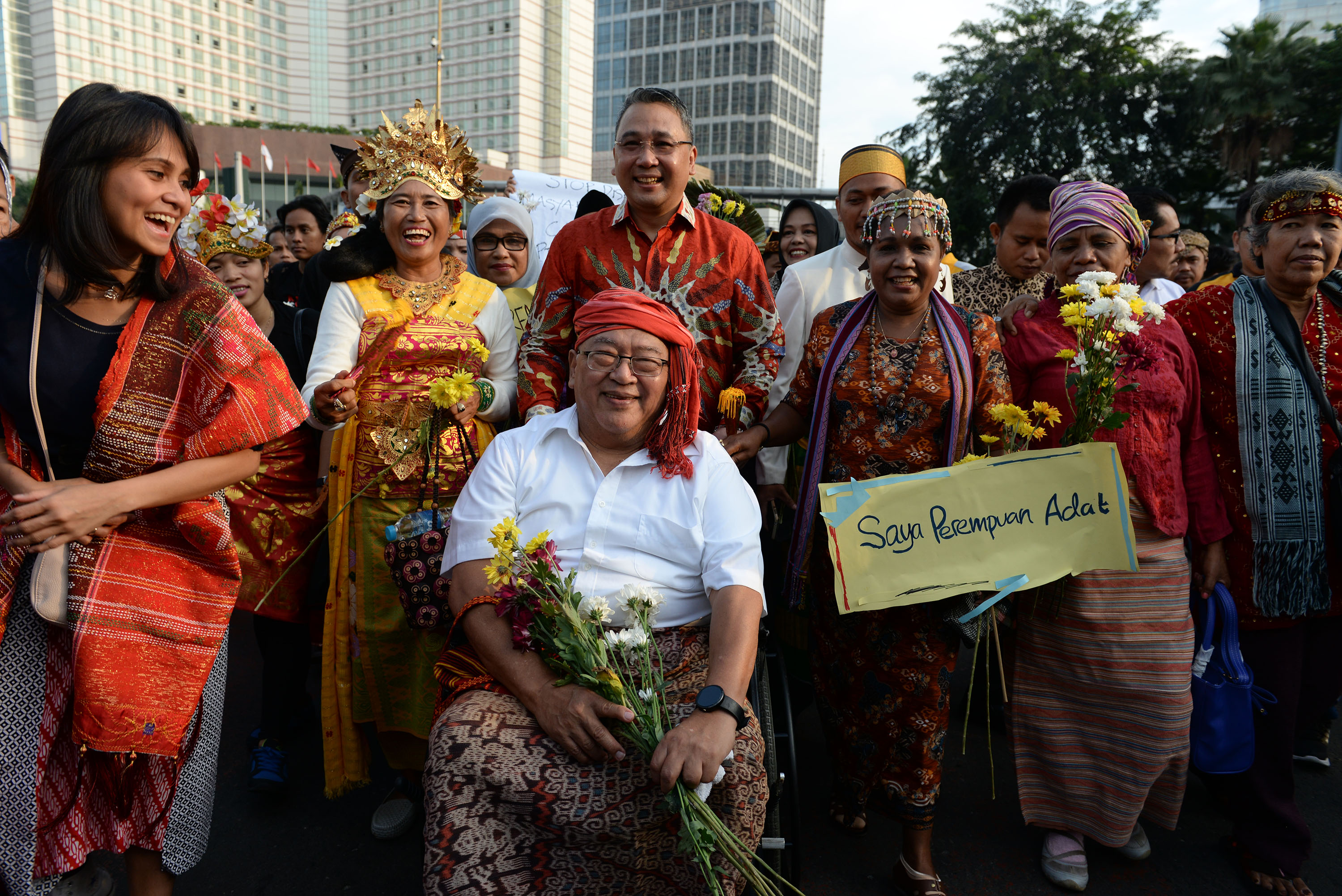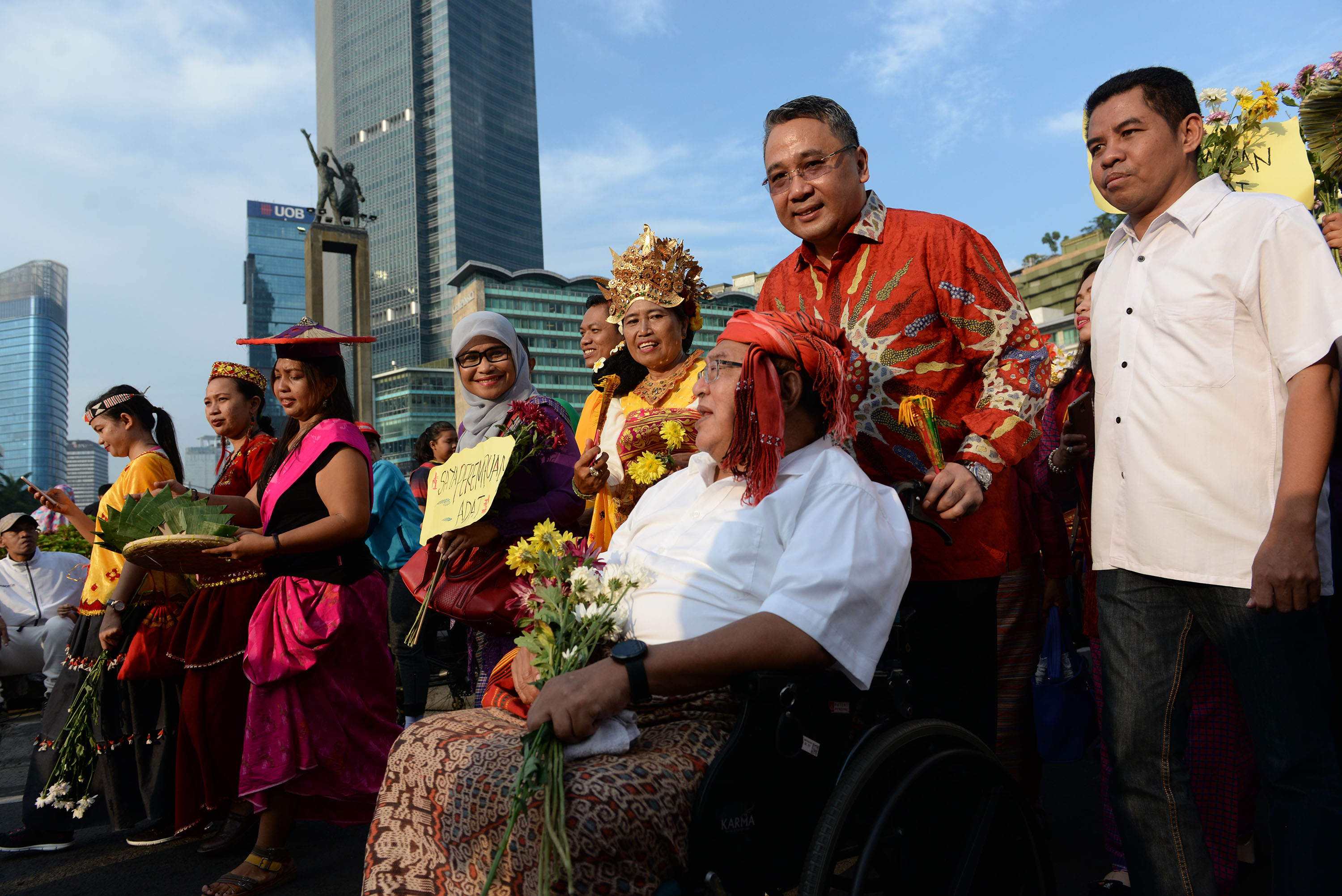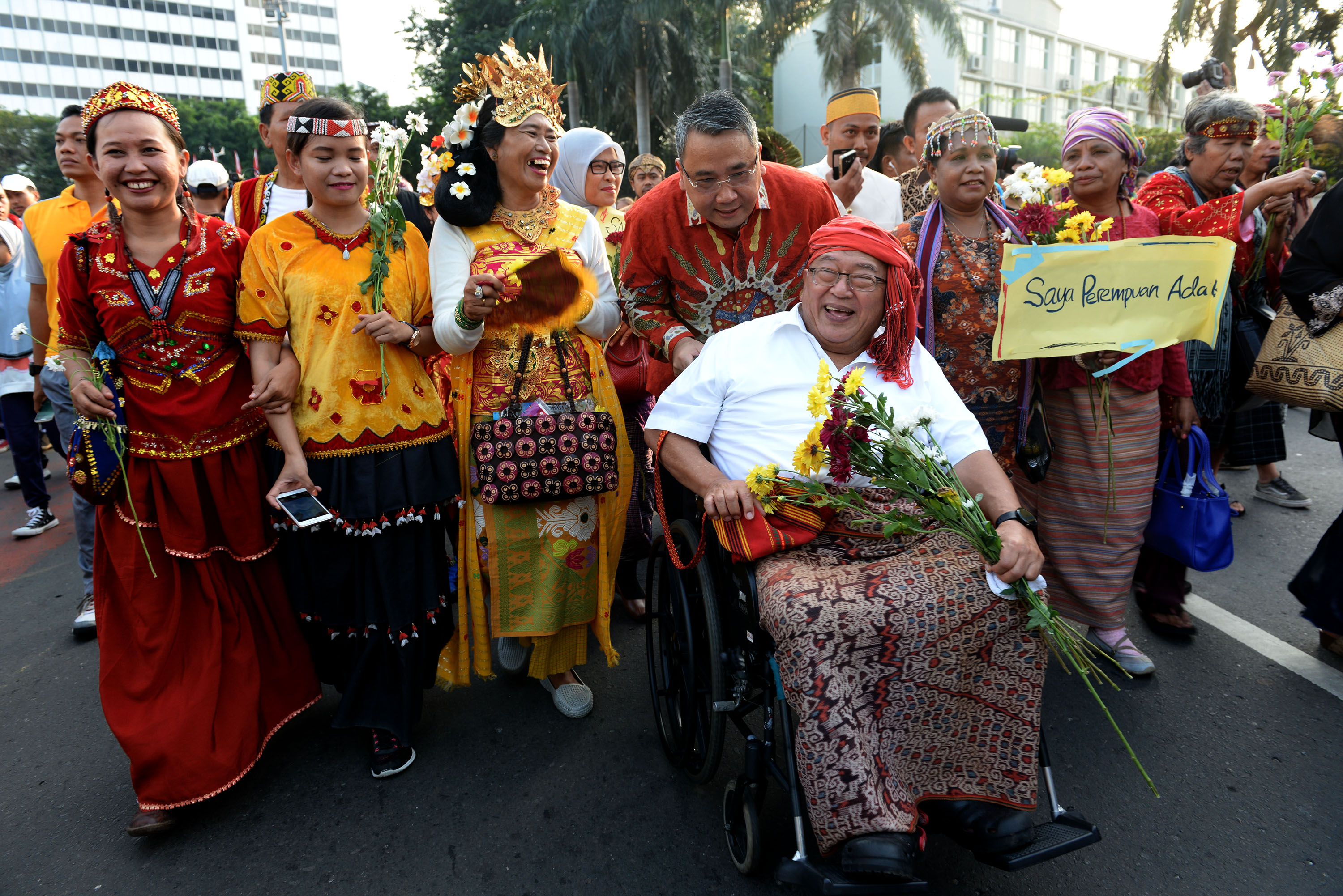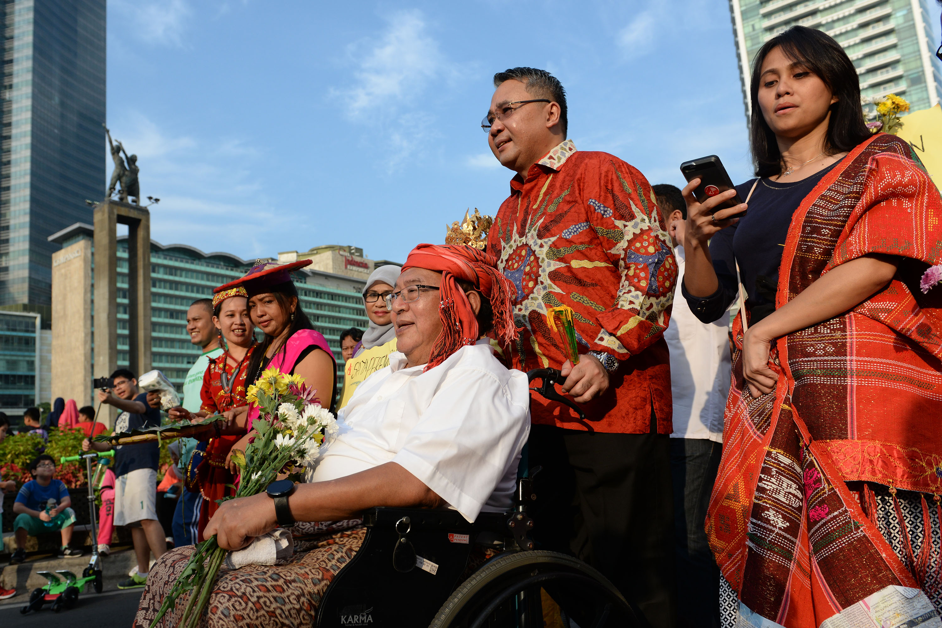 Menteri Desa, PDT dan Transmigrasi Eko Sandjojo mendorong kursi roda budayawan Wimar Witoelar mengikuti pawai budaya memperingati Hari Internasional Masyarakat Adat se-Dunia di Bundaran HI, Jakarta Pusat, Minggu (7/8/2016). Eko Sandjojo mendorong program “One Village One Product” di desa-desa agar ekonomi masyarakat adat meningkat, sehingga dapat menjaga kelestarian adat.