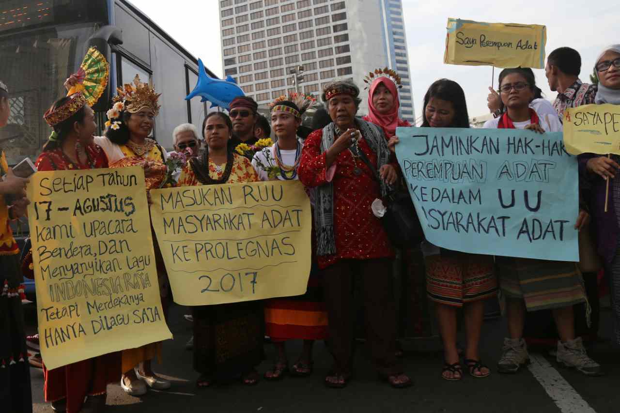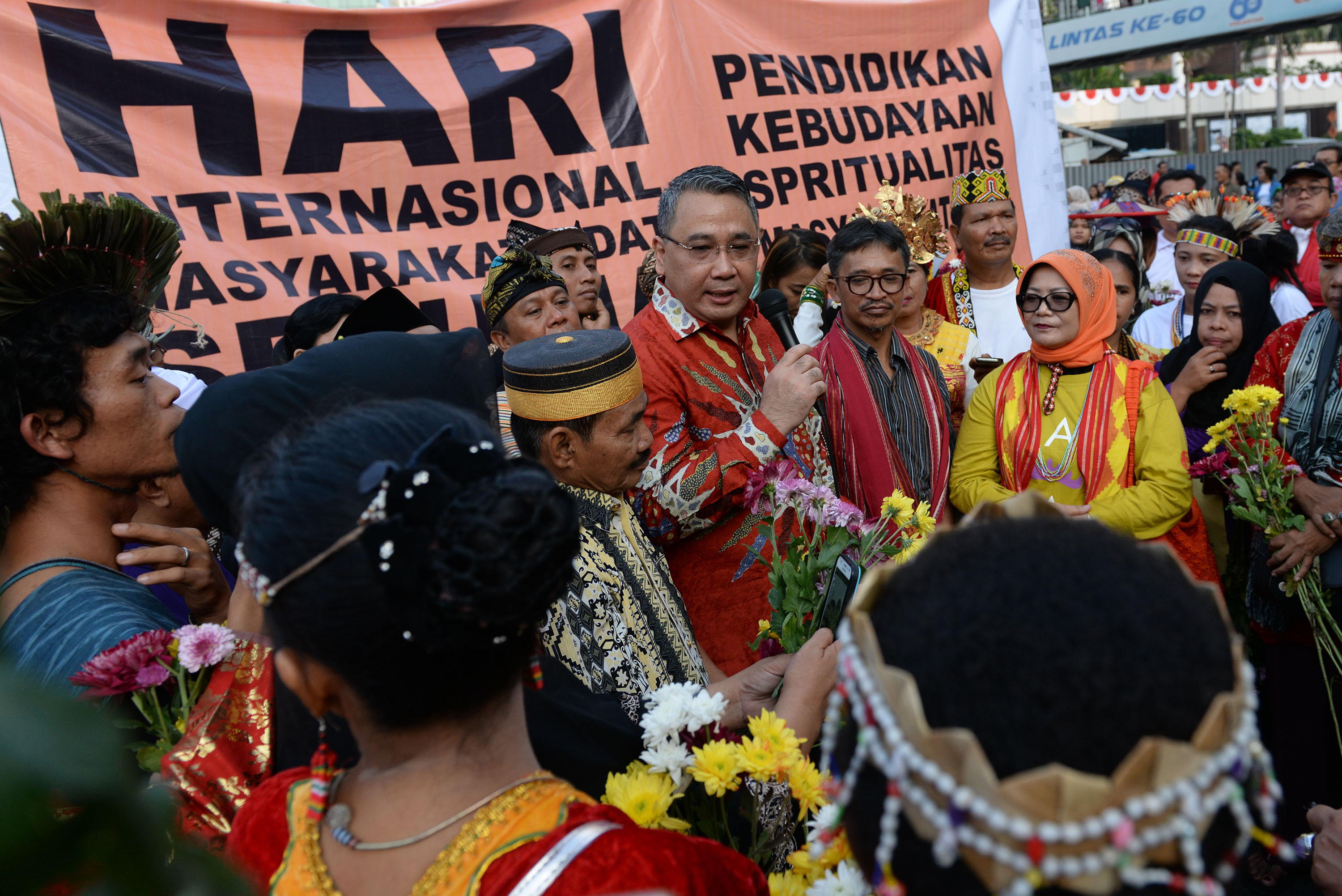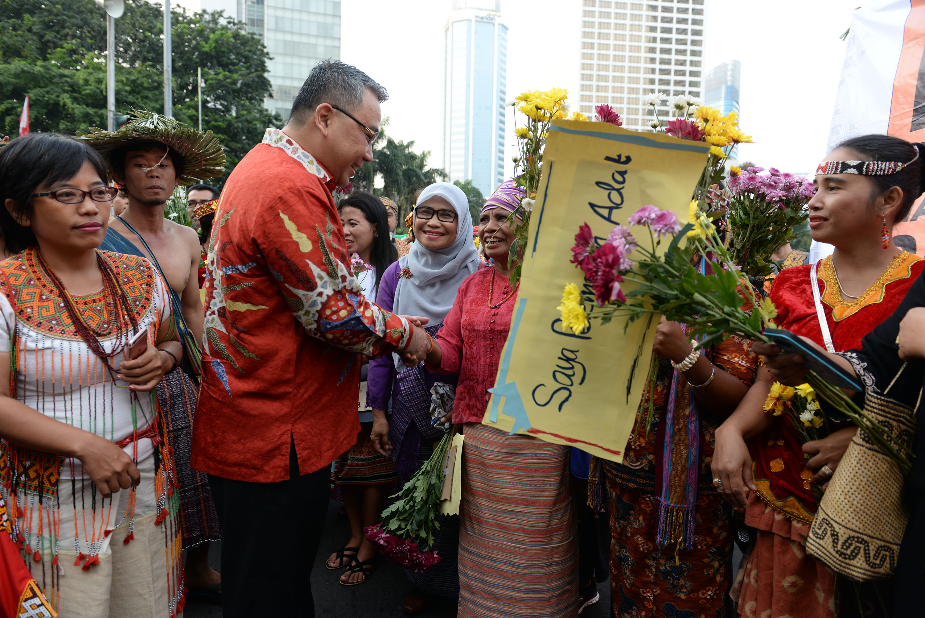 Sejumlah perempuan melakukan pawai budaya memperingati Hari Internasional Masyarakat Adat se-Dunia di Bundaran HI, Jakarta Pusat, Minggu (7/8/2016). Pemerintah saat ini mendorong program “One Village One Product” di desa-desa agar ekonomi masyarakat adat meningkat, sehingga dapat menjaga kelestarian adat. AKTUAL/TINO OKTAVIANO
