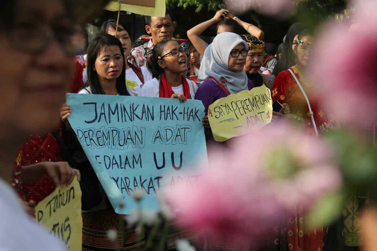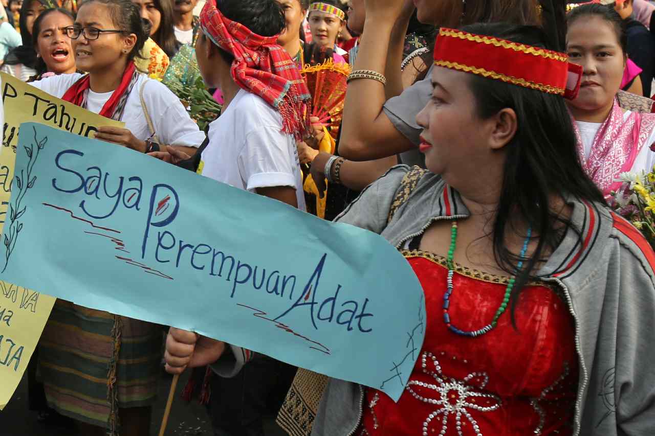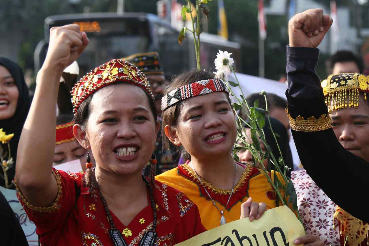 Sejumlah perempuan melakukan pawai budaya memperingati Hari Internasional Masyarakat Adat se-Dunia di Bundaran HI, Jakarta Pusat, Minggu (7/8/2016). Pemerintah saat ini mendorong program “One Village One Product” di desa-desa agar ekonomi masyarakat adat meningkat, sehingga dapat menjaga kelestarian adat. AKTUAL/TINO OKTAVIANO