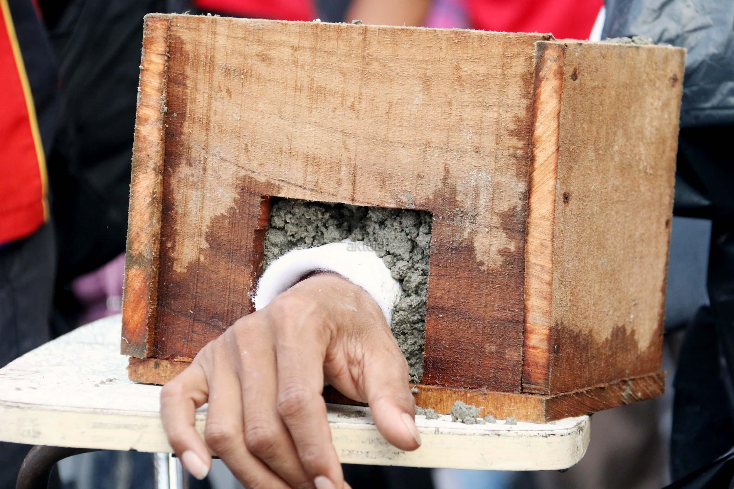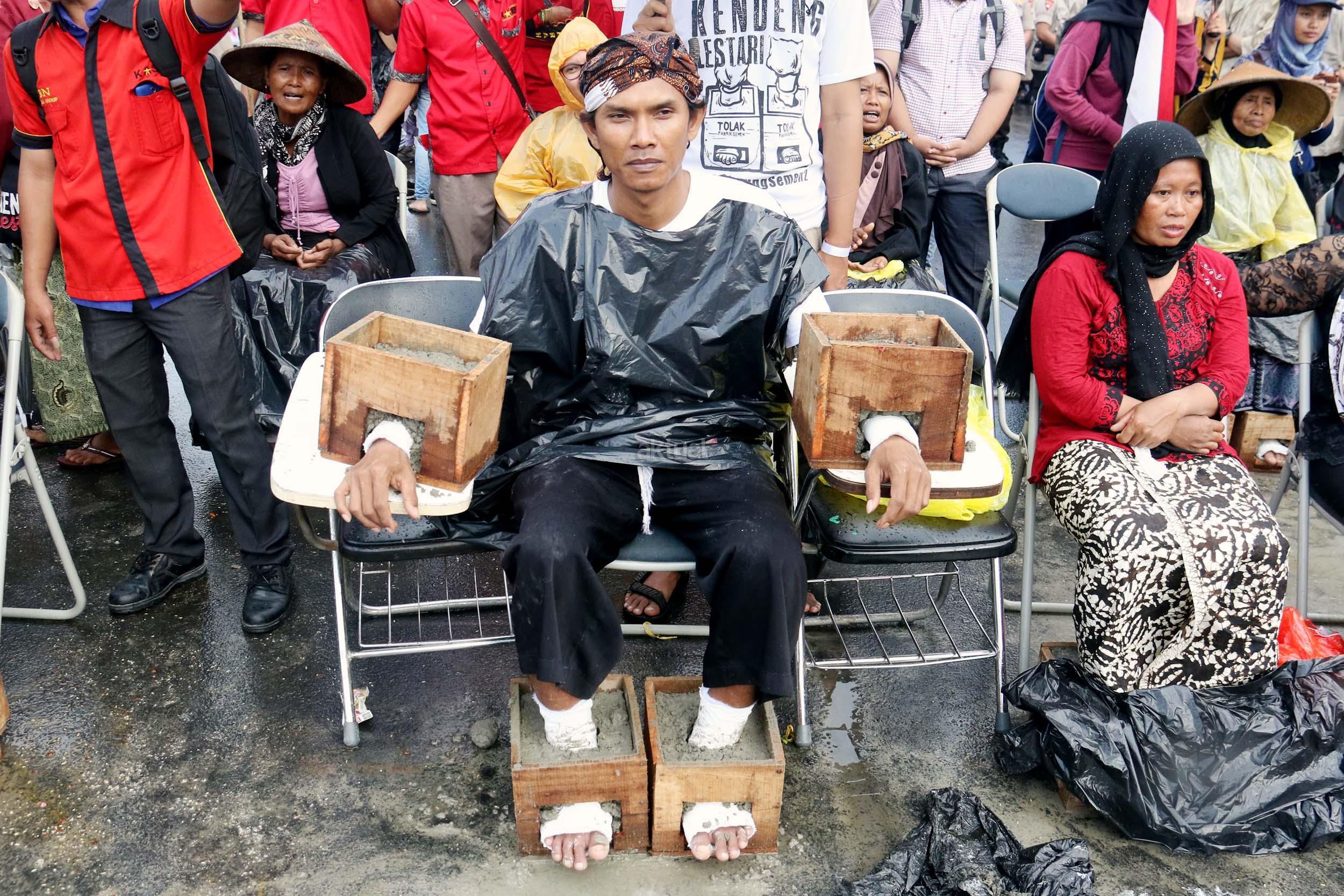 Petani Pegunungan Kendeng memasung kakinya dengan semen saat menggelar aksi di depan Istana Merdeka, Jakarta, Senin (20/3/2017). Dalam aksi tersebut mereka meminta kepada Presiden Joko Widodo untuk menghentikan izin lingkungan Pembangunan dan Pertambangan Pabrik PT Semen Indonesia yang diterbitkan kembali oleh Gubernur Jawa Tengah Ganjar Pranowo pada 23 Februari 2017. AKTUAL/Munzir