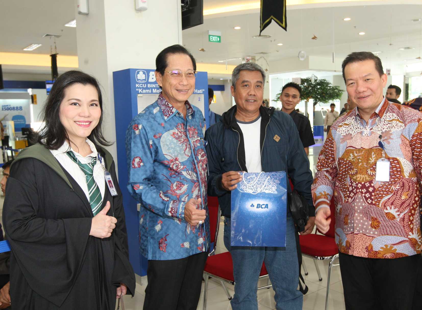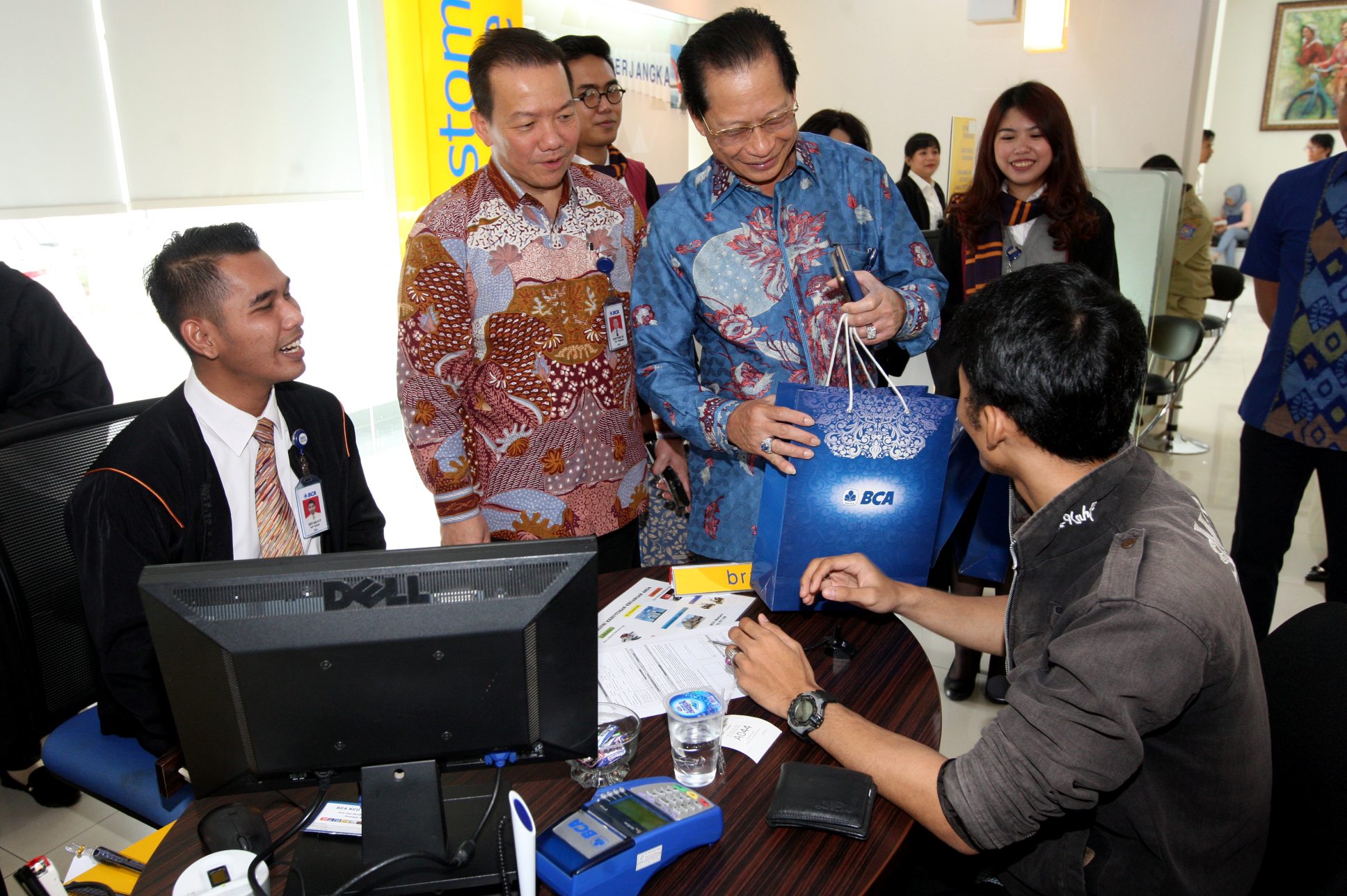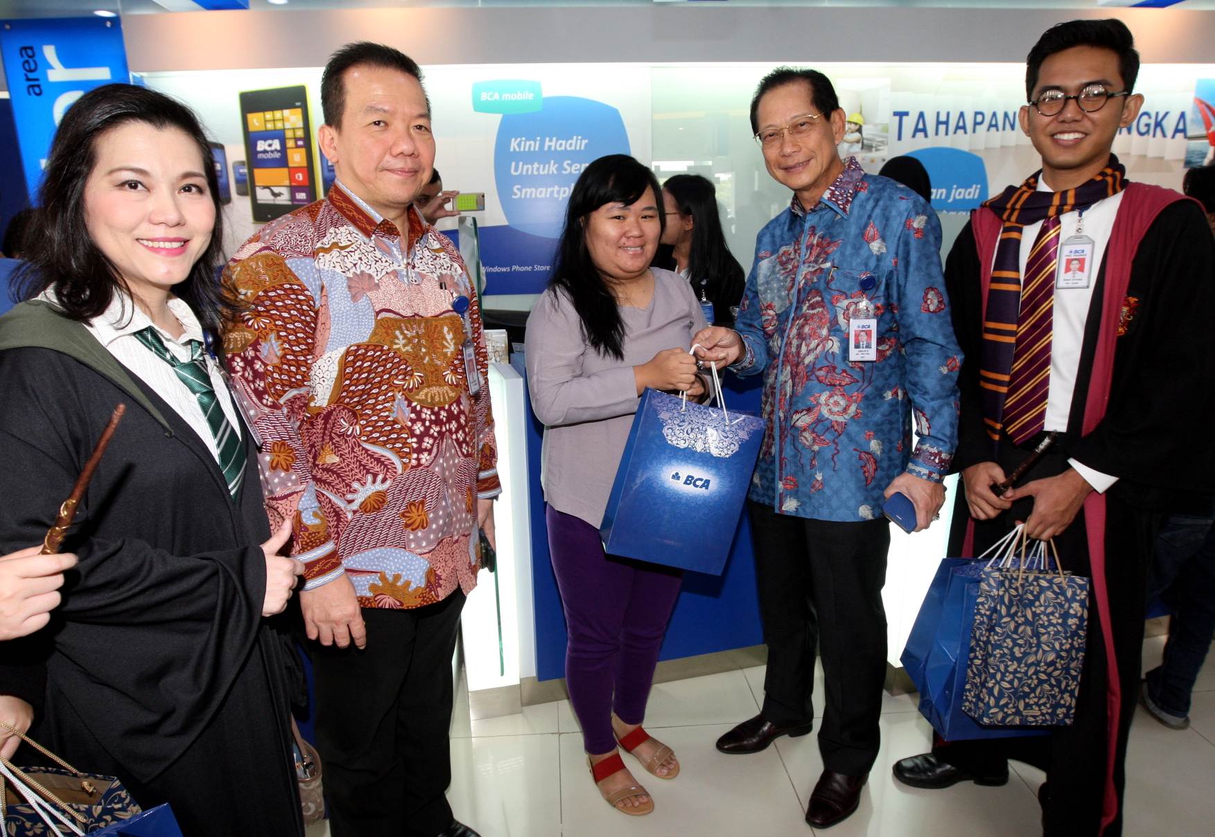 Presiden Direktur PT Bank Central Asia Tbk (BCA) Jahja Setiaatmadja didampingi Kepala Kantor Wilayah VIII BCA Haryono Wongsonegoro dan Kepala BCA KCU Bintaro Titiani memberikan bingkisan kepada nasabah sebagai ungkapan apresiasi atas kesetiaannya menggunakan layanan dan produk perbankan BCA di BCA Kantor Cabang Utama (KCU) Bintaro, Jakarta Selatan, Senin (4/9). Pada kesempatan yang sama, Direktur BCA Henry Koenaifi juga melakukan kunjungan ke BCA KCU Pluit dan BCA KCU Pangeran Jayakarta, serta Direktur BCA Santoso turut berkunjung ke BCA KCU Pasar Baru. AKTUAL/Eko S Hilman