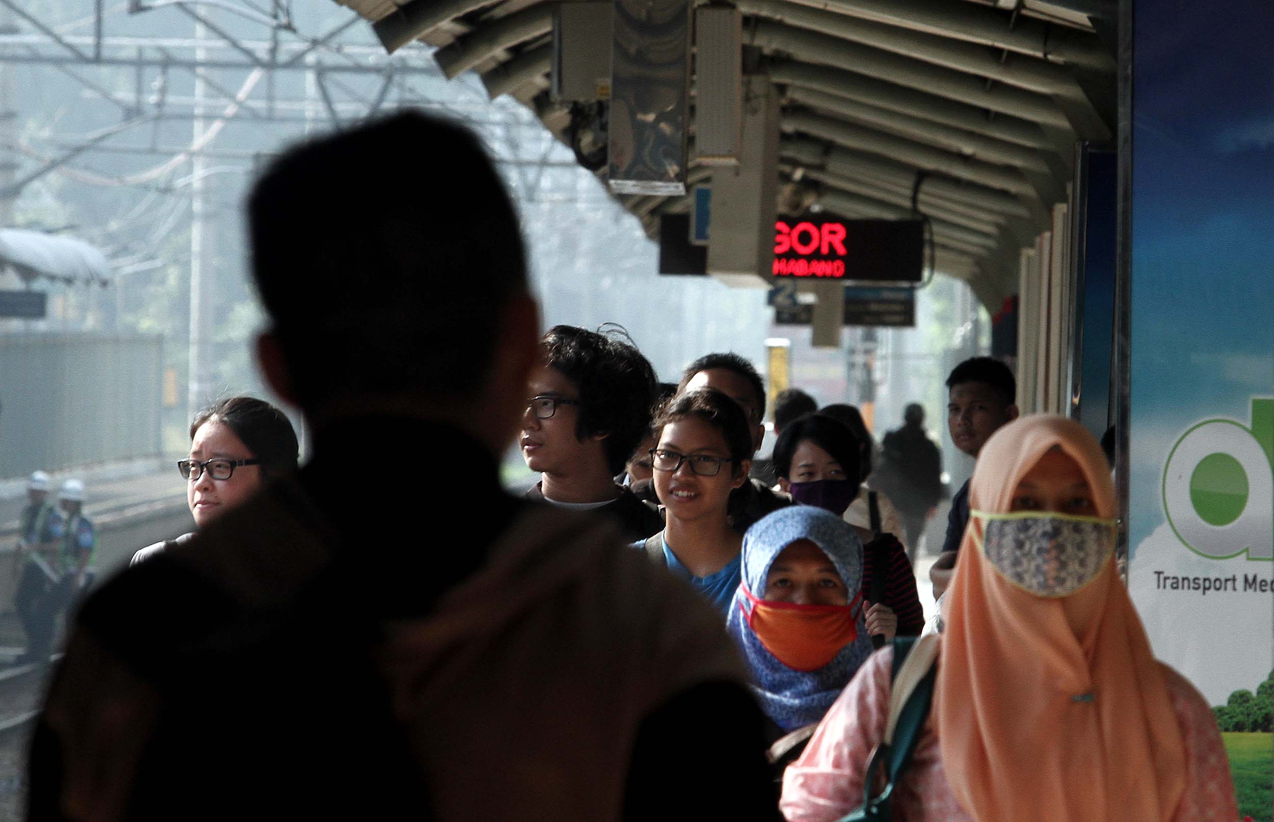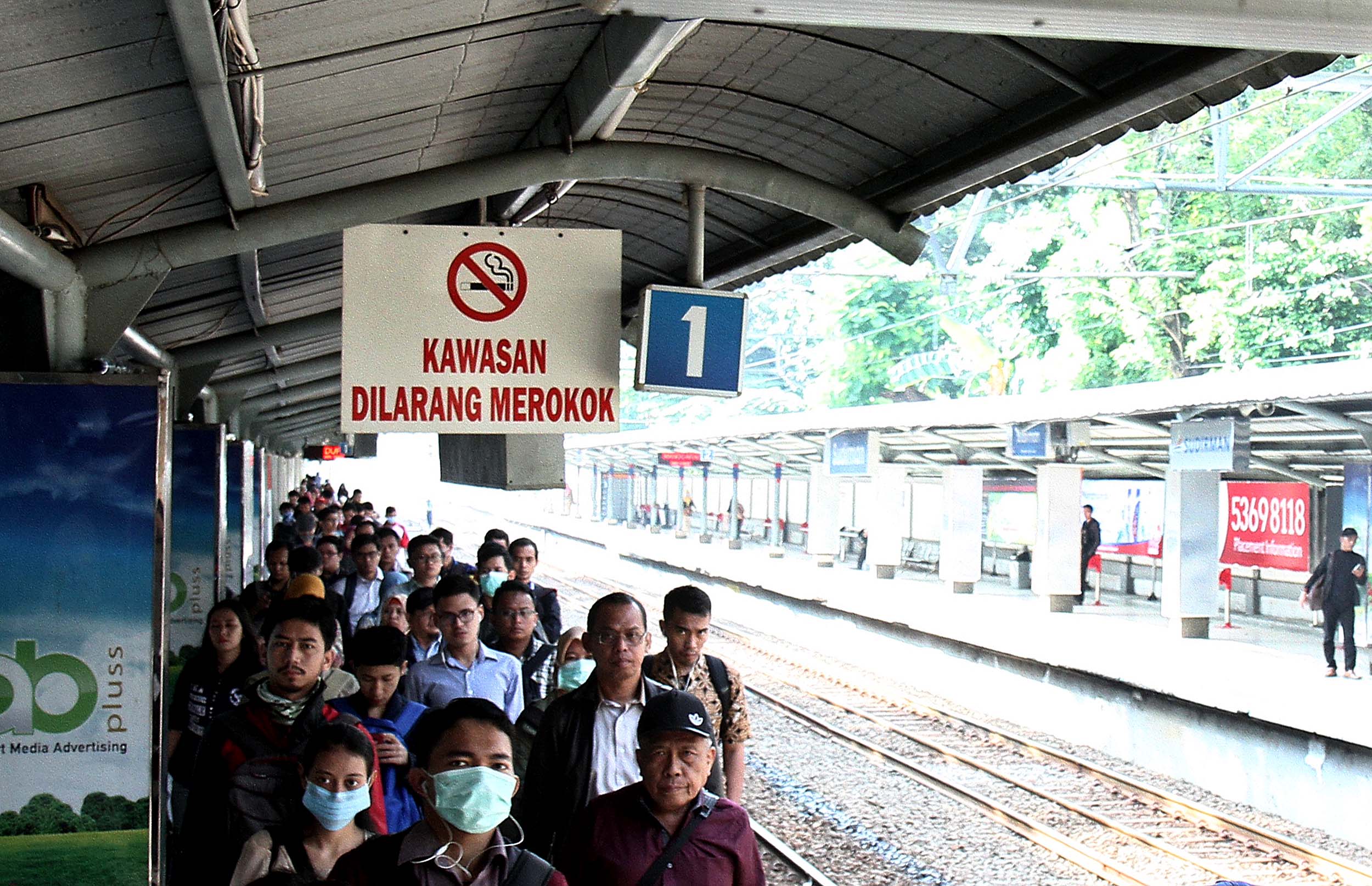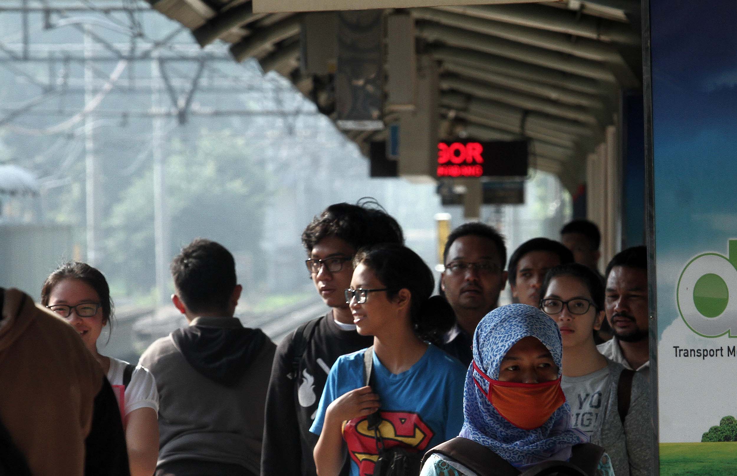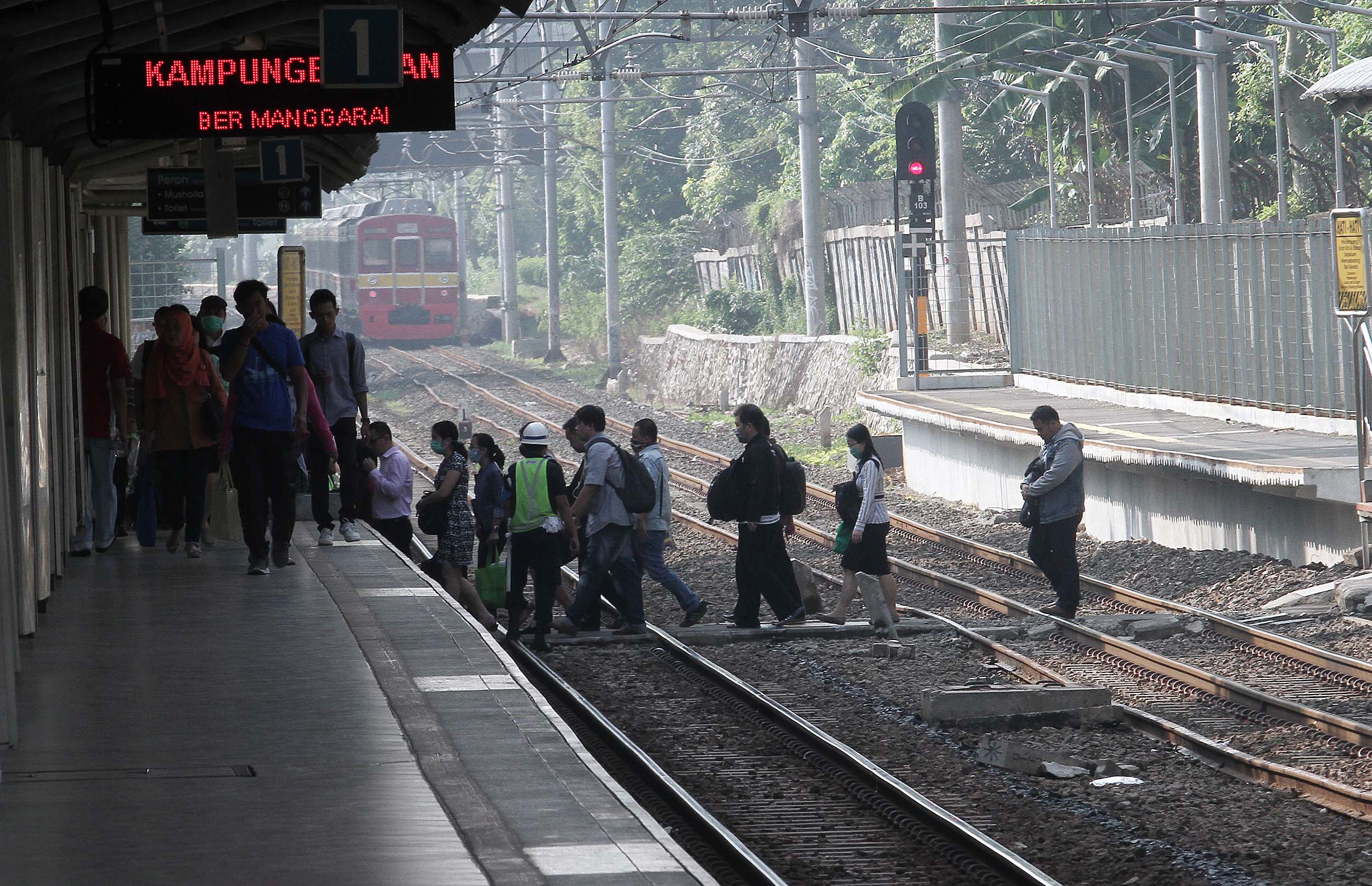Terlihat para pekerja melintas di peron Stasiun Sudirman, Jakarta, Senin (11/7/2016). Usai libur lebaran Idul Fitri hari ini mulai beraktifitas seperti semula.