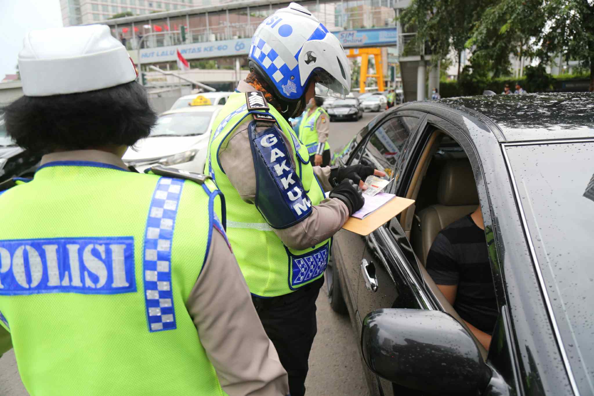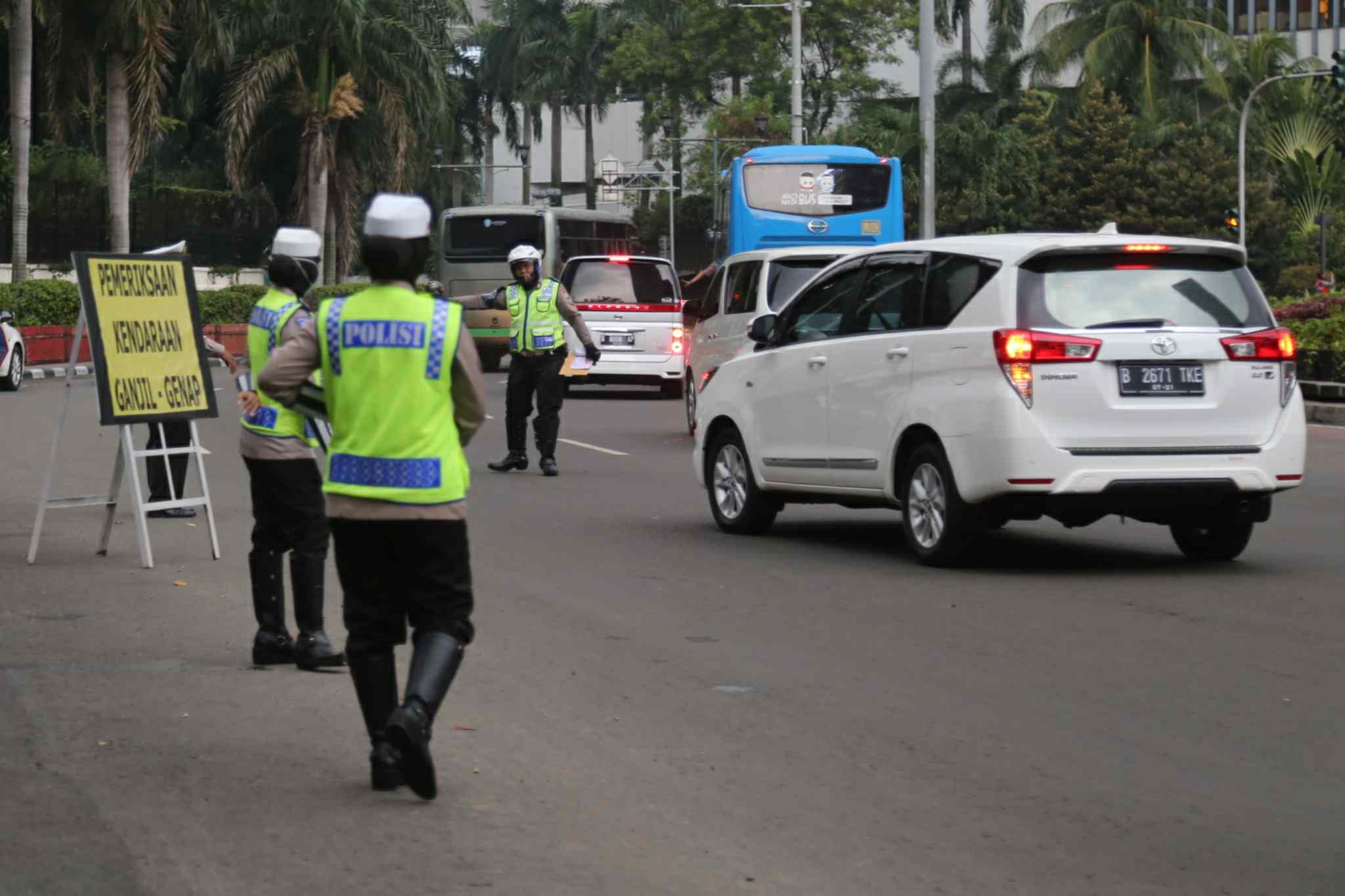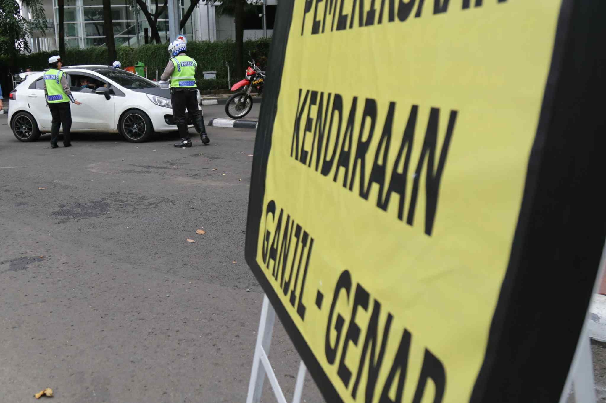 Polisi memeriksa plat nomor mobil di kawasan pembatasan lalu lintas ganjil-genap di sekitar Bundaran Hotel Indonesia, Jakarta, Selasa (30/8). Aturan sistem pembatasan lalu lintas ganjil-genap di sejumlah ruas jalan protokol Jakarta mulai diberlakukan terhitung sejak Selasa (30/8), dengan sanksi tilang bagi pengendara mobil yang melanggar. AKTUAL/TINO OKTAVIANO