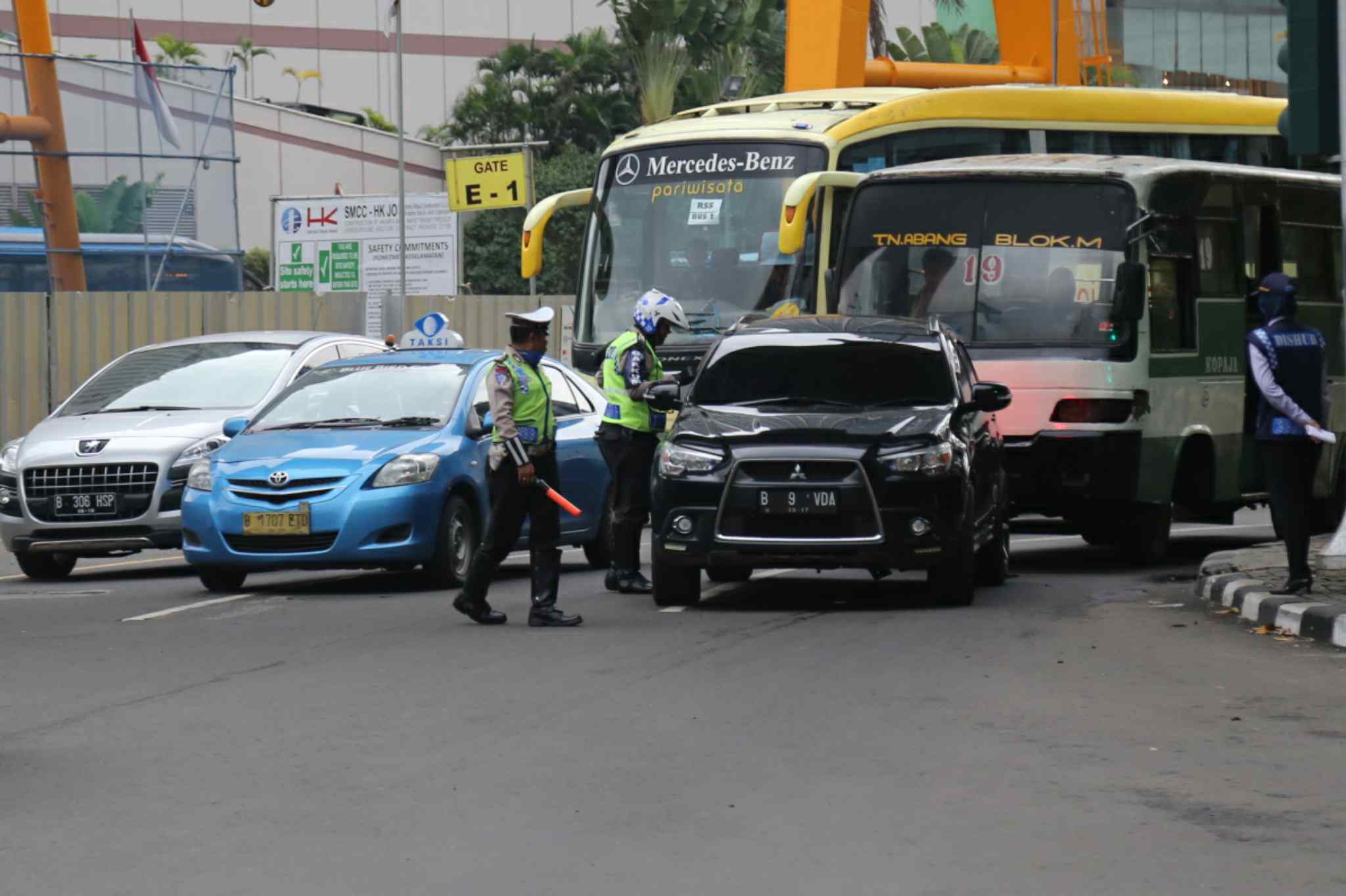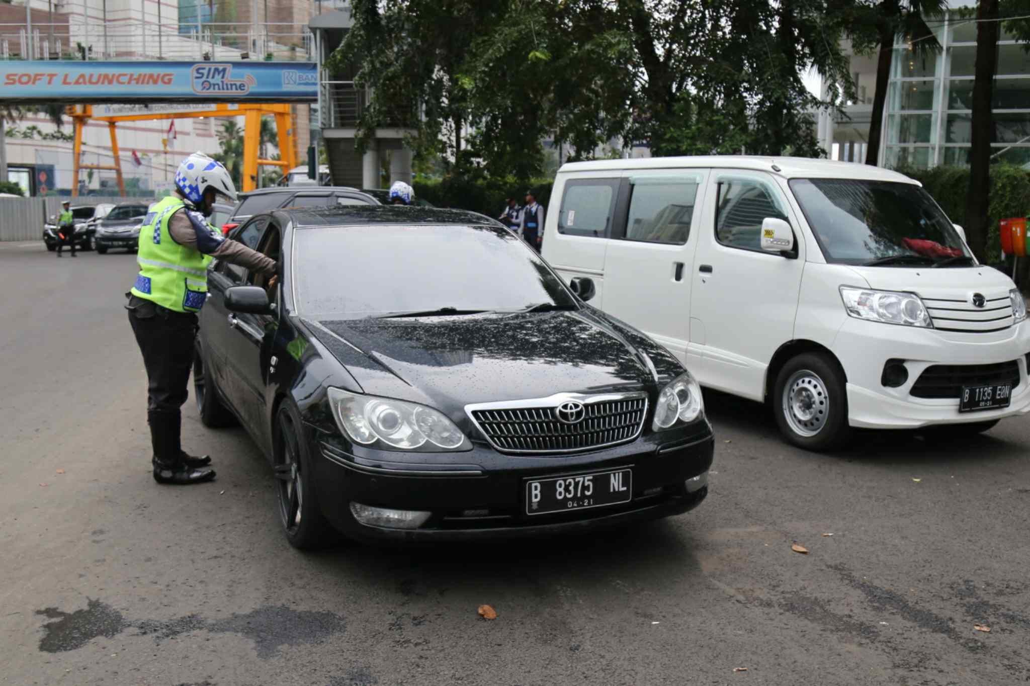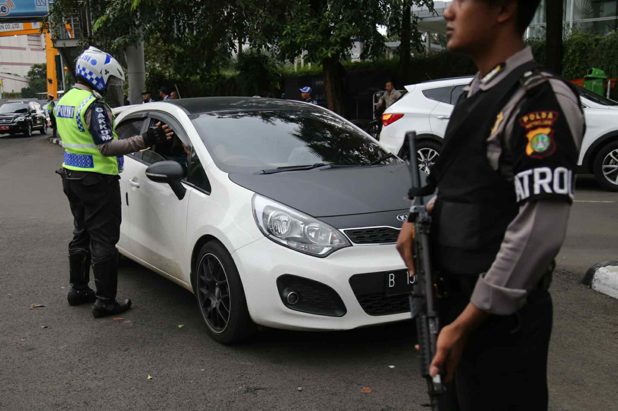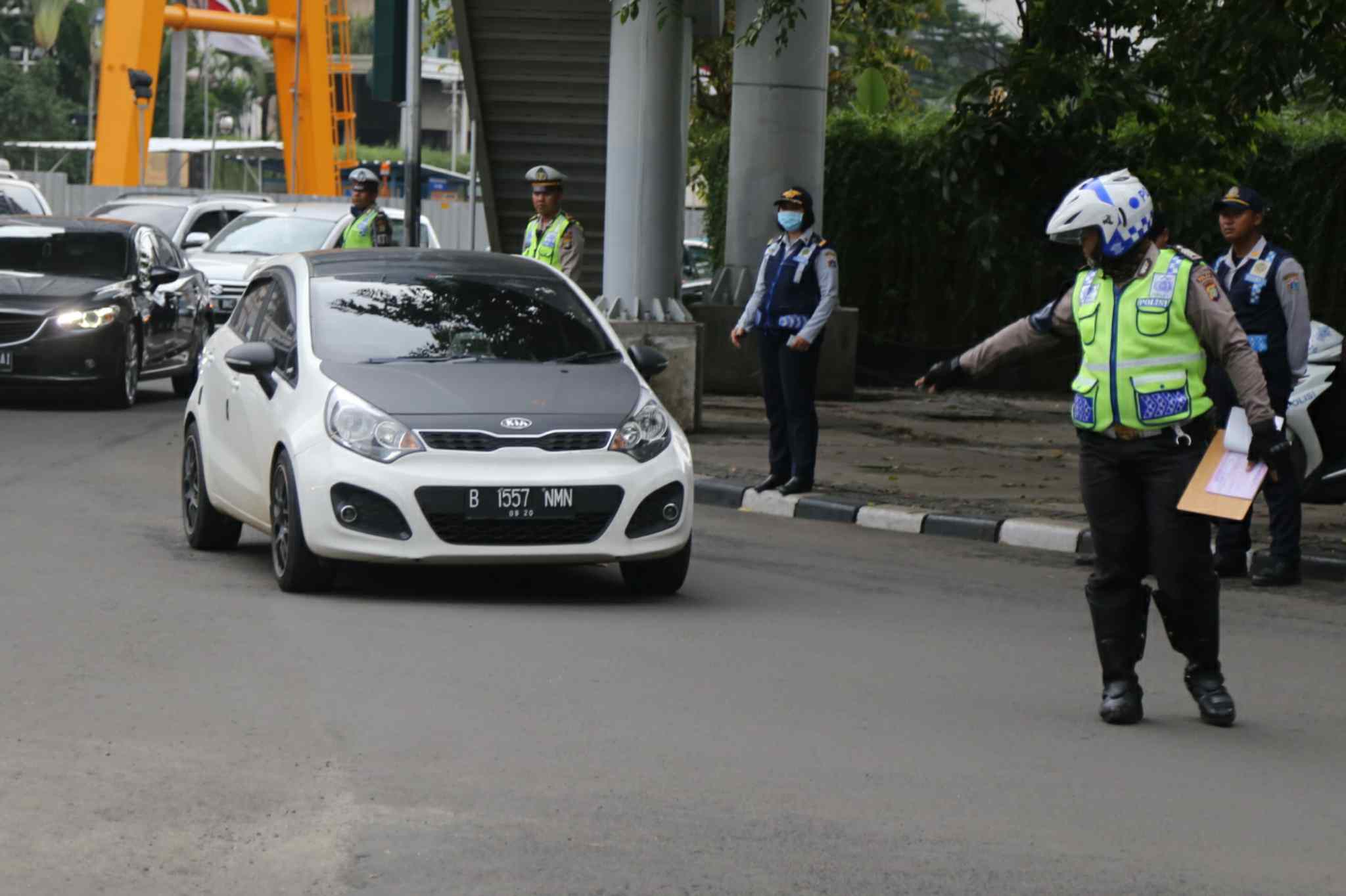 Polisi memeriksa plat nomor mobil di kawasan pembatasan lalu lintas ganjil-genap di sekitar Bundaran Hotel Indonesia, Jakarta, Selasa (30/8). Aturan sistem pembatasan lalu lintas ganjil-genap di sejumlah ruas jalan protokol Jakarta mulai diberlakukan terhitung sejak Selasa (30/8), dengan sanksi tilang bagi pengendara mobil yang melanggar. AKTUAL/TINO OKTAVIANO