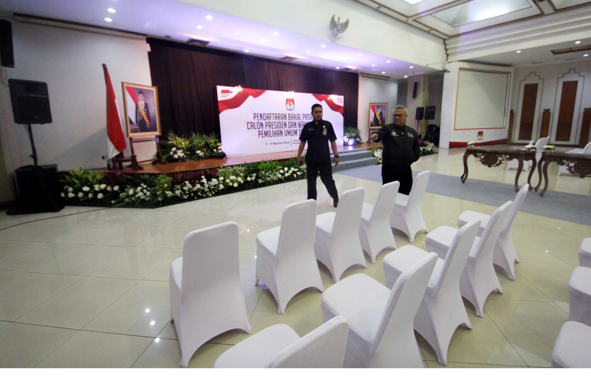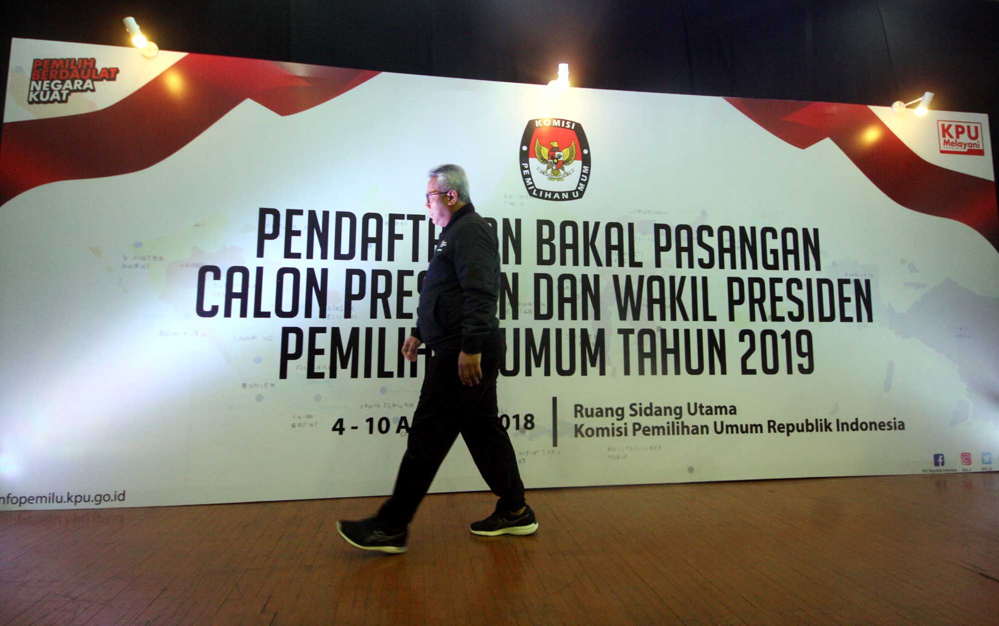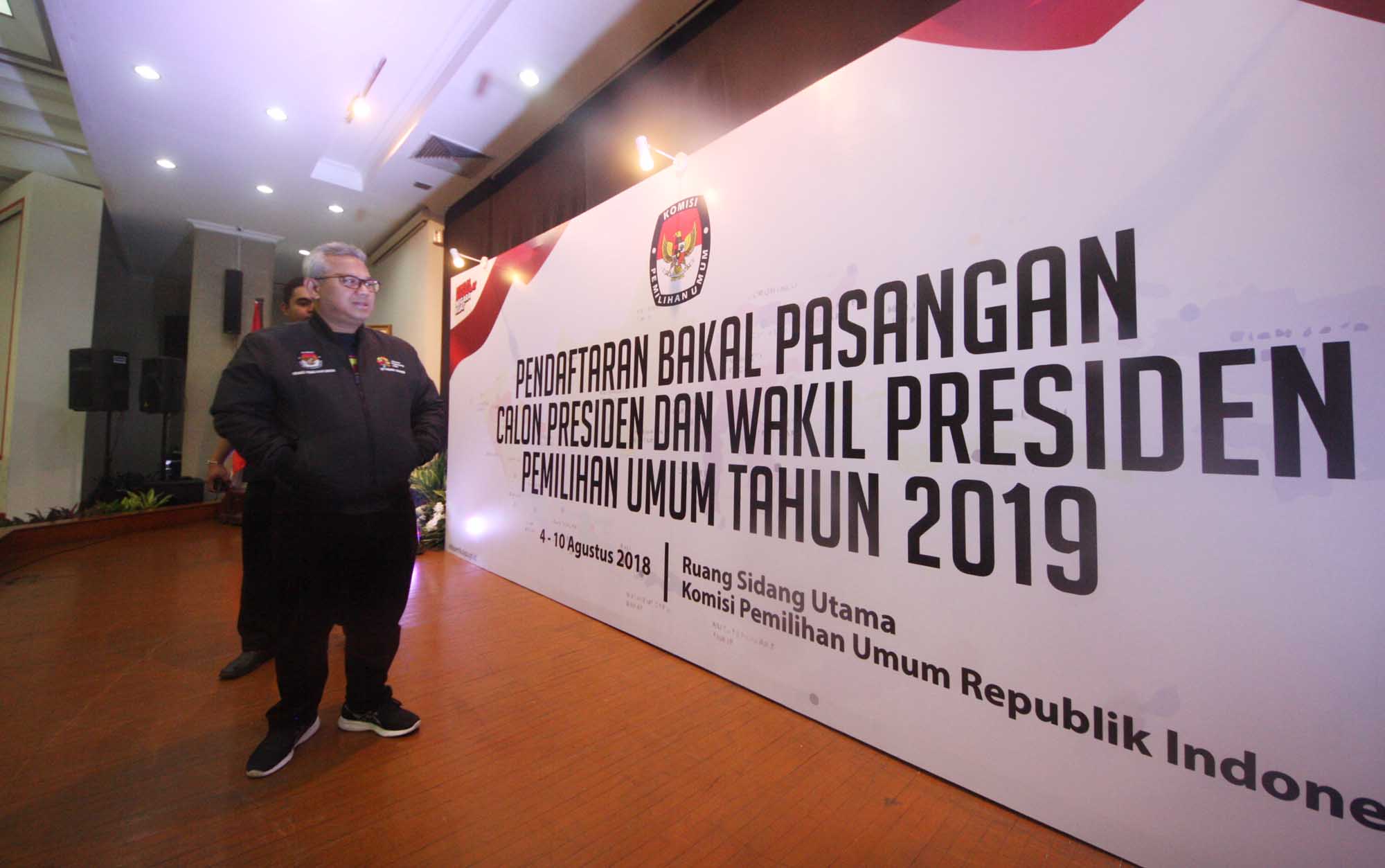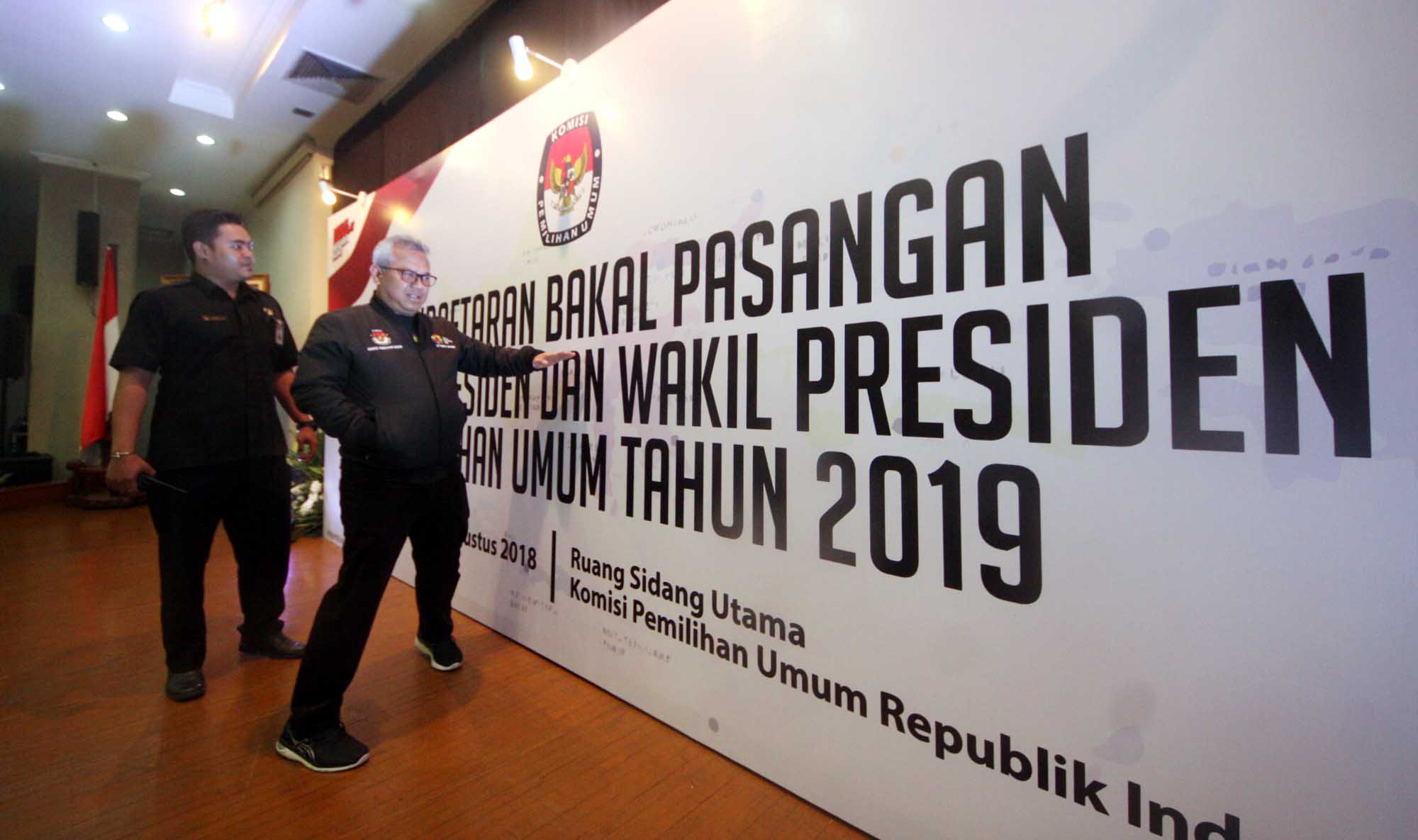 Ketua KPU Arif Budiman meninjau hari pertama pendaftaran bakal pasangan calon presiden dan wakil presiden pada Pemilu Presiden 2019 di Kantor KPU, Jakarta, Sabtu (4/8). Hari pertama pendaftaran capres dan cawapres pemilu presiden 2019 masih sepi. Pendaftaran berlangsung dari tanggal 4 hingga 10 Agustus 2018 mendatang. AKTUAL/Tino Oktaviano