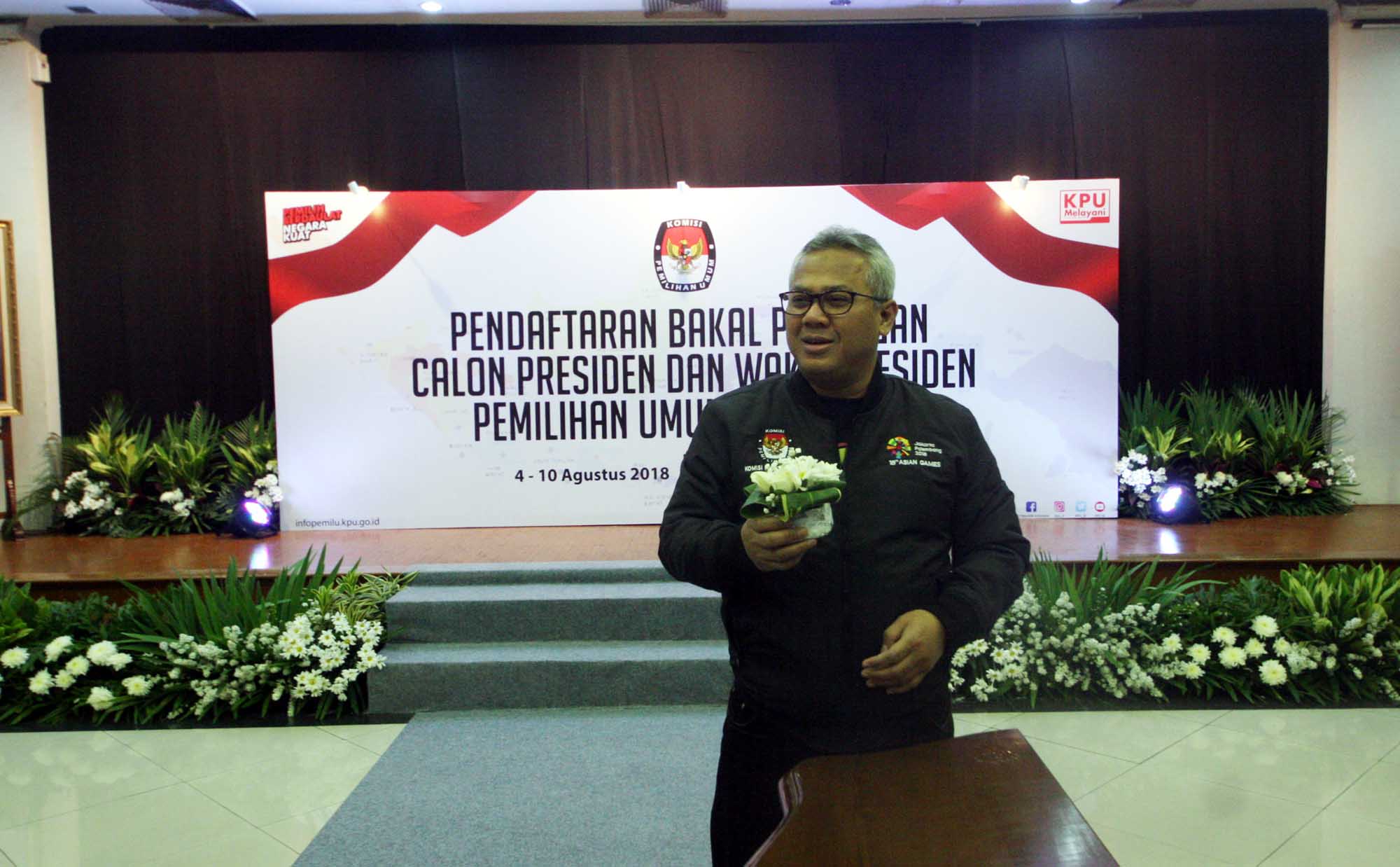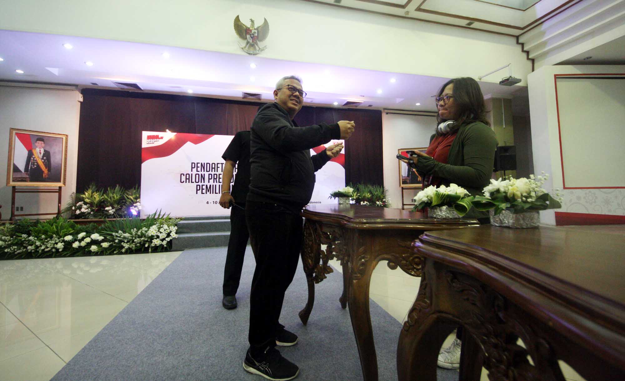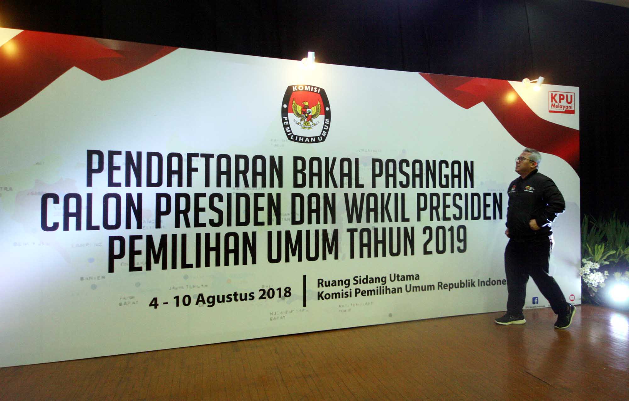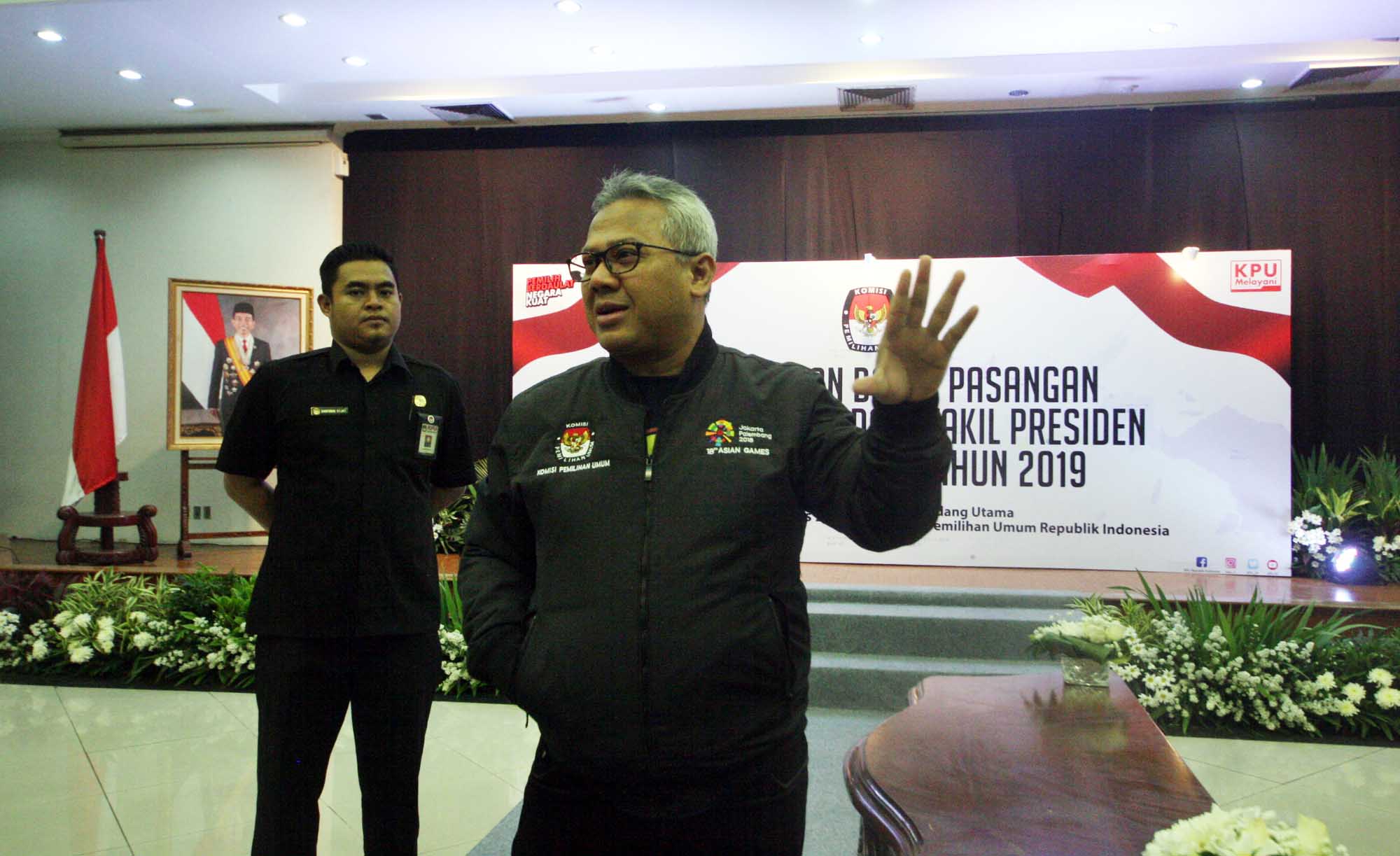 Ketua KPU Arif Budiman meninjau hari pertama pendaftaran bakal pasangan calon presiden dan wakil presiden pada Pemilu Presiden 2019 di Kantor KPU, Jakarta, Sabtu (4/8). Hari pertama pendaftaran capres dan cawapres pemilu presiden 2019 masih sepi. Pendaftaran berlangsung dari tanggal 4 hingga 10 Agustus 2018 mendatang. AKTUAL/Tino Oktaviano