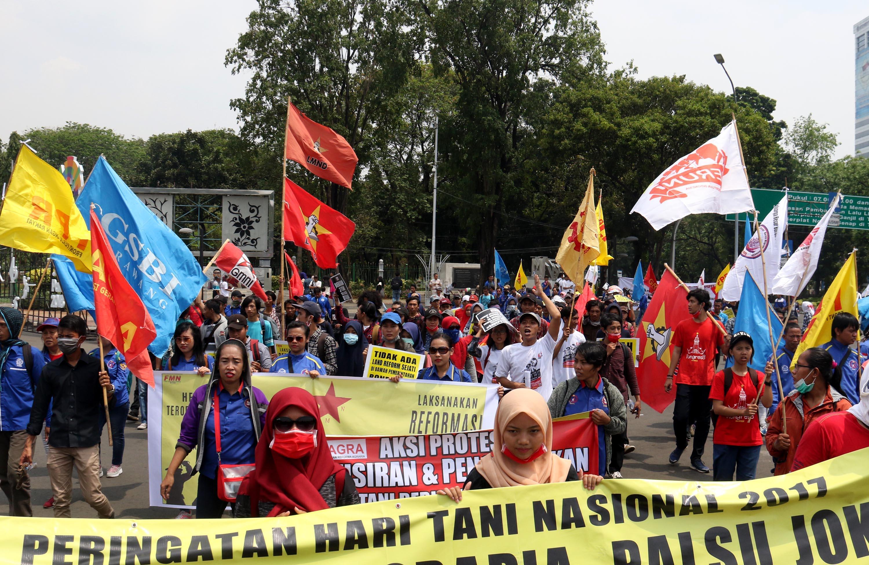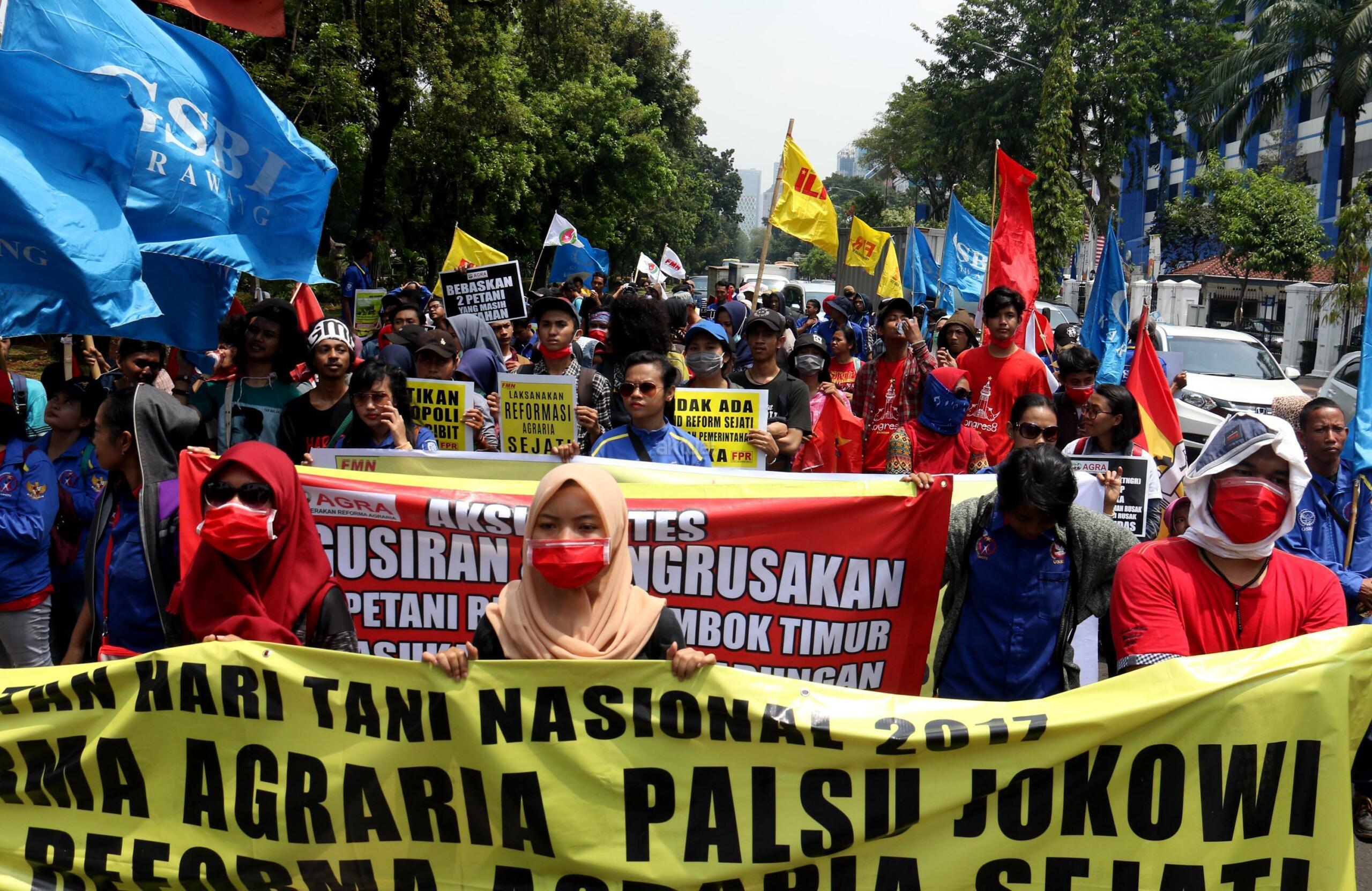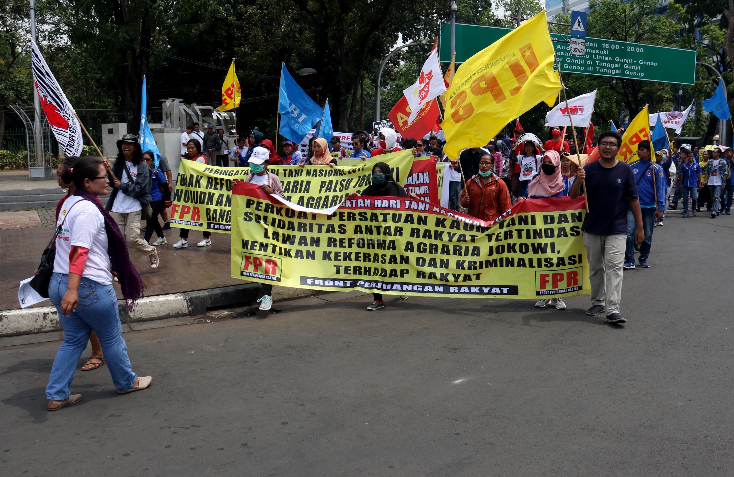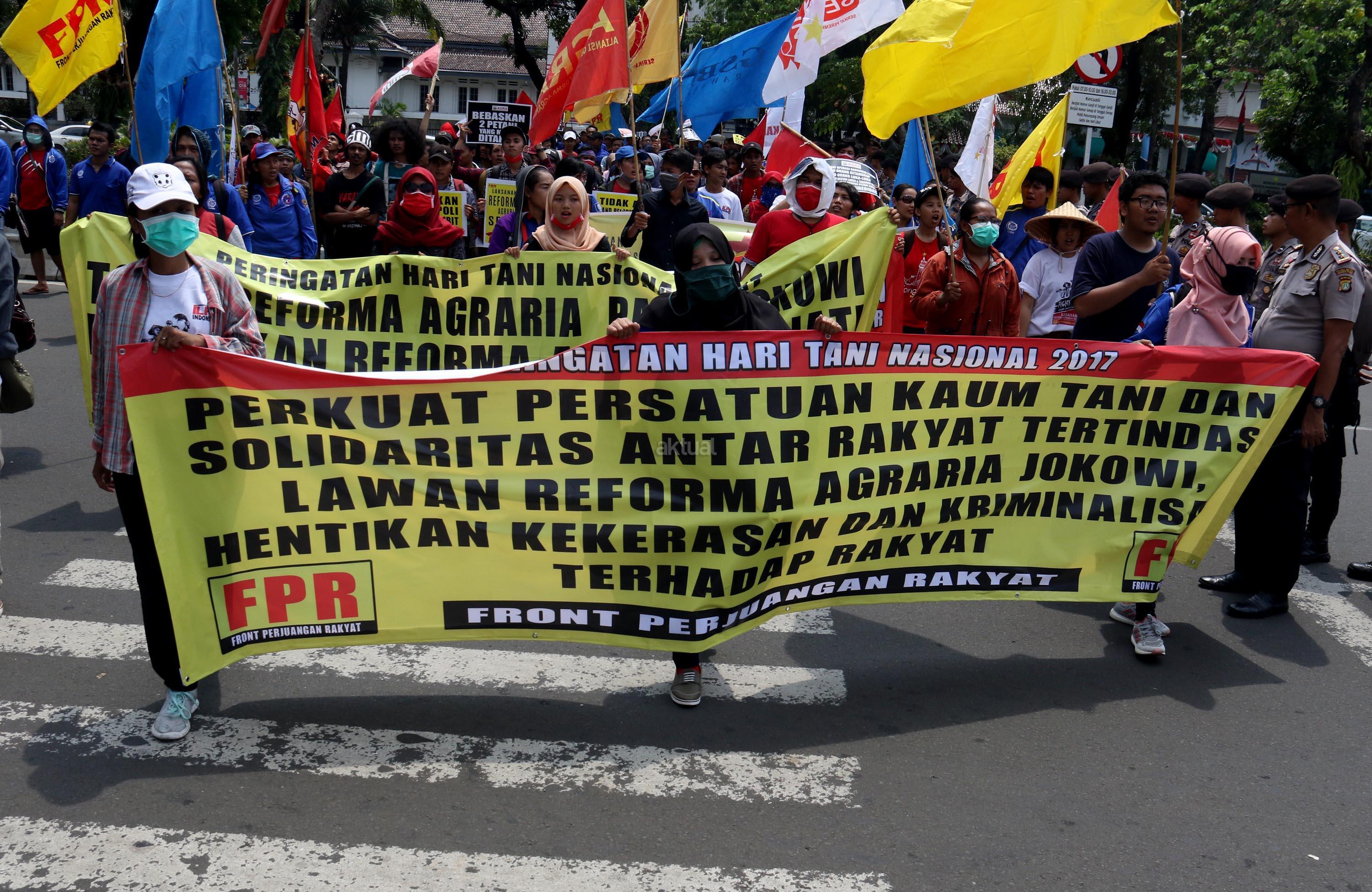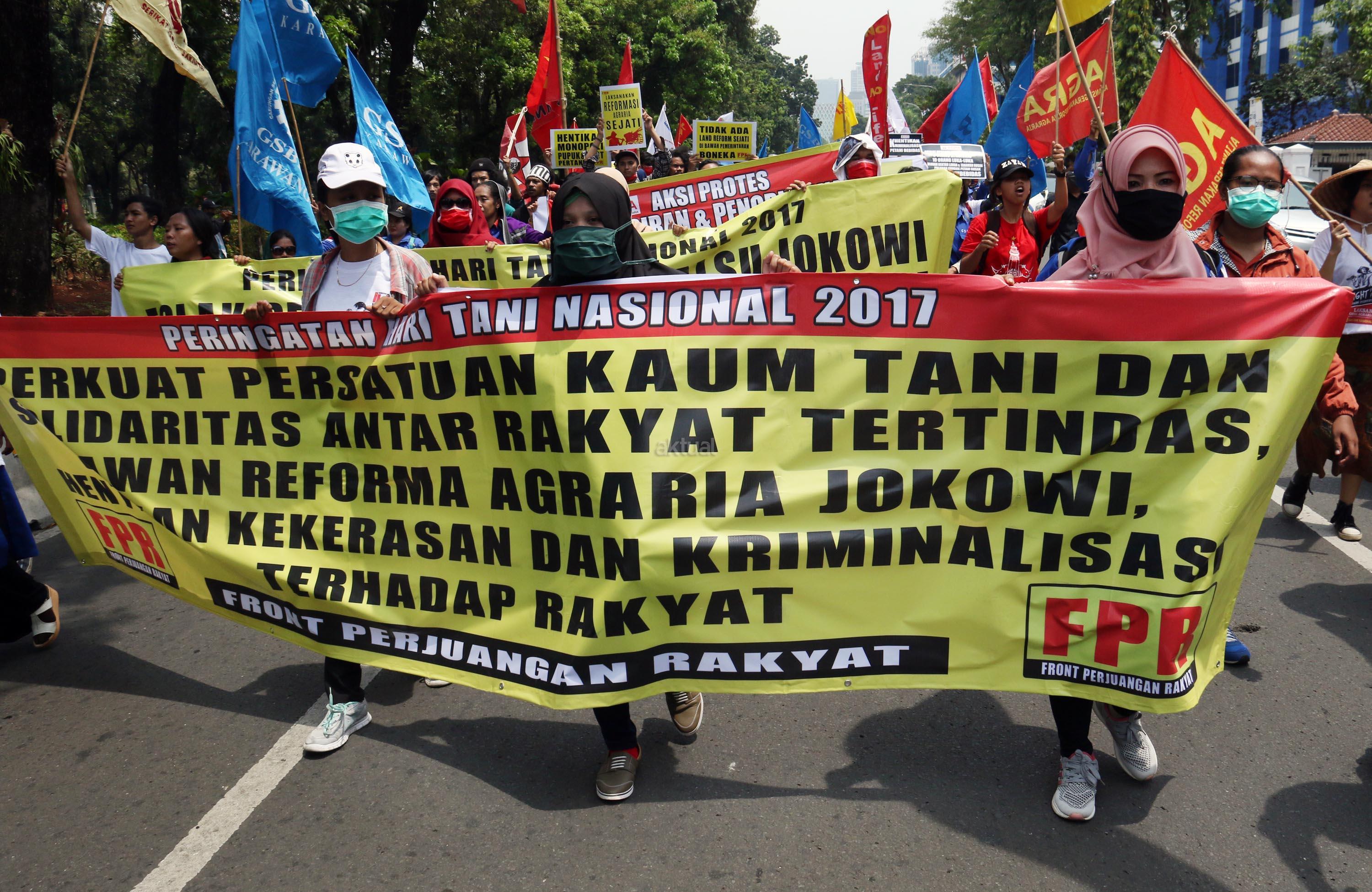 Ratusan massa dari berbagai organisasi yang tergabung dalam Front Perjuangan Rakyat (FPR) melakukan aksi di depan Istana Merdeka, Jakarta, Senin (25/9/2017). Dalam aksinya FPR untuk memperingati hari Tani dan menolak Reforma Agraria Palsu Jokowi. AKTUAL/Munzir