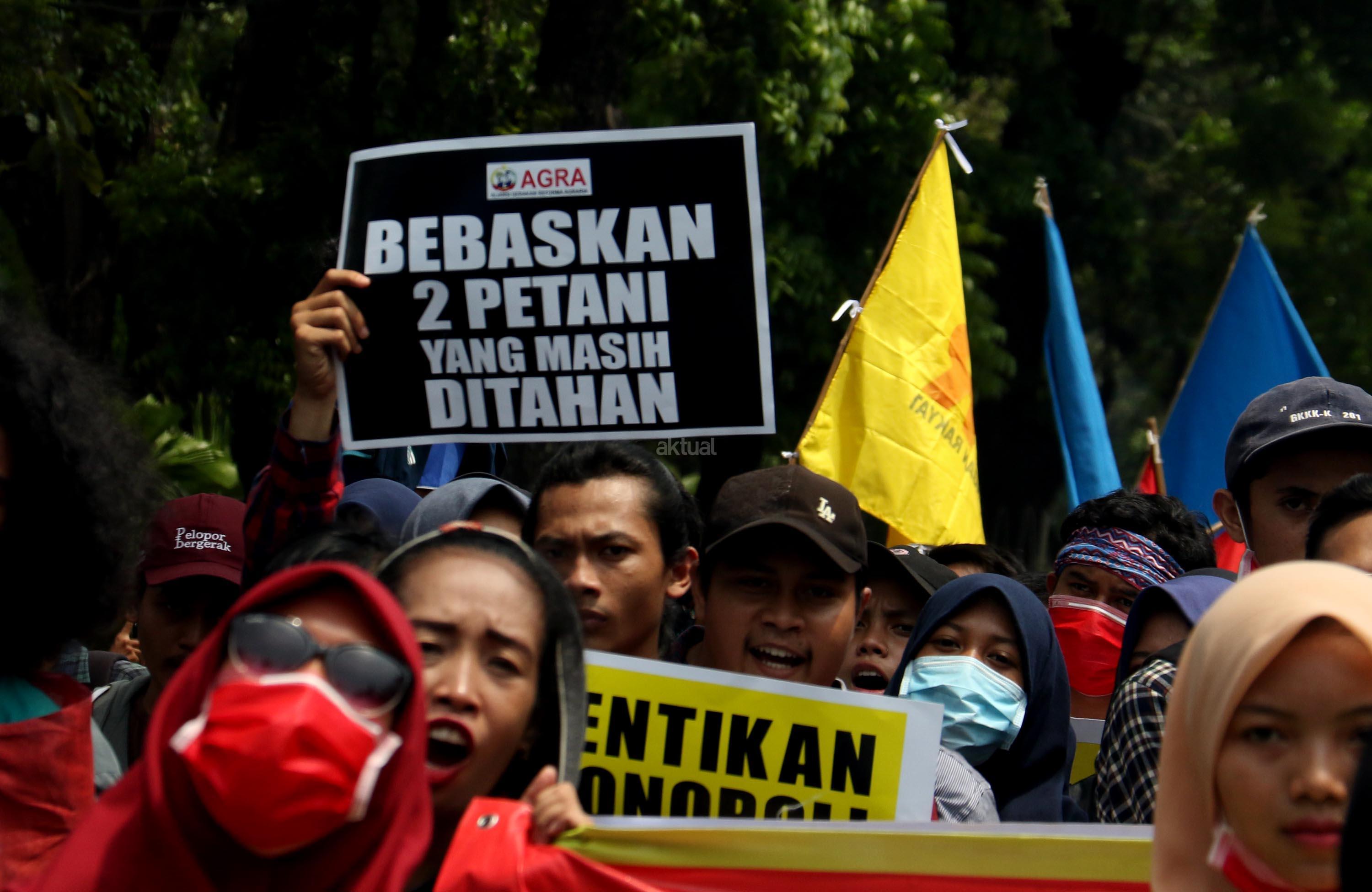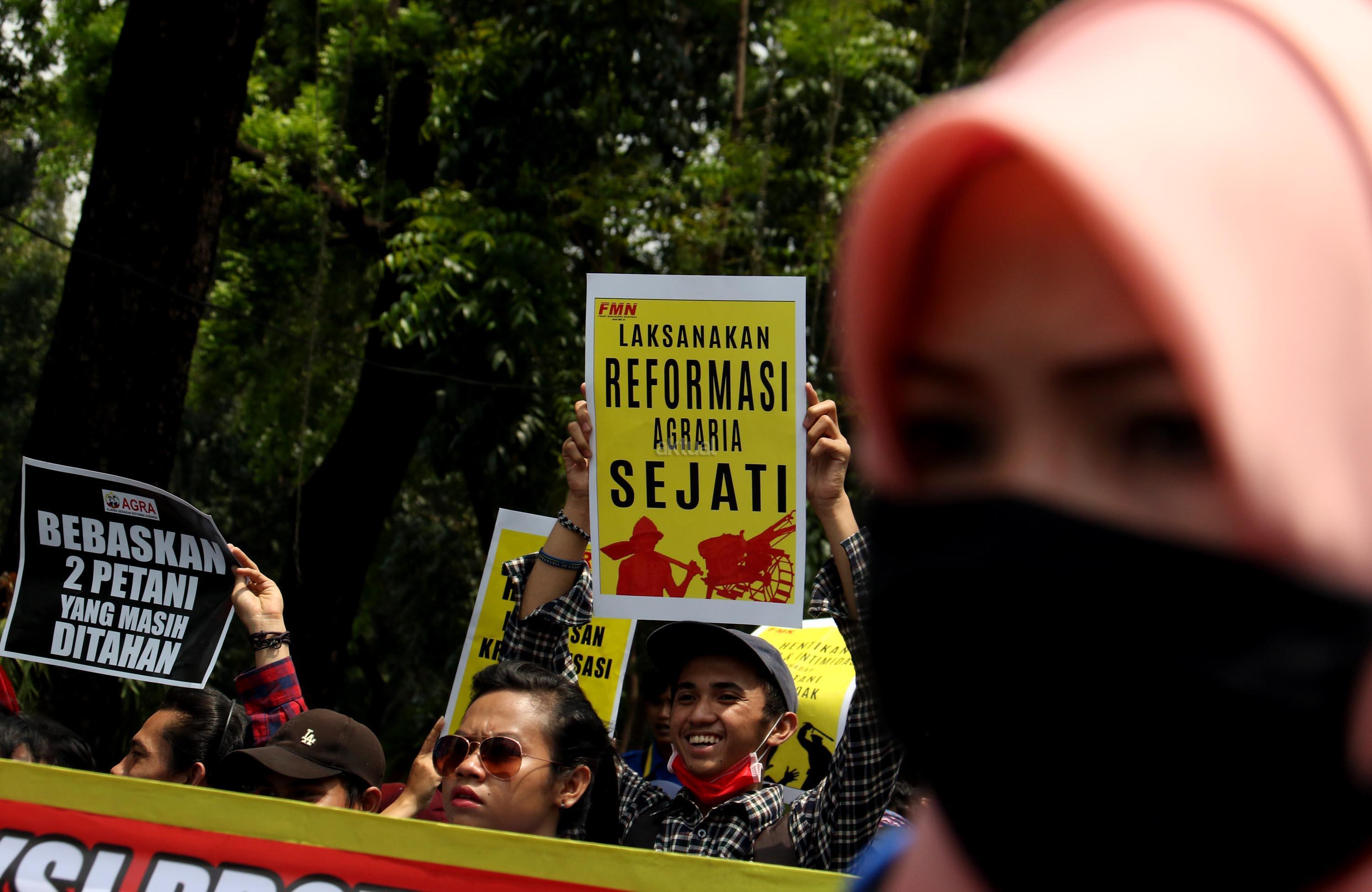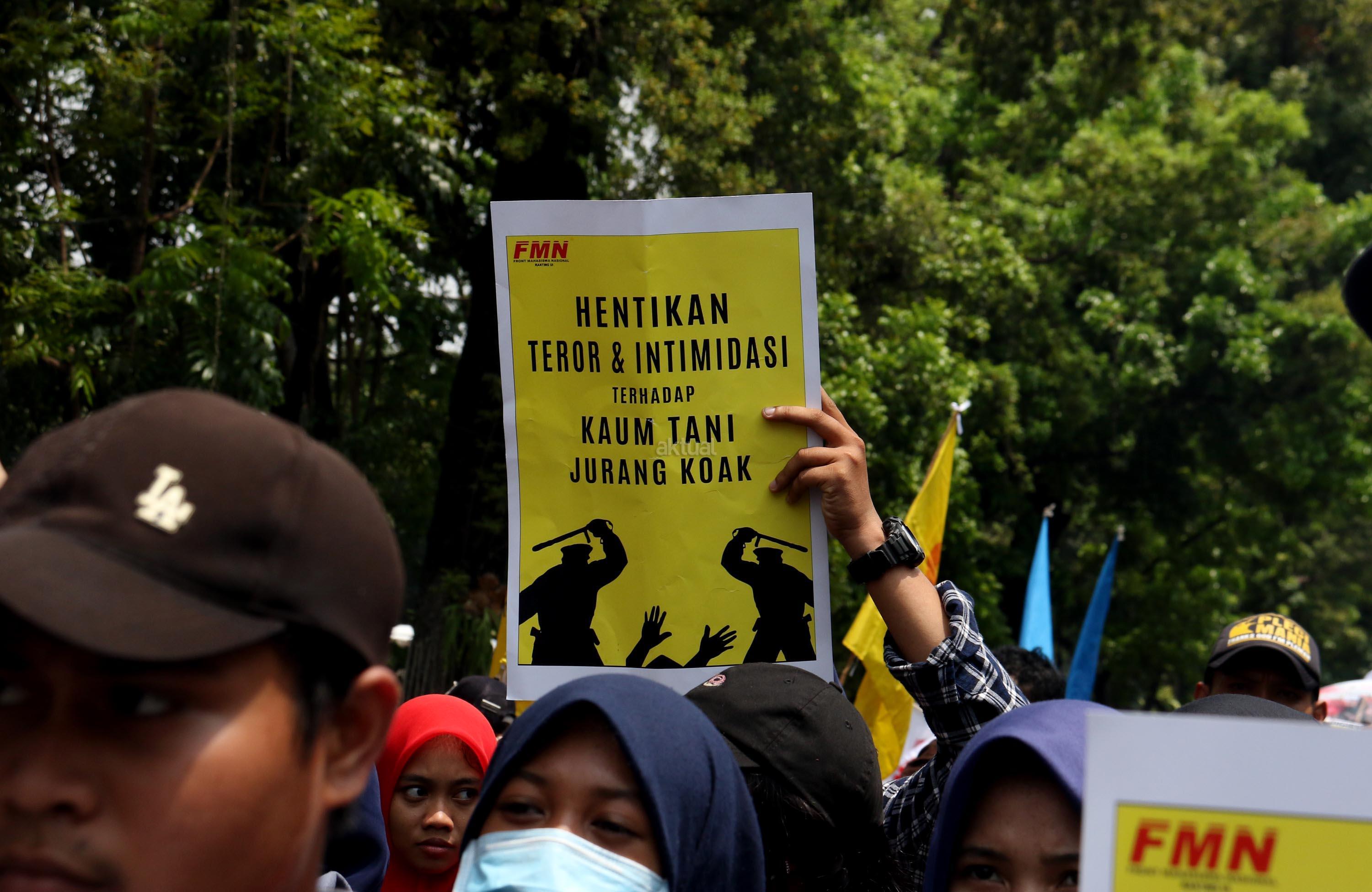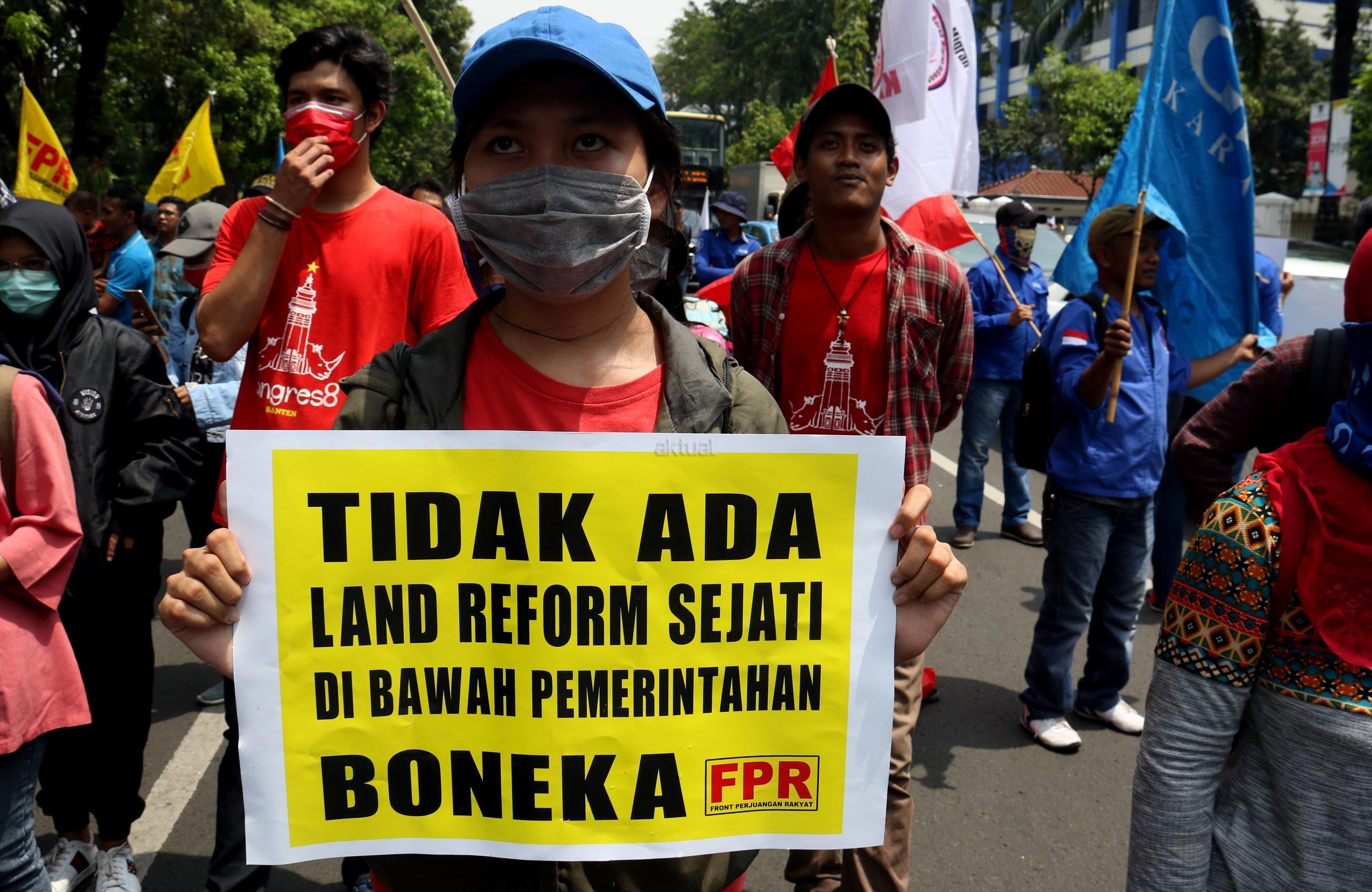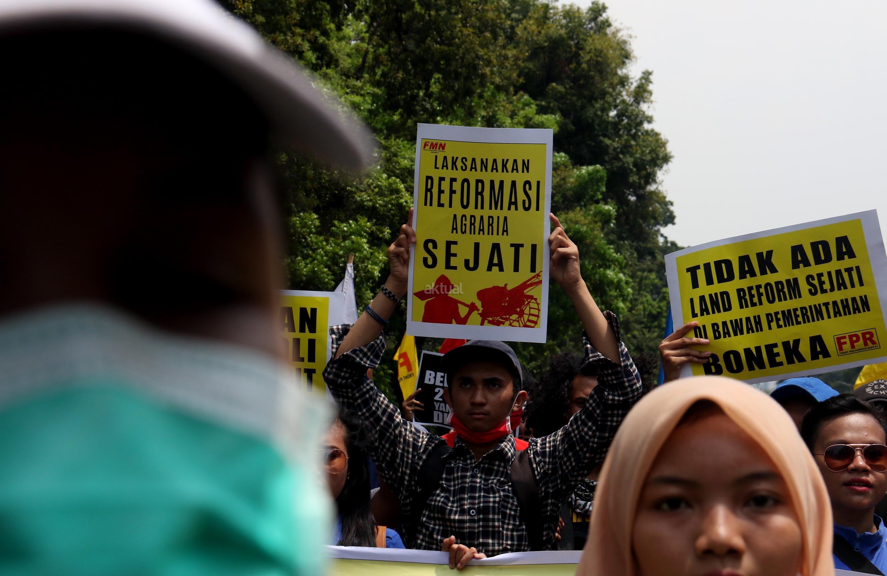 Ratusan massa dari berbagai organisasi yang tergabung dalam Front Perjuangan Rakyat (FPR) melakukan aksi di depan Istana Merdeka, Jakarta, Senin (25/9/2017). Dalam aksinya FPR untuk memperingati hari Tani dan menolak Reforma Agraria Palsu Jokowi. AKTUAL/Munzir