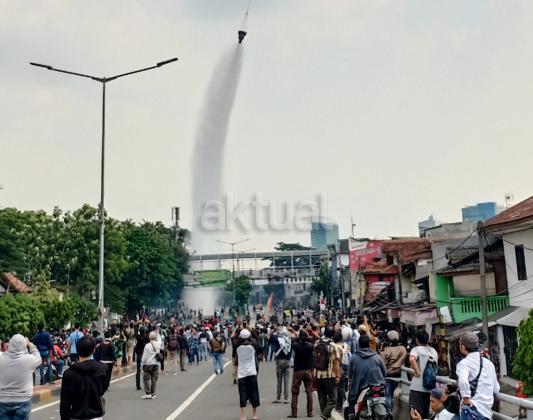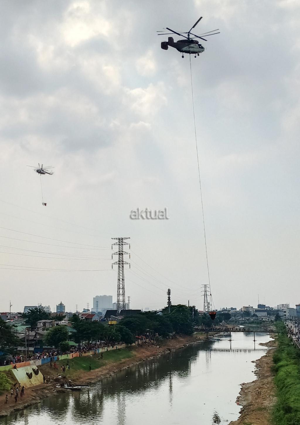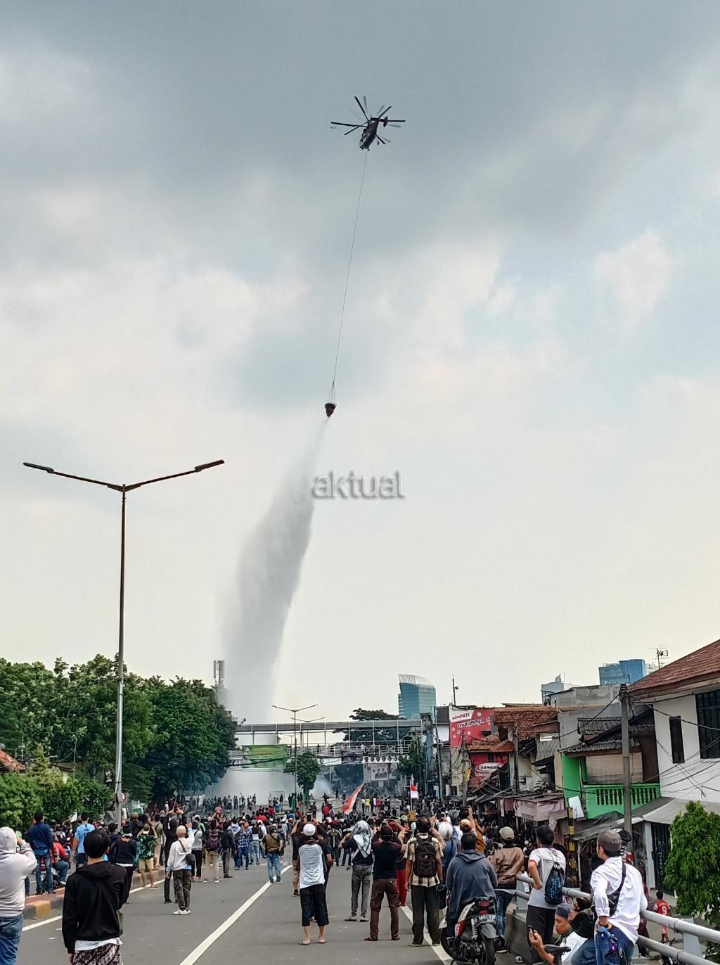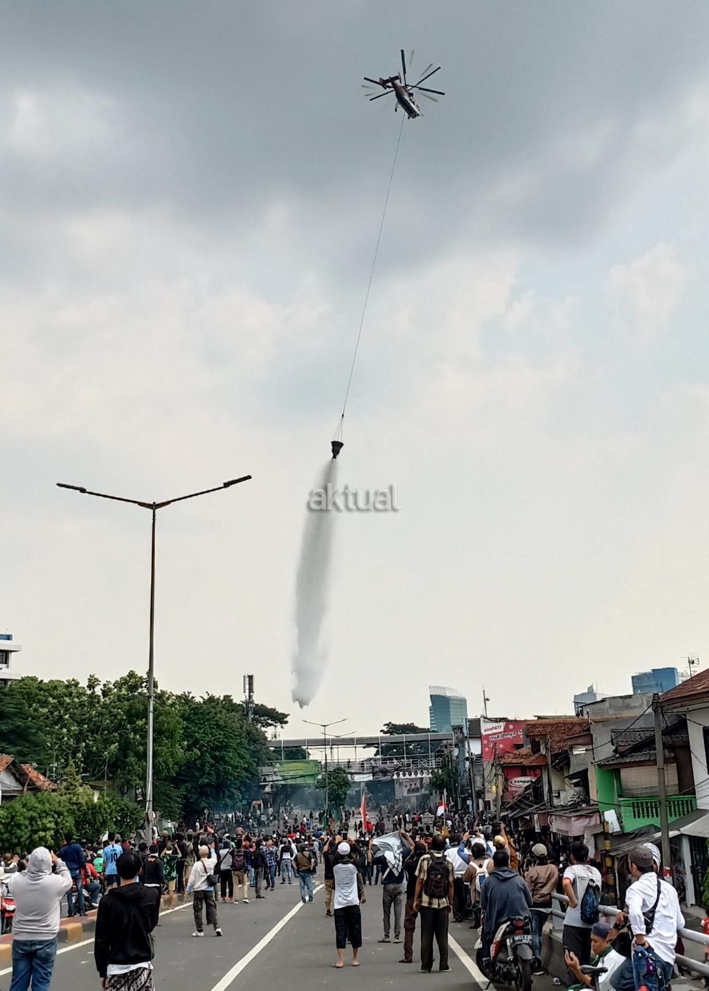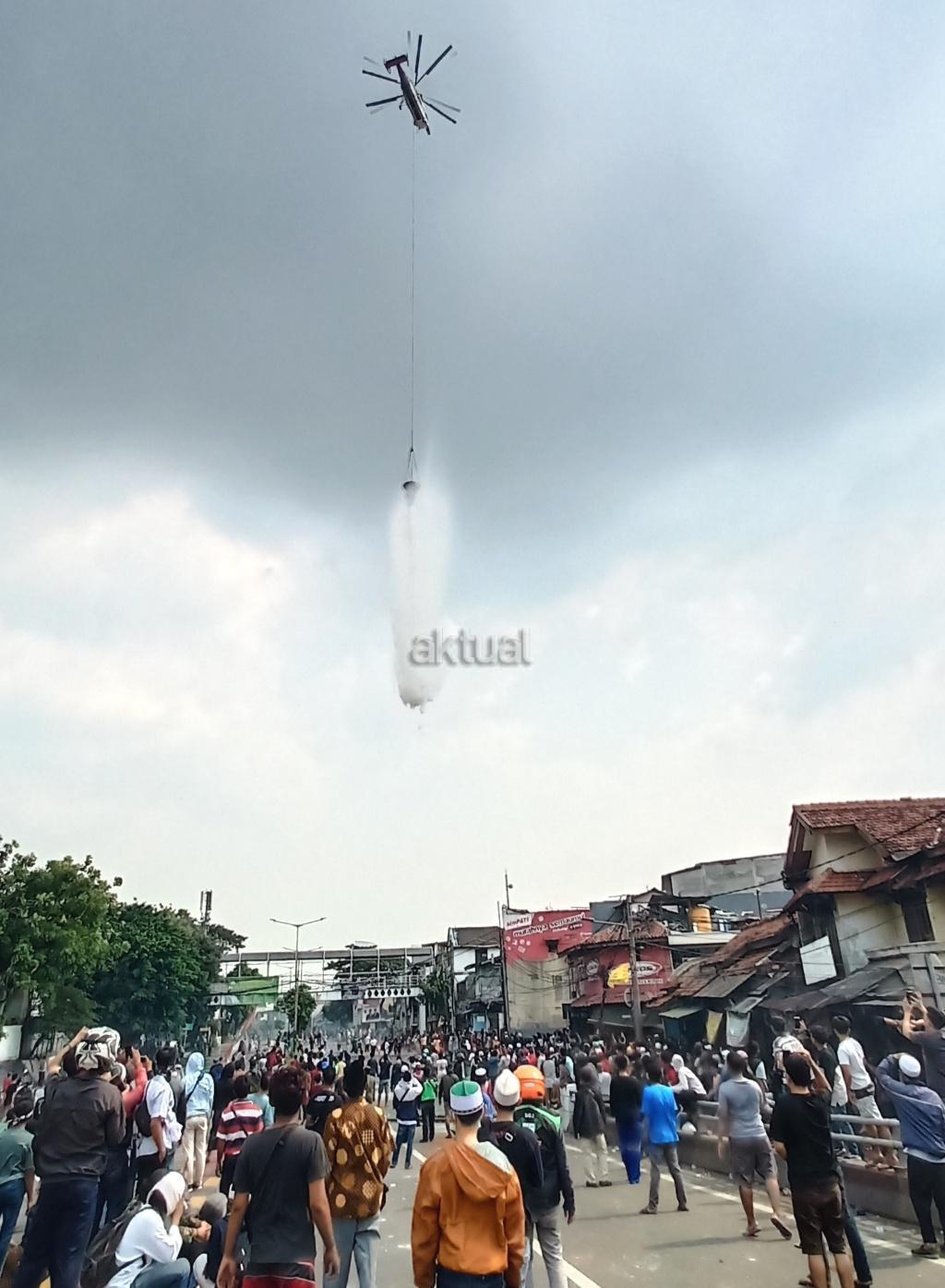 Petugas keamanan dengan menggunakan heli berusaha memadamkan api di kawasan, KS Tubun, Jakarta, Rabu (22/5). Relawan dan pendukung capres Prabowo melakukan aksi protes terkait hasil pemilu presiden 2019. AKTUAL/Tino Oktaviano