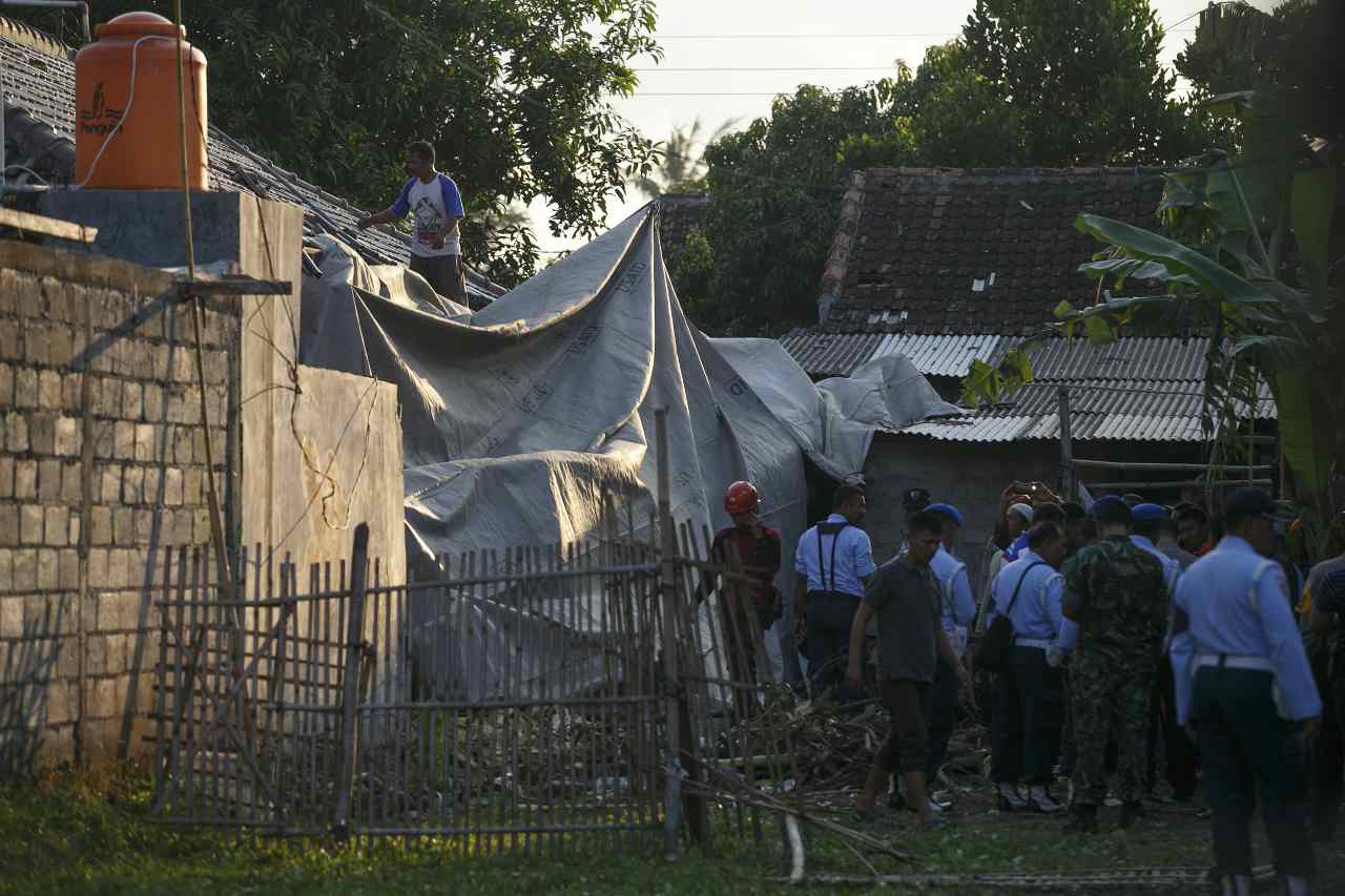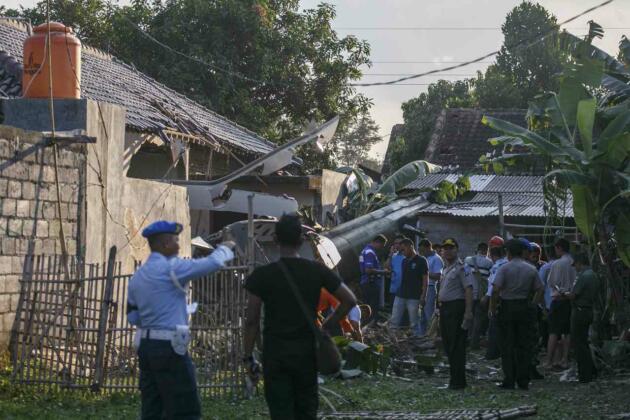 Petugas melakukan evakuasi Helikopter jenis Bell 2015 yang jatuh di Dusun Kowang, Tamanmartani, Kalasan, Sleman, DI Yogyakarta, Jumat (8/7). Helikopter yang jatuh dan menimpa permukiman warga tersebut mengakibatkan 3 korban meninggal dan 2 luka-luka. ANTARA FOTO/Hendra Nurdiyansyah/ama/16