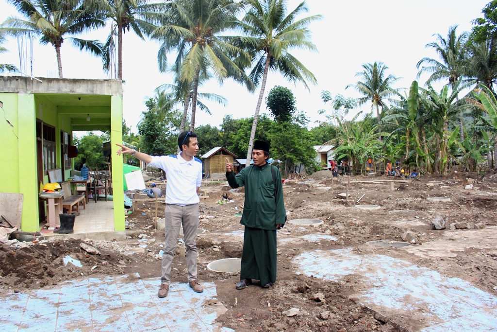 GM Corporate Secretary PT Hero Supermarket Tbk Iwan Nurdiansyah (baju putih) bersama Kepala Sekolah Madrasah Tsanawiyah Al-ittihadiyah Ustad Rosyidi, meninjau lokasi Sekolah yang rusak akibat Bencana Gempa Lombok beberapa bulan lalu di Dusun Nipah, Lombok Utara, Kamis (6/12/2018). HERO Group Peduli Lombok memberikan bantuan berupa pembangunan ruang kelas yang akan digunakan untuk aktivitas belajar mengajar di sekolah tersebut. Ini merupakan bentuk kepedulian HERO Group terhadap bencana gempa yang melanda Lombok, terutama dalam Bidang Pendidikan. Diharapkan dengan adanya 4 ruang kelas yang dibangun, akan menjadikan murid lebih fokus belajar dan mengejar ketertinggalan yang terjadi akibat bencana. AKTUAL/Dok Hero