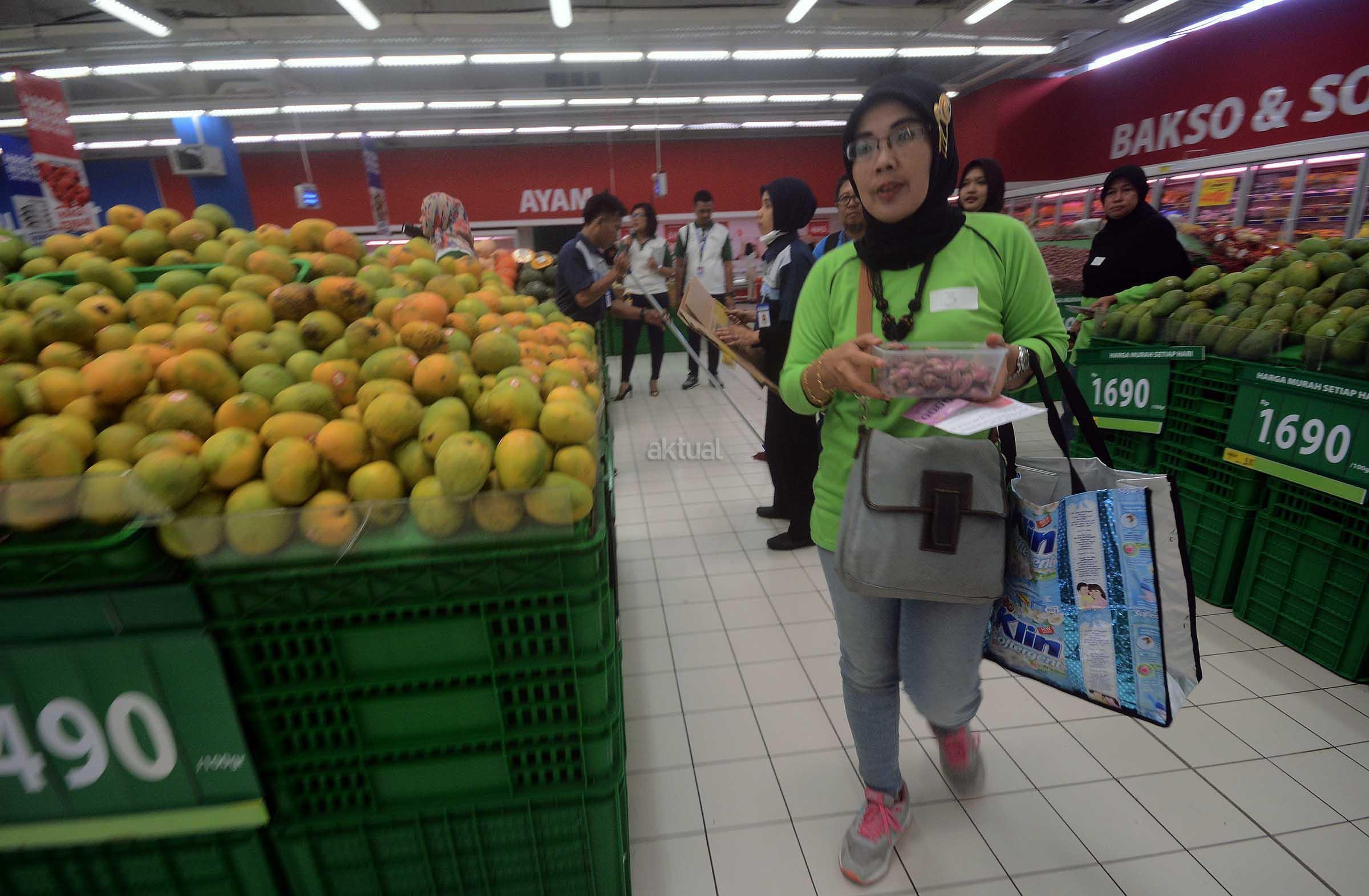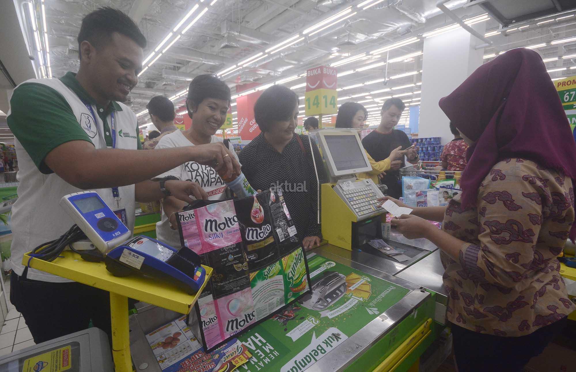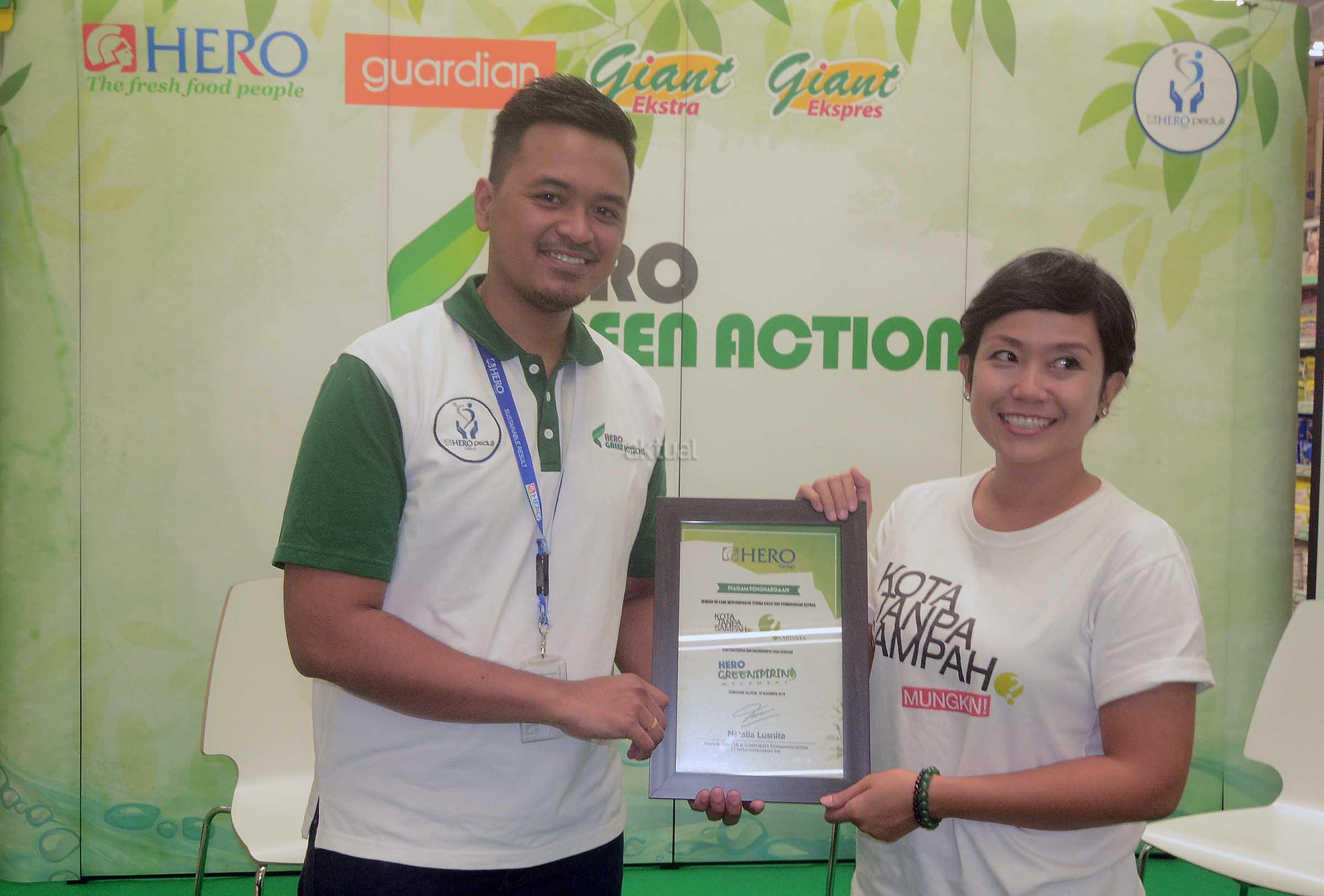 Manager Corporate Social Responsibility PT Hero Supermarket Tbk, Arya Kusumo (kedua kanan) didampingi Periset Program "Kota Tanpa Sampah", Ni Putu Dan (ketiga kanan) memberikan tas berbahan daur ulang yang dibuat oleh komunitas anak anak tuna rungu kepada pengunjung dan pelanggan Giant disela kegiatan aksi peduli lingkungan dan kampanye berbelanja tanpa kantong plastik yang bertajuk "Hero Greenspiring Movement" di Gerai Giant, CBD Bintaro, Tangerang Selatan, Banten, Sabtu (10/12). PT Hero Supermarket Tbk melalui unit bisnisnya yaitu Hero Supermarket dan Giant membagikan lebih dari 3000 tas belanja daur ulang kepada para pelanggan di 17 gerai yang terletak di wilayah Tangerang Selatan, Surabaya, Pekanbaru dan Riau. AKTUAL/Eko S Hilman